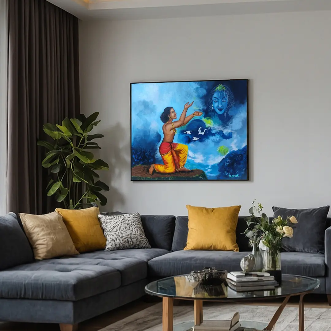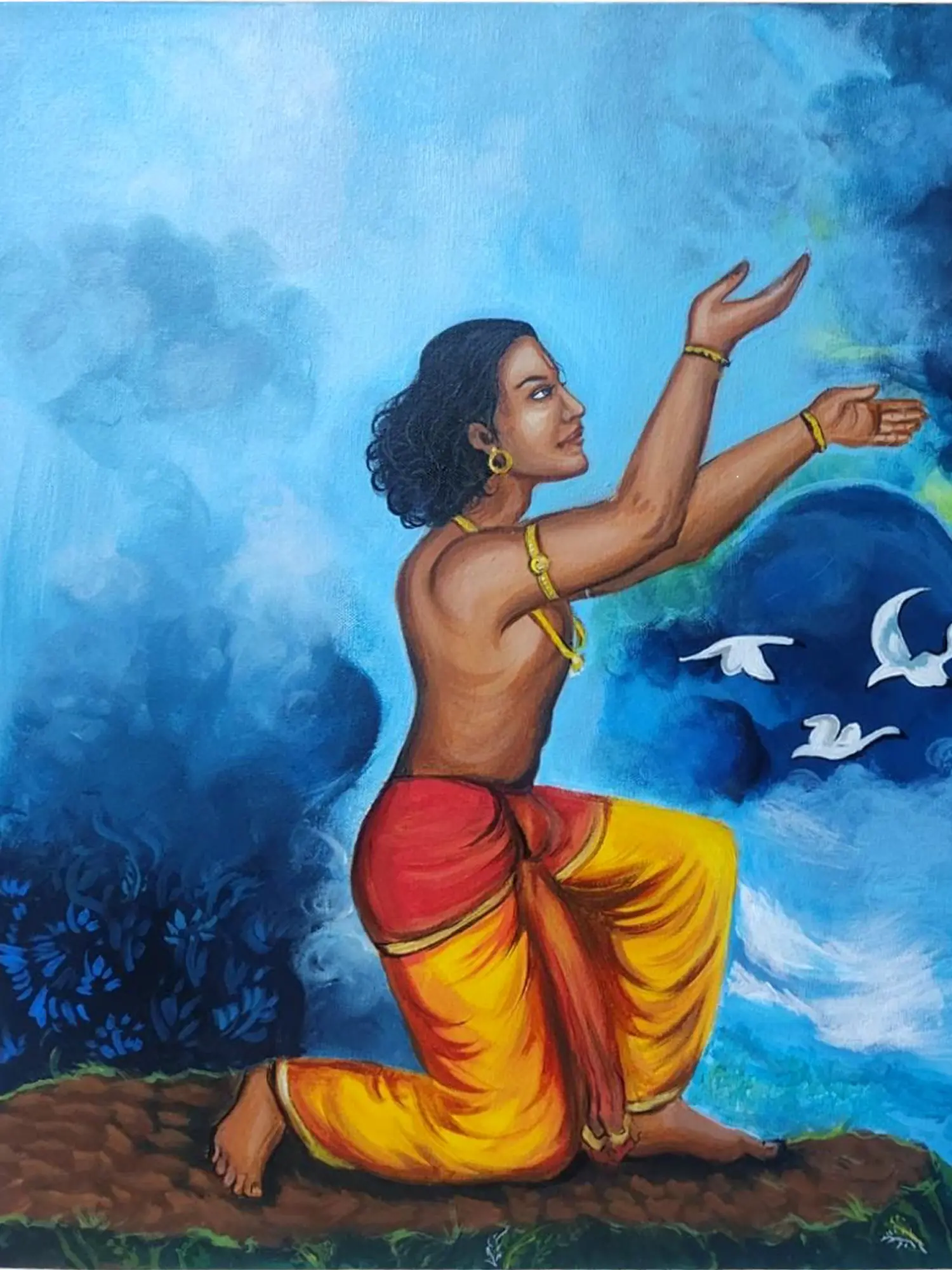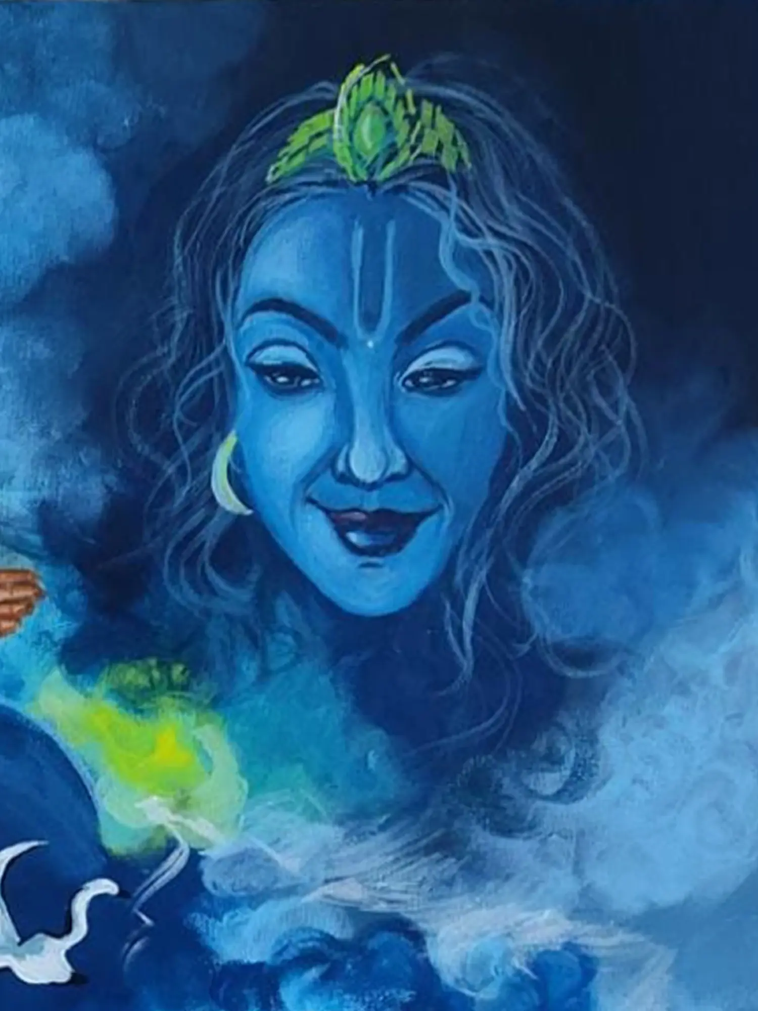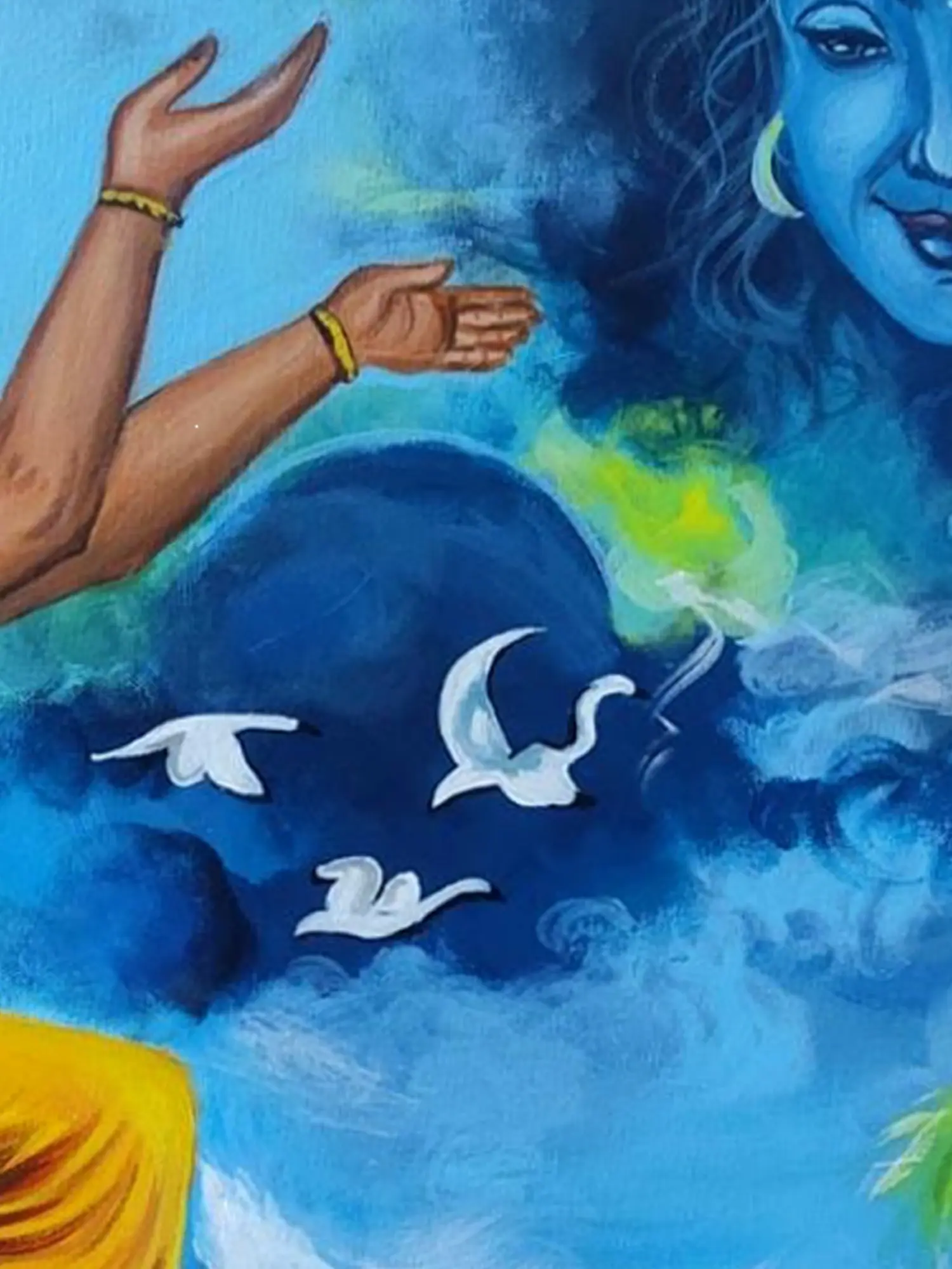 "Meghdoot Painting" - Acrylic colors on canvas evoke Meghdoot, a cloud messenger carrying whispered tales of love. As the clouds weave stories in the sky, the canvas unveils the magic of unspoken emotions. Each droplet is a vessel of sentiment, and Meghdoot mirrors the depth of human connection. The canvas whispers: like clouds that bring life to earth, your presence and words can shower joy and rejuvenation. Just as Meghdoot's tales reach hearts, let your words be a balm for weary souls, transforming gloomy days into ones painted with compassion and empathy.