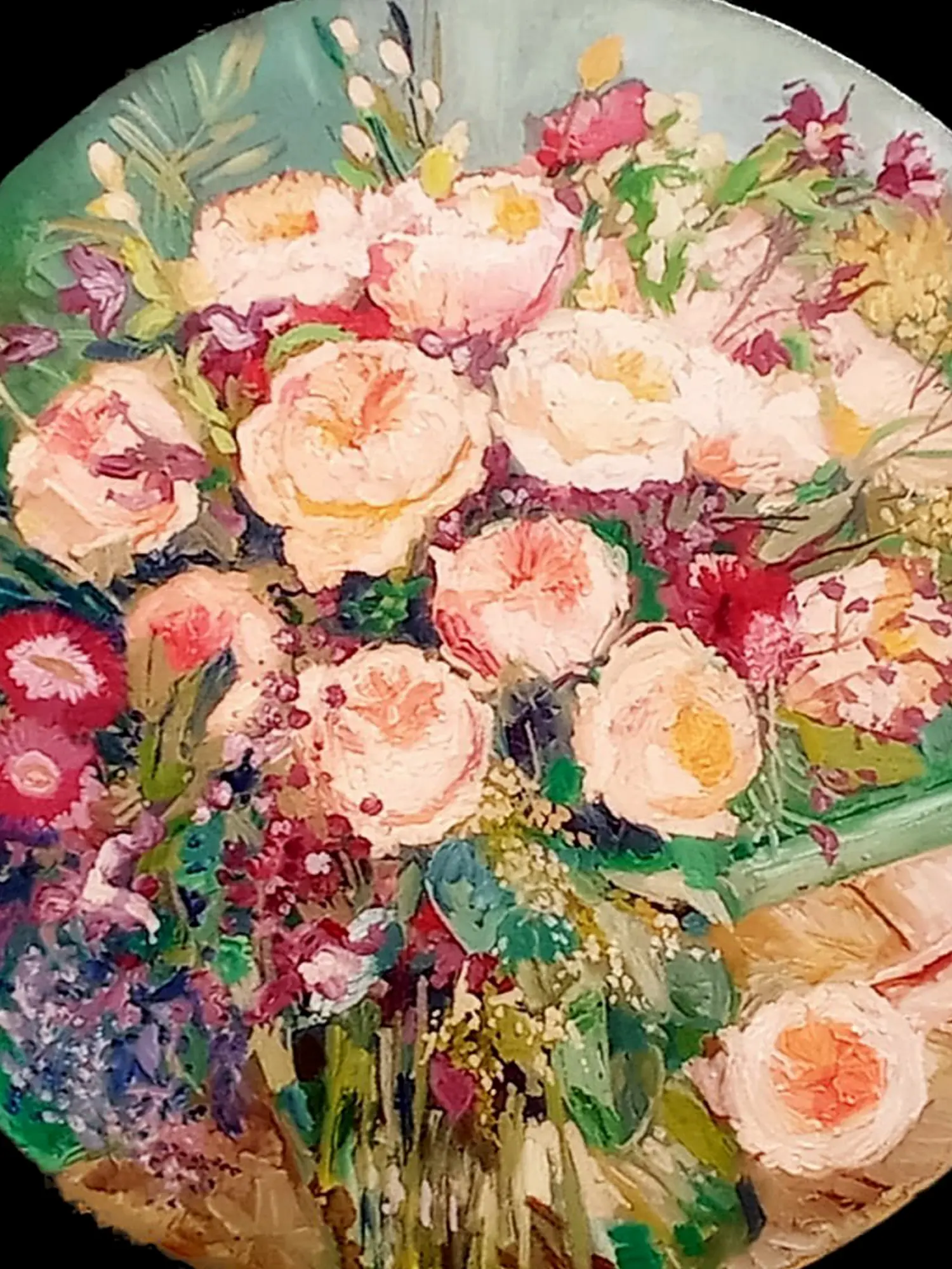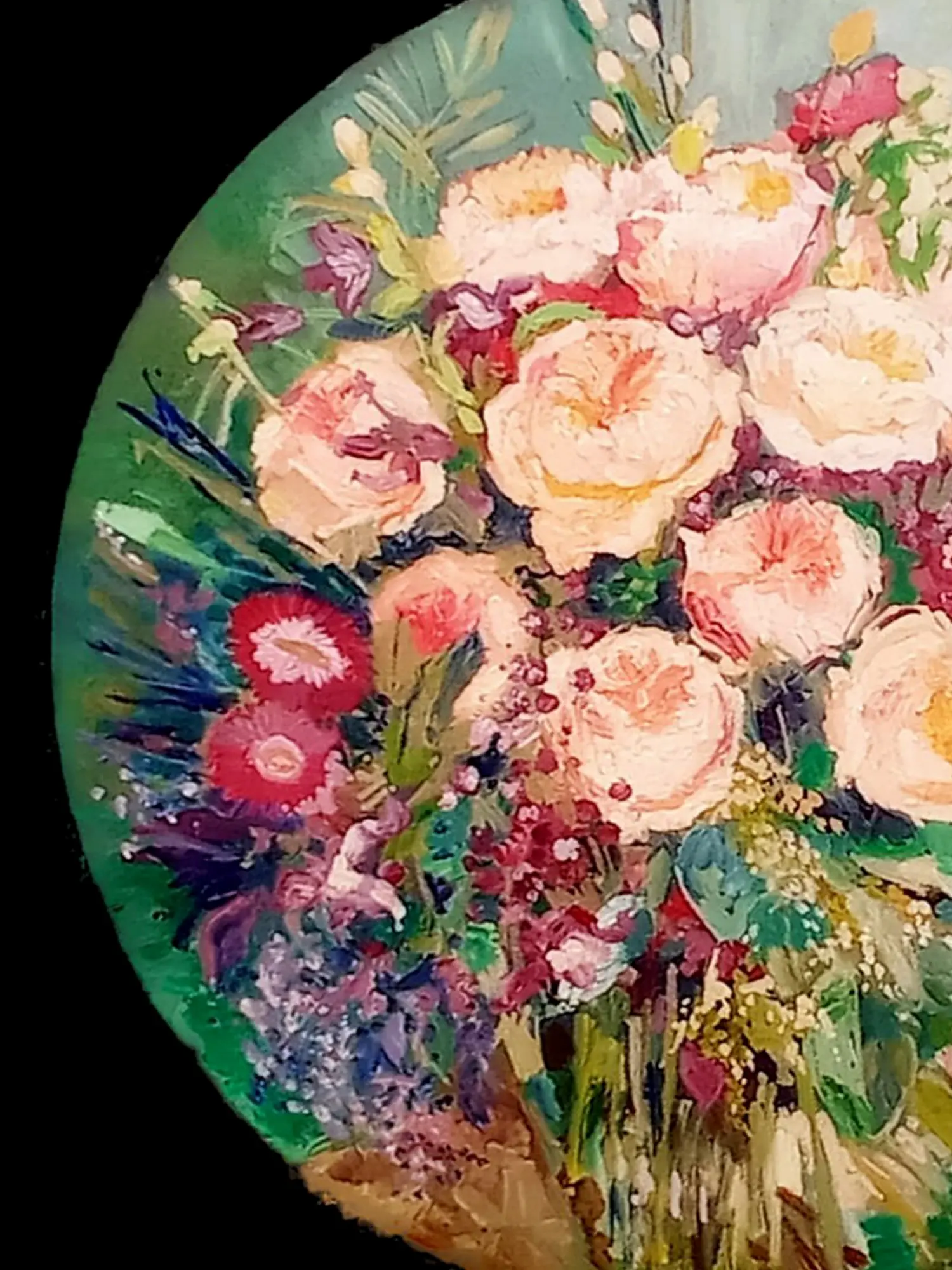 This circular masterpiece, measuring 18 inches in diameter, offers a unique and intimate viewing experience. The dynamic interplay of colors, from soft blush roses to deep emerald greens and pops of ruby red, creates a lively and harmonious composition. The impasto technique used throughout adds a tactile quality, making the blossoms seem to leap from the canvas.