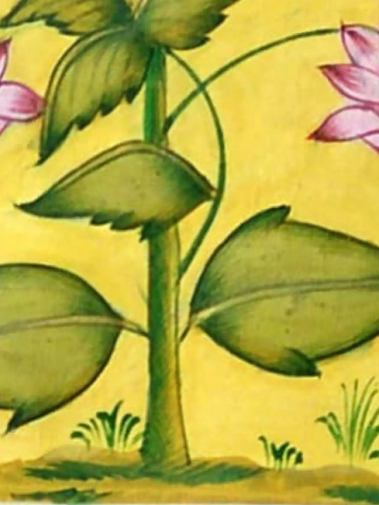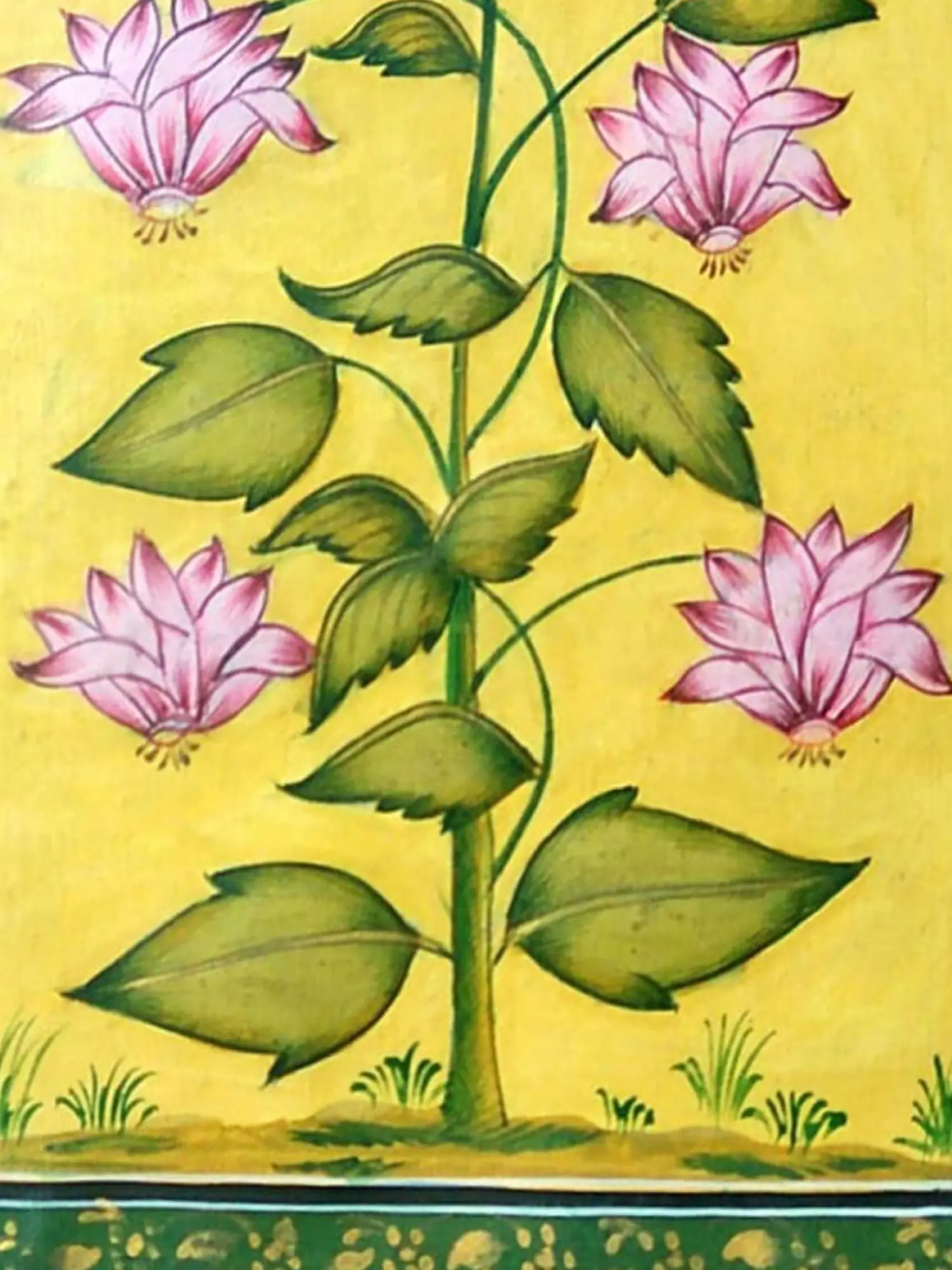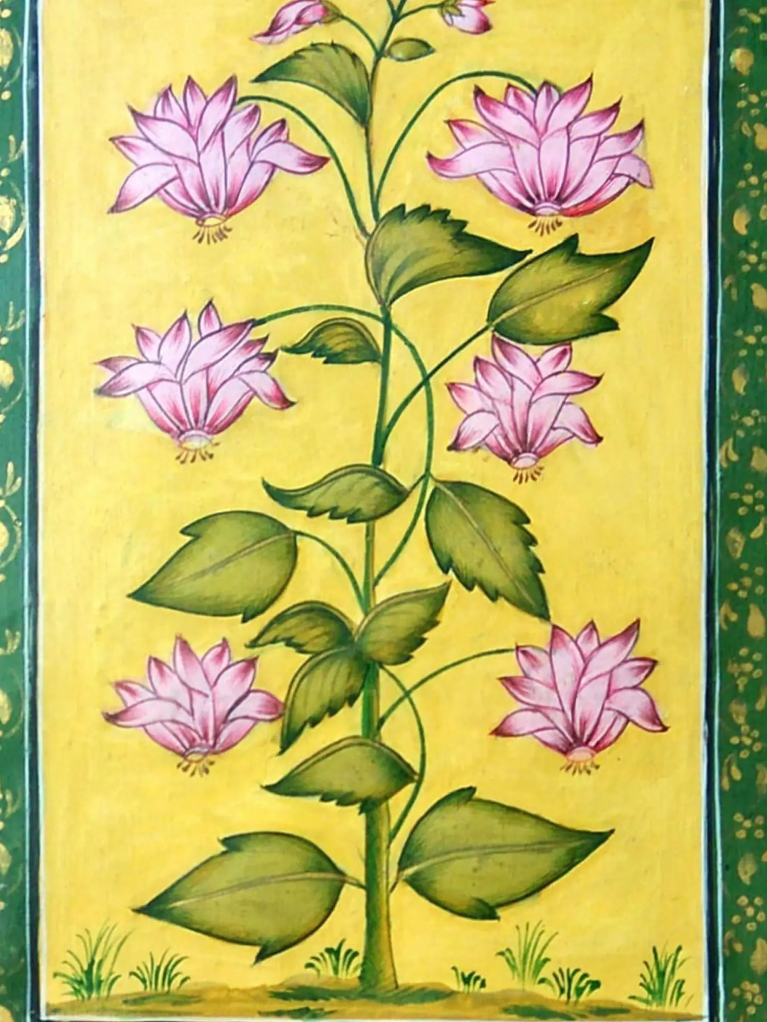 Observe the masterful composition where vibrant hues converge to create a captivating scene. The lush green foliage, rendered with a painterly finesse, provides a striking contrast to the soft, blushing pink of the blossoming flowers. Subtle golden accents within the border add a touch of regal sophistication, framing the central motif with understated grandeur. This harmonious arrangement ensures that your gaze is drawn to the heart of the artwork, appreciating its intricate details and balanced aesthetic.