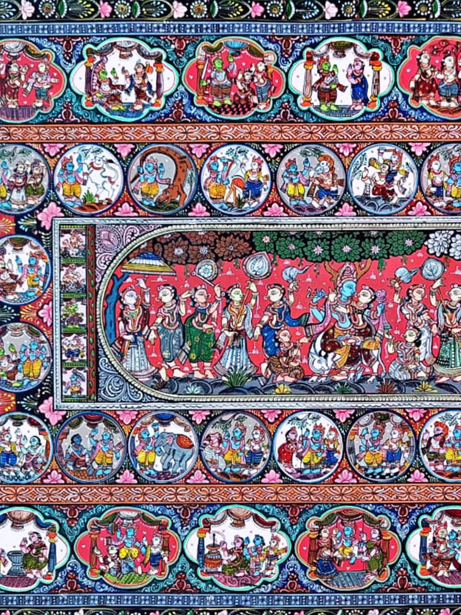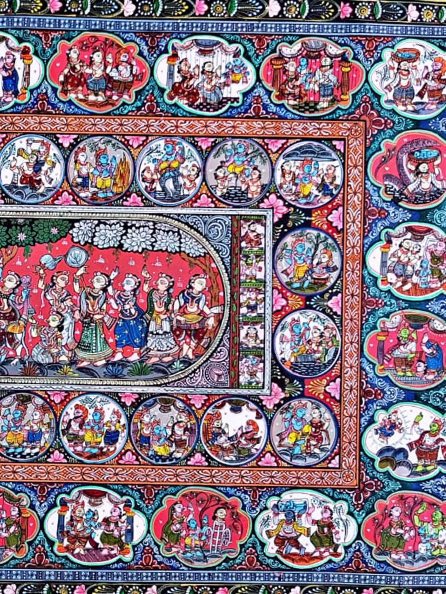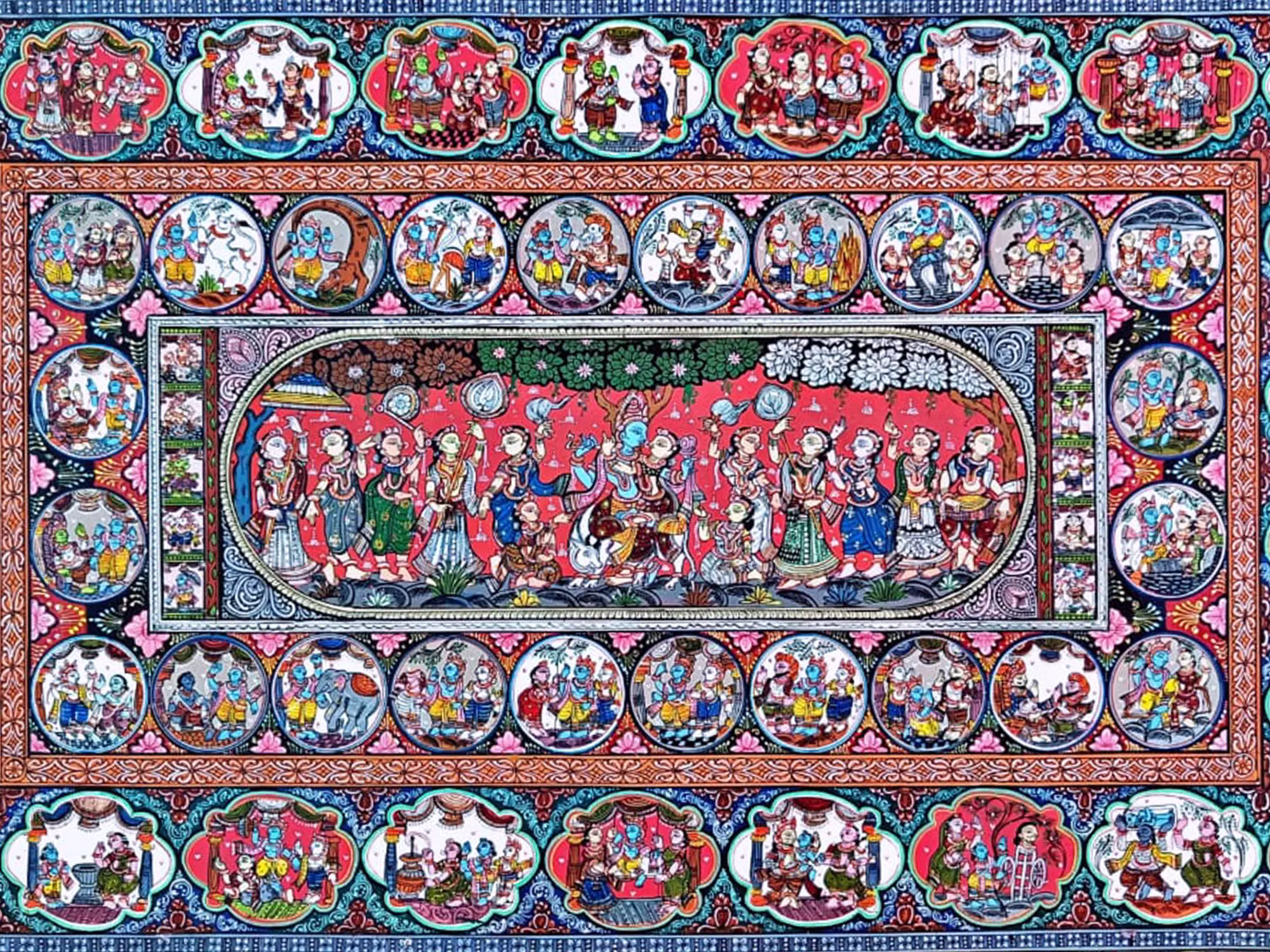 In the intricate details of the canvas, the Miniature Artwork of Krishna Leela unfolds with timeless grace and divine charm. Each stroke of natural colour breathes life into the legendary tales of Lord Krishna's playful adventures, evoking the essence of devotion and reverence. Through the delicate artistry of miniature painting, the artist captures the essence of myth and mysticism, inviting viewers to journey into the enchanting world of Hindu mythology. As scenes unfold and stories intertwine, the artwork becomes a portal to the transcendent realm of spiritual enlightenment, inspiring us to seek truth and beauty in every aspect of existence.