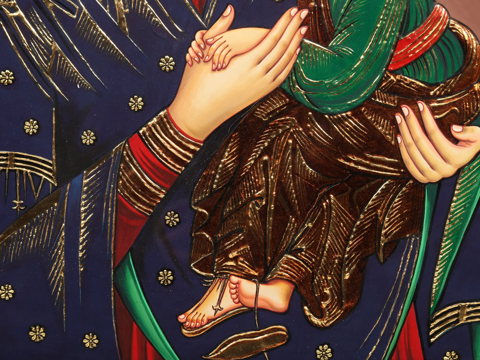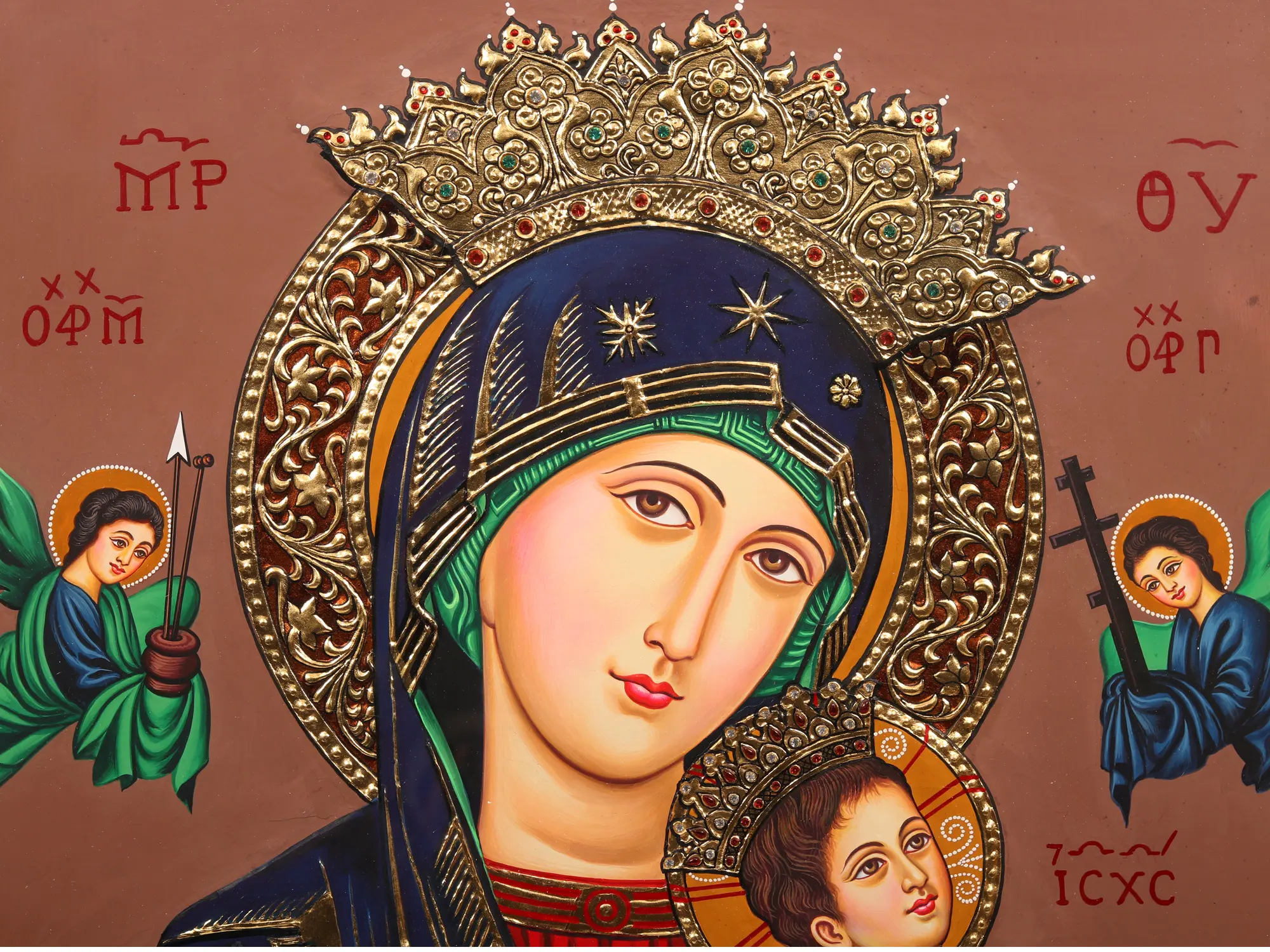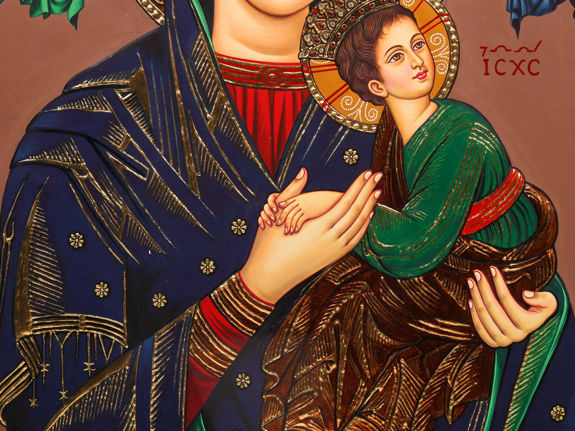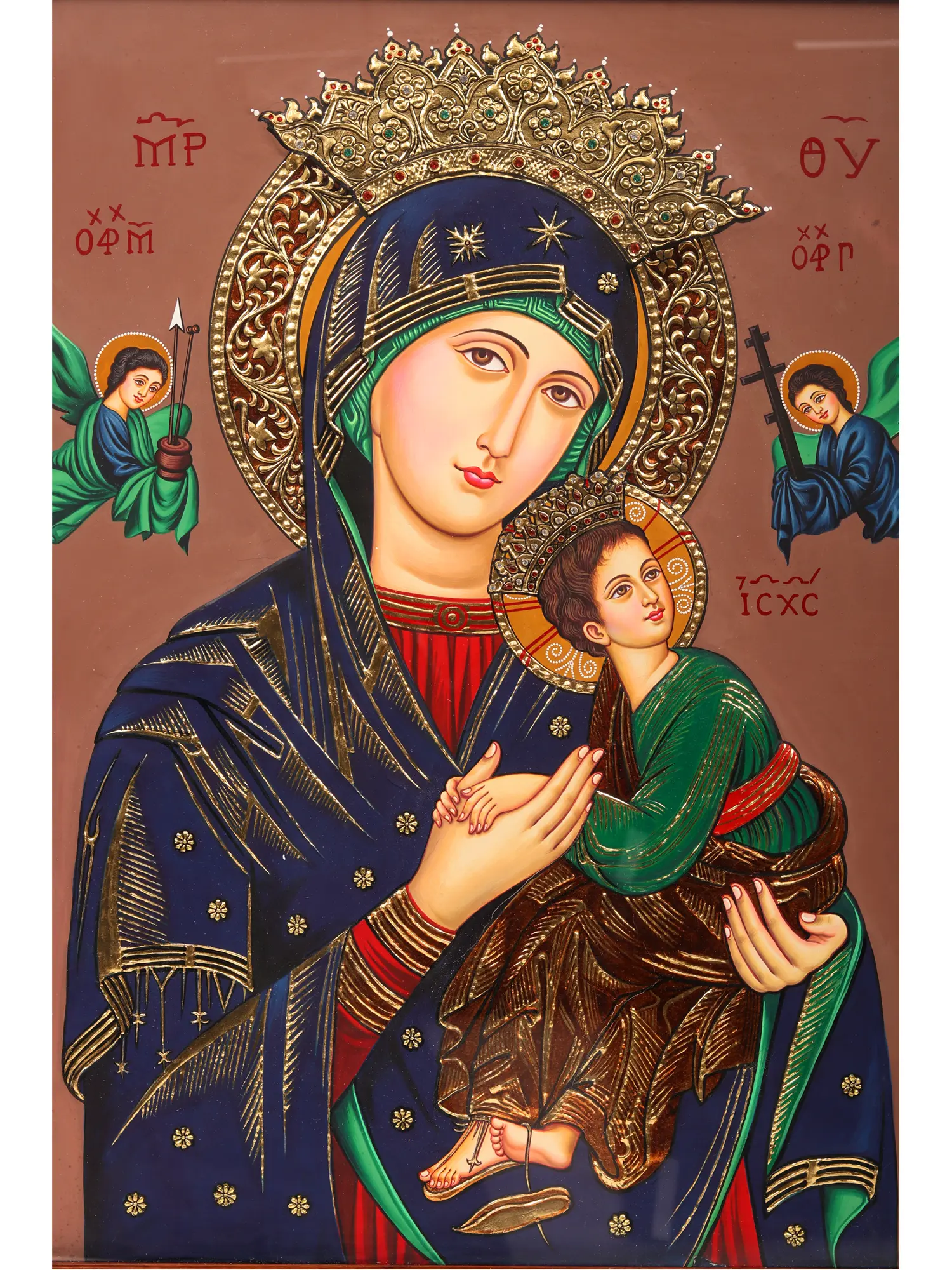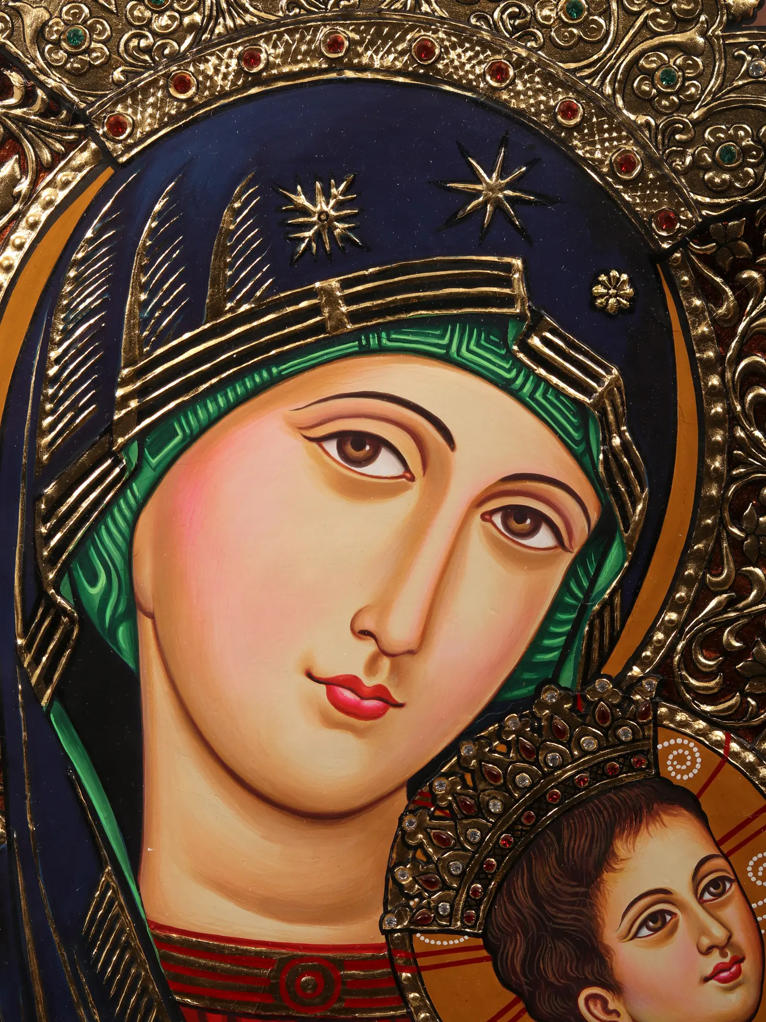 Encompassed within the protective frame, the canvas reveals a tender tableau of Mother Mary cradling Baby Jesus in her arms. Their ethereal connection transcends the earthly realm, radiating love, compassion, and divine protection. This Tanjore piece makes you delve into the depths of devotion, spirituality, and the eternal bond between a mother and her child.