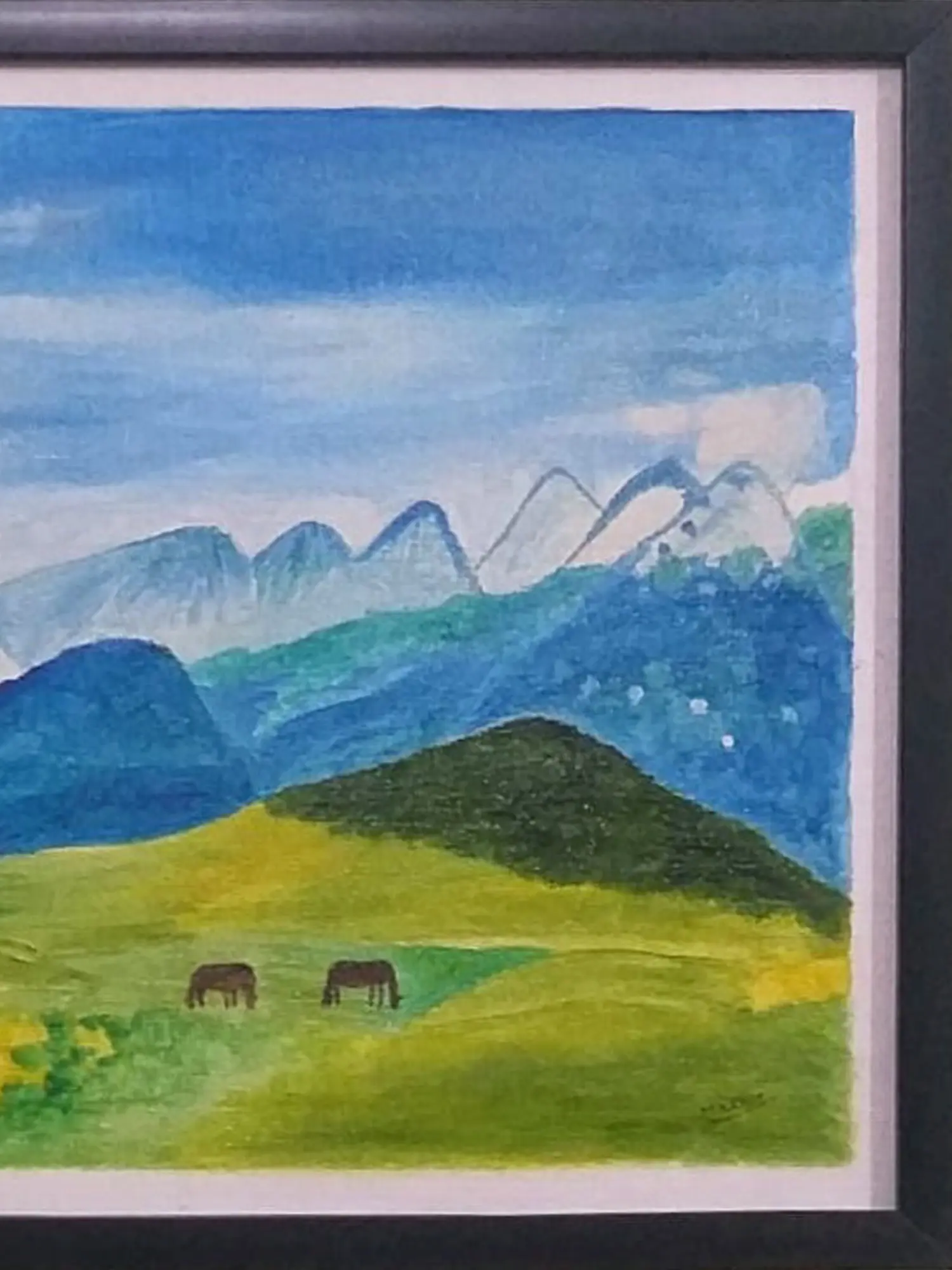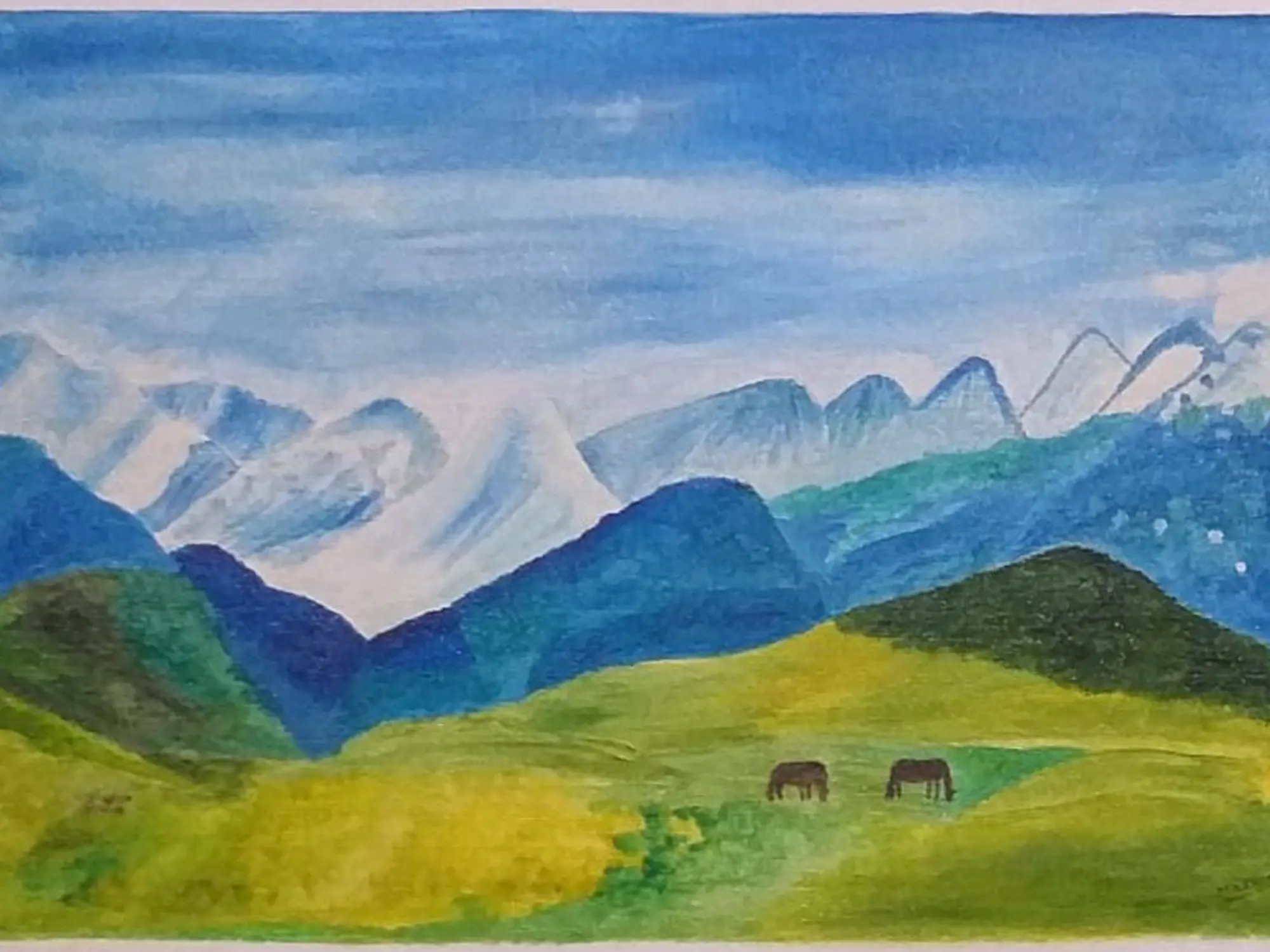 This landscape painting pays homage to the enduring power and sublime beauty of untouched natural landscapes, a theme that has inspired artists for centuries. It taps into our innate connection with the earth's grandeur, reminiscent of romantic landscape traditions that sought to capture the sublime and the spiritual in nature. The inclusion of two horses grazing peacefully adds a subtle touch of life and harmony to the vastness.