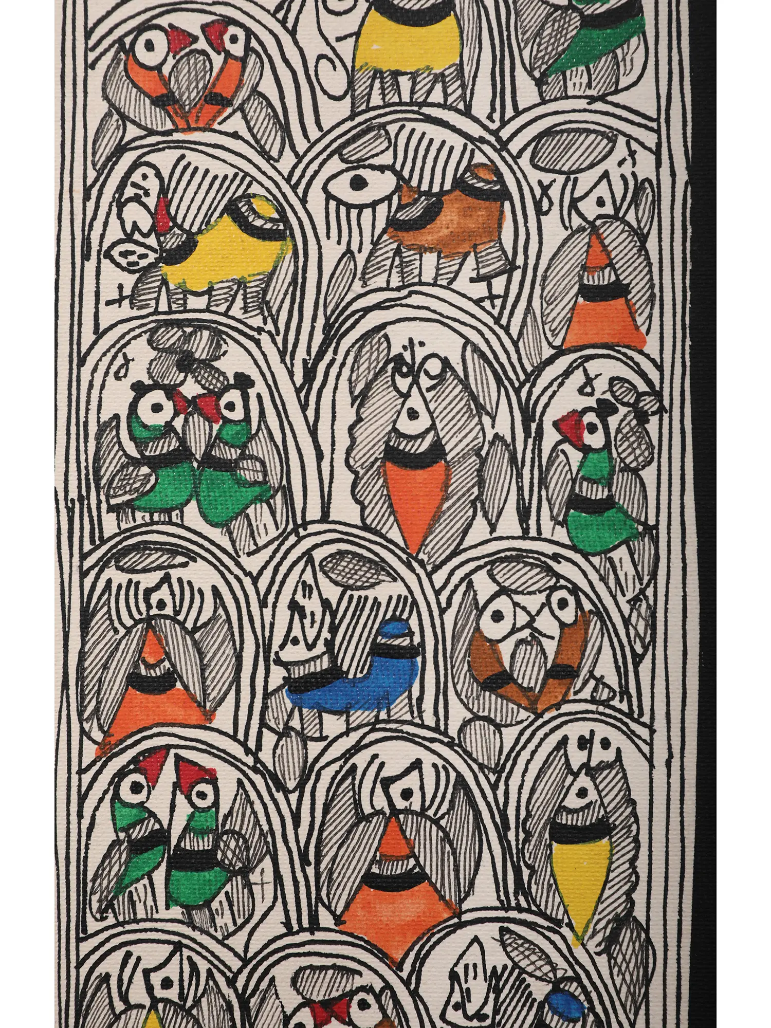 This Godna Art painting on handmade paper offers a captivating glimpse into the vibrant world of the Gond tribal community. Through intricate lines and vivid colors, it depicts a harmonious tapestry of life, showcasing the interdependency of creatures in nature. Elephants, dogs, bugs, and birds coexist in perfect balance, symbolizing the interconnectedness of all living beings.