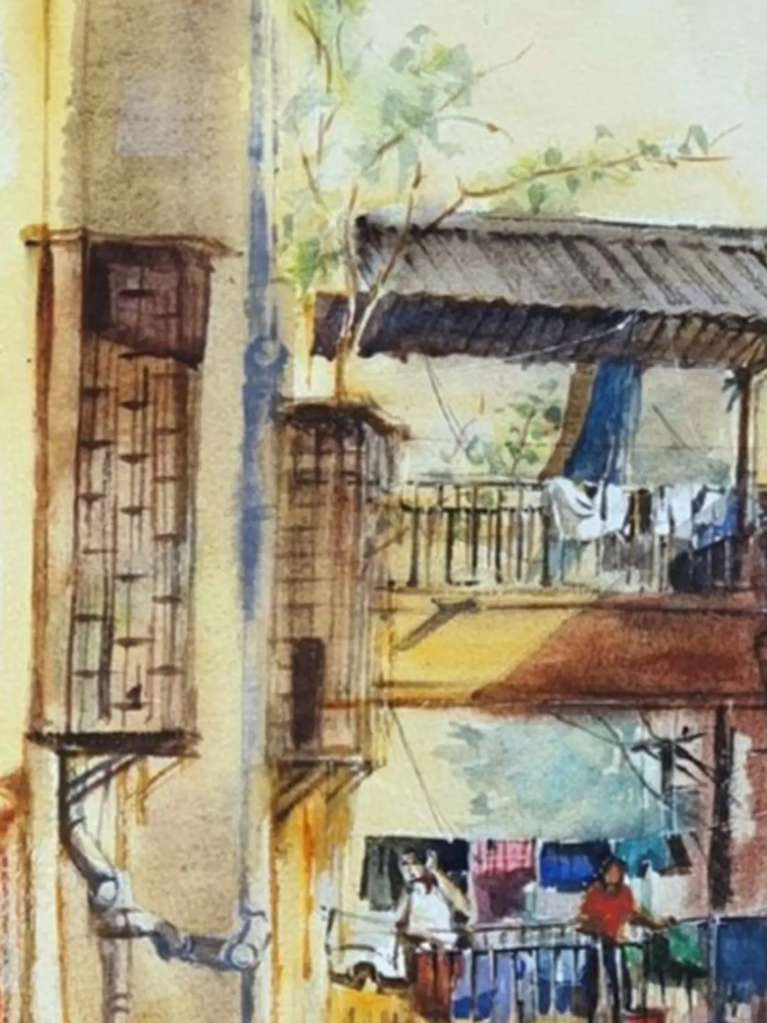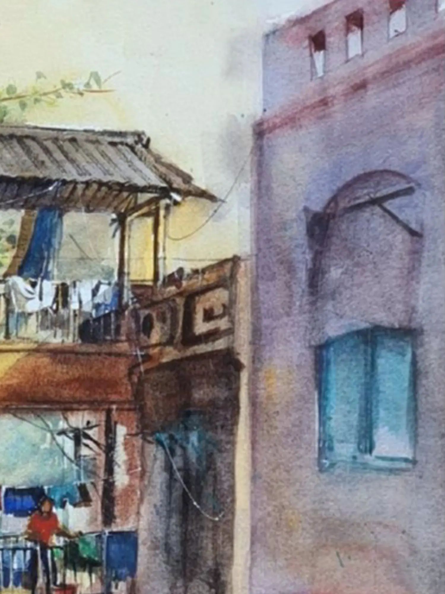 Expertly rendered in watercolor on paper, this artwork showcases a profound understanding of the medium's delicate nuances. The artist masterfully employs washes and fine brushstrokes to build texture and depth, from the weathered facades of buildings to the soft folds of drying laundry. You'll notice the subtle play of light and shadow, a testament to the skillful application of pigments that bring the scene to life. Each element is thoughtfully placed, creating a harmonious and engaging composition.