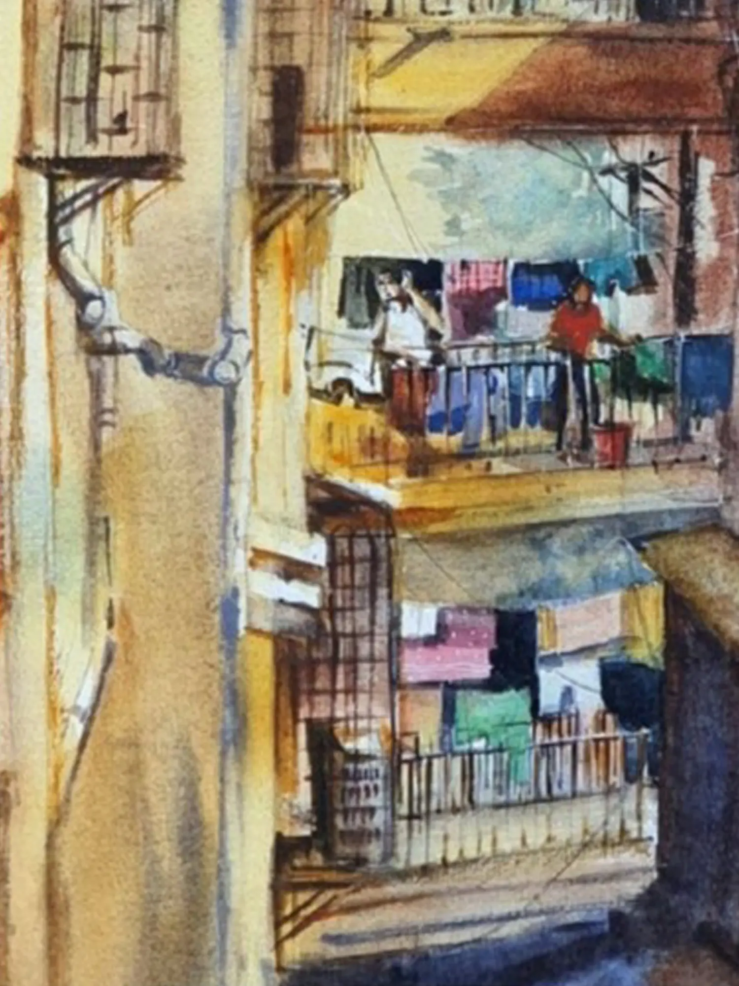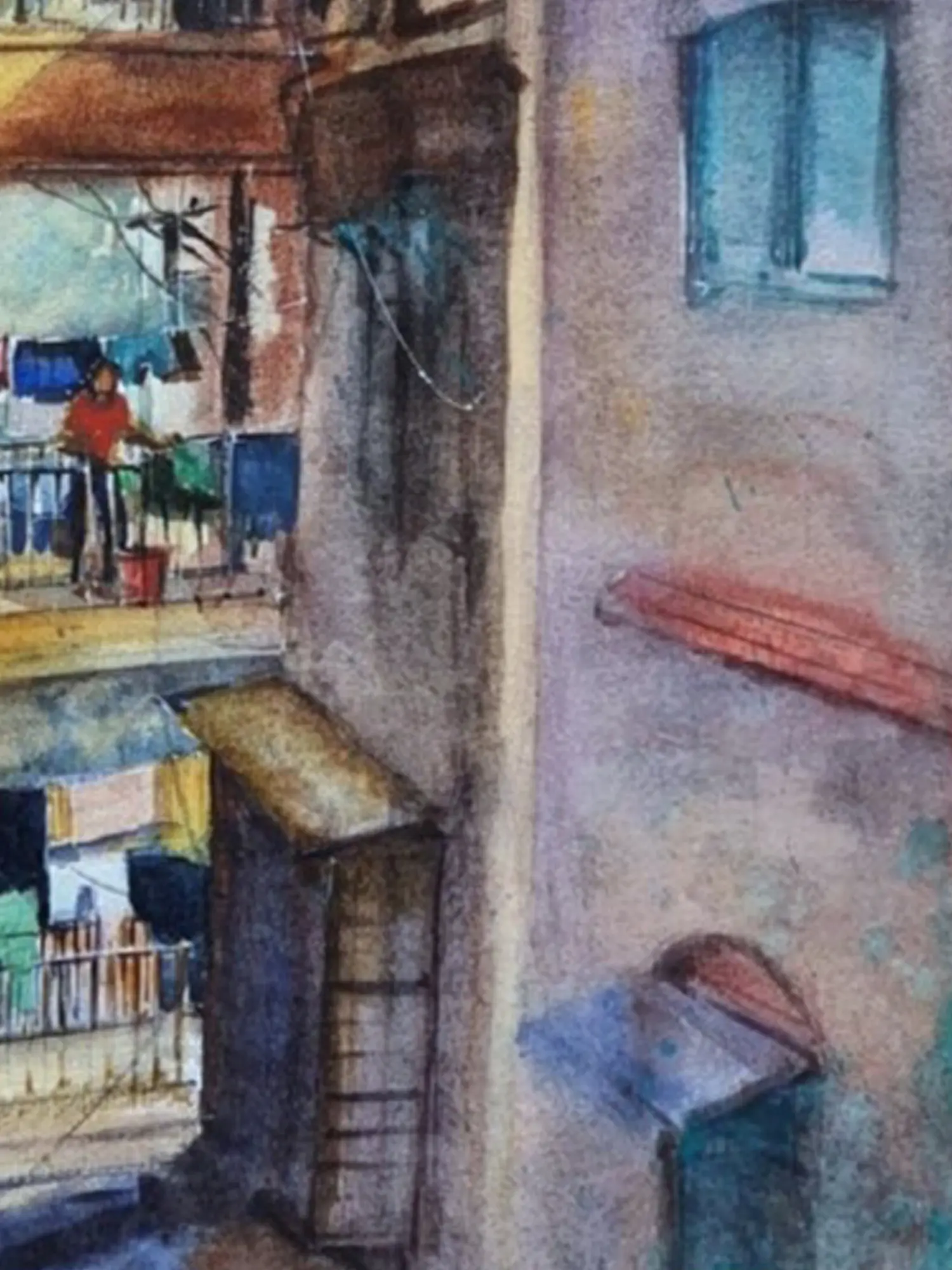 The captivating scene unfolds across the 16-inch height by 12-inch width of the paper, drawing you into its intimate setting. You'll feel the warmth of the sunlight filtering through narrow alleyways and observe the intimate details of daily life played out on balconies. The artist's keen eye captures the rich interplay of architectural styles, hinting at the layers of history within this urban landscape. Observe the carefully depicted laundry lines, a universal symbol of domesticity and community.