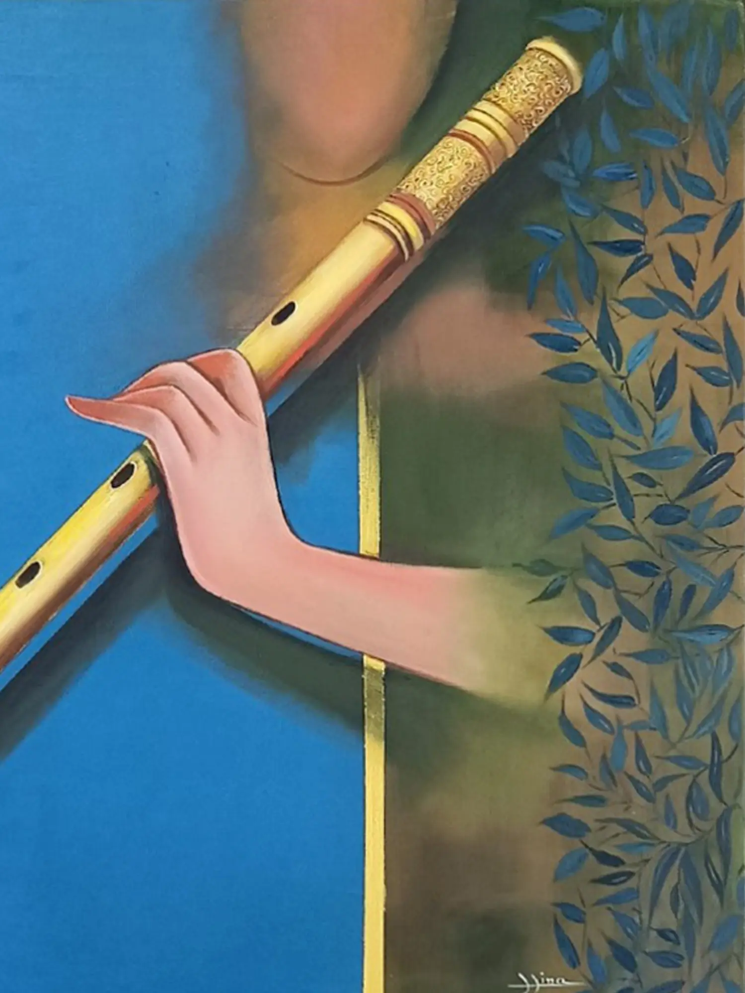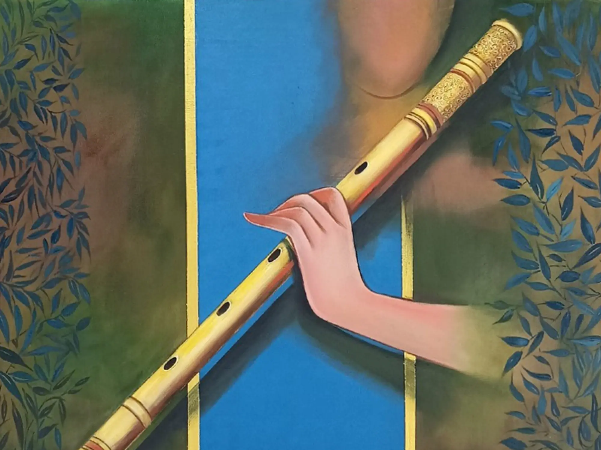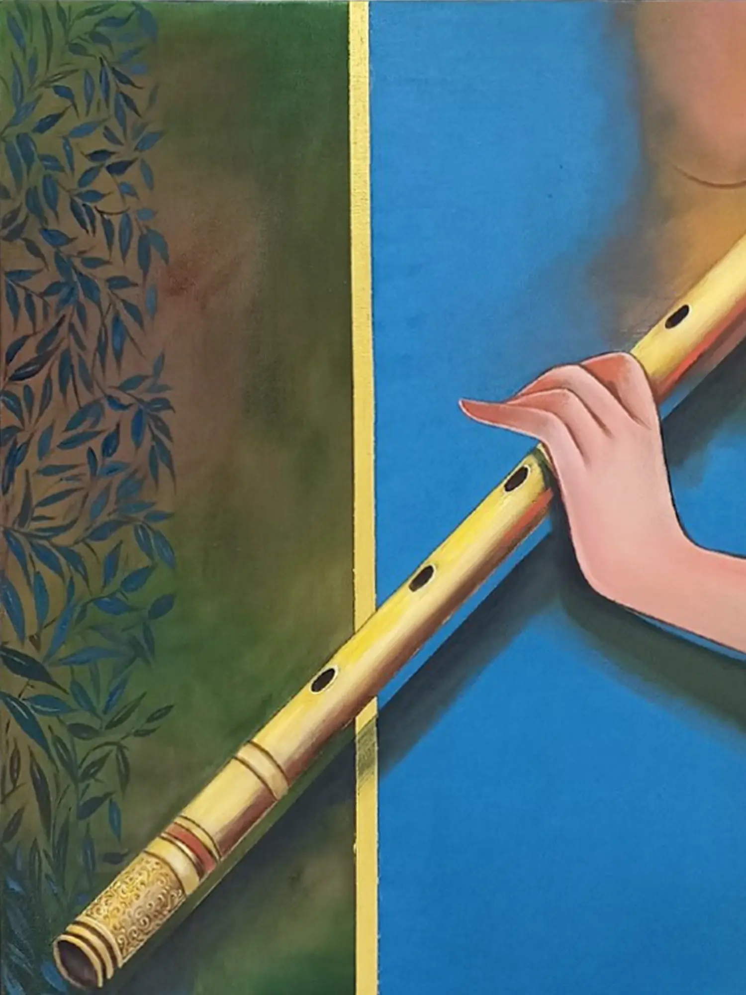 The artwork presents a finely detailed flute, a symbol of enchanting music and divine presence, held gently by a graceful hand. Observe the intricate golden detailing that adorns the instrument's ends, providing a luxurious contrast to the vibrant blue and earthy green hues that form the backdrop. The subtle, stylized leaves framing the scene add an organic, tranquil element, drawing your eye inward to the central subject.