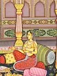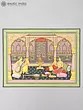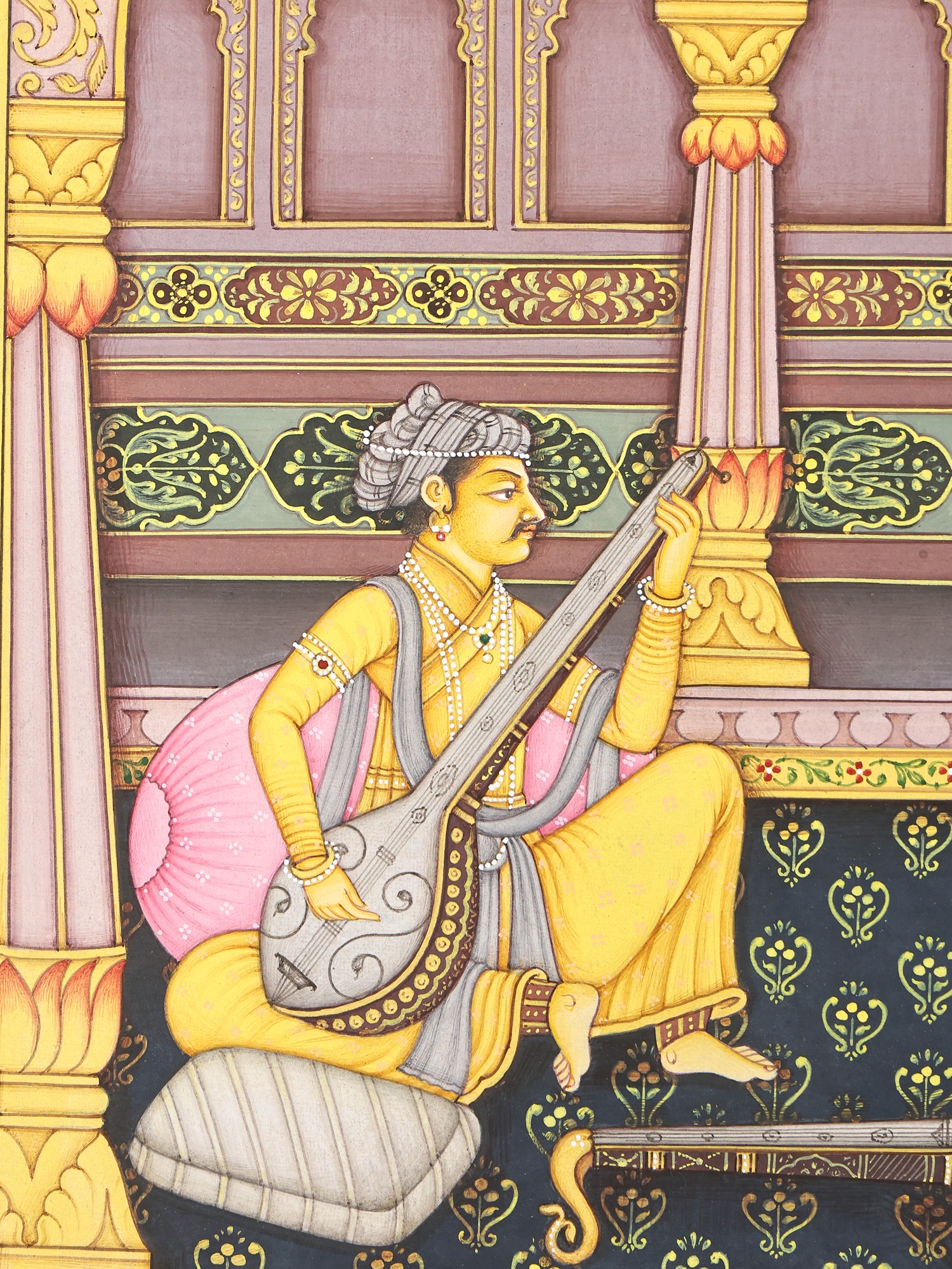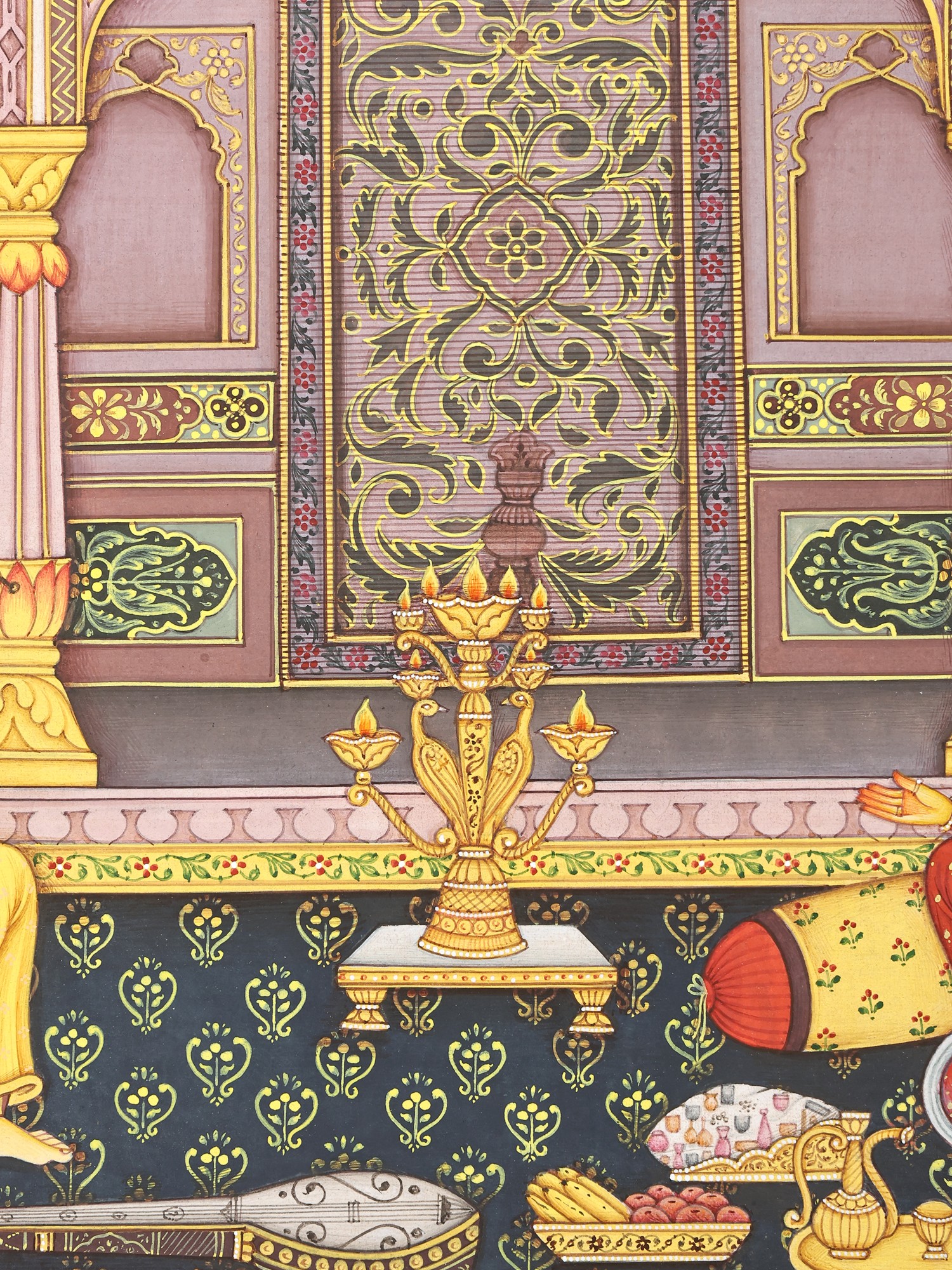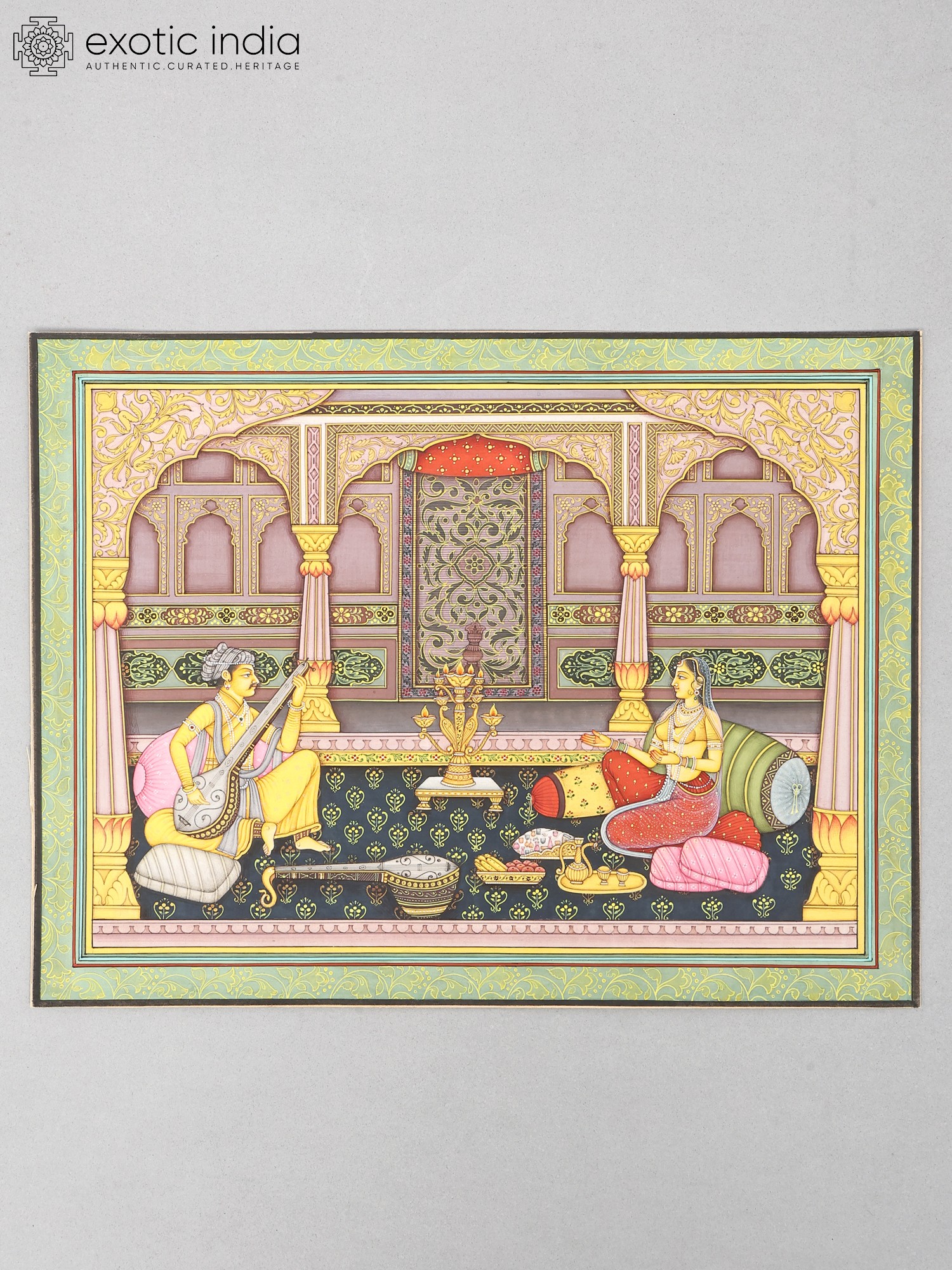 The painting depicts a musician and the patron. The artist is comfortably seated and placing the veena in his lap he strums it. He instantly invokes applause. Another veena lying in the foreground suggests that he is here to train the lady. He is immaculately dressed in an ankle length jama and a pearl strung turban. The lady wears a colourful attire and rests against bolsters and cushions. Fruits, nuts and wine are laid out on the carpet. An elaborate lamp holds numerous flames. Everything in the foreground speaks of grandeur. And all that we have talked of occupies the clearly divided lower half.