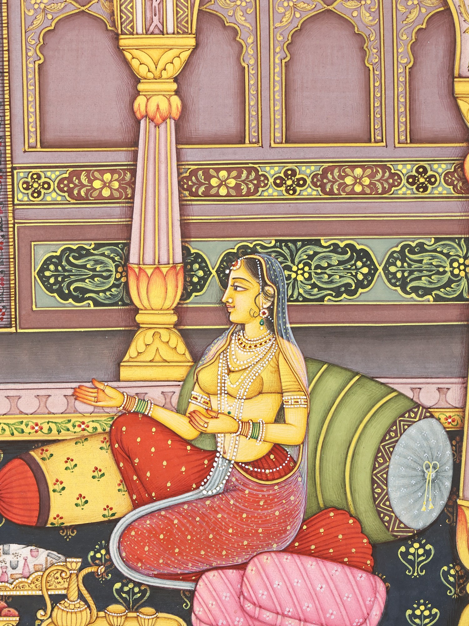The patterns on the wall, the unusual colour palette and the use of golden paint imply that the artist has left no stone unturned to make this painting an extraordinary one!