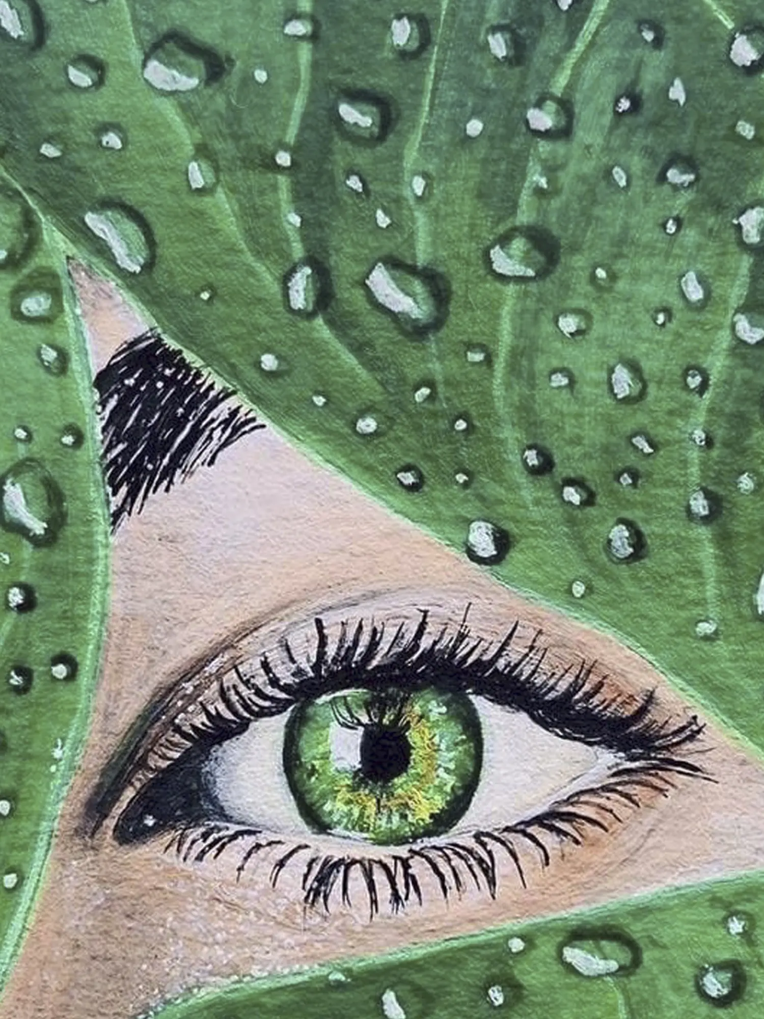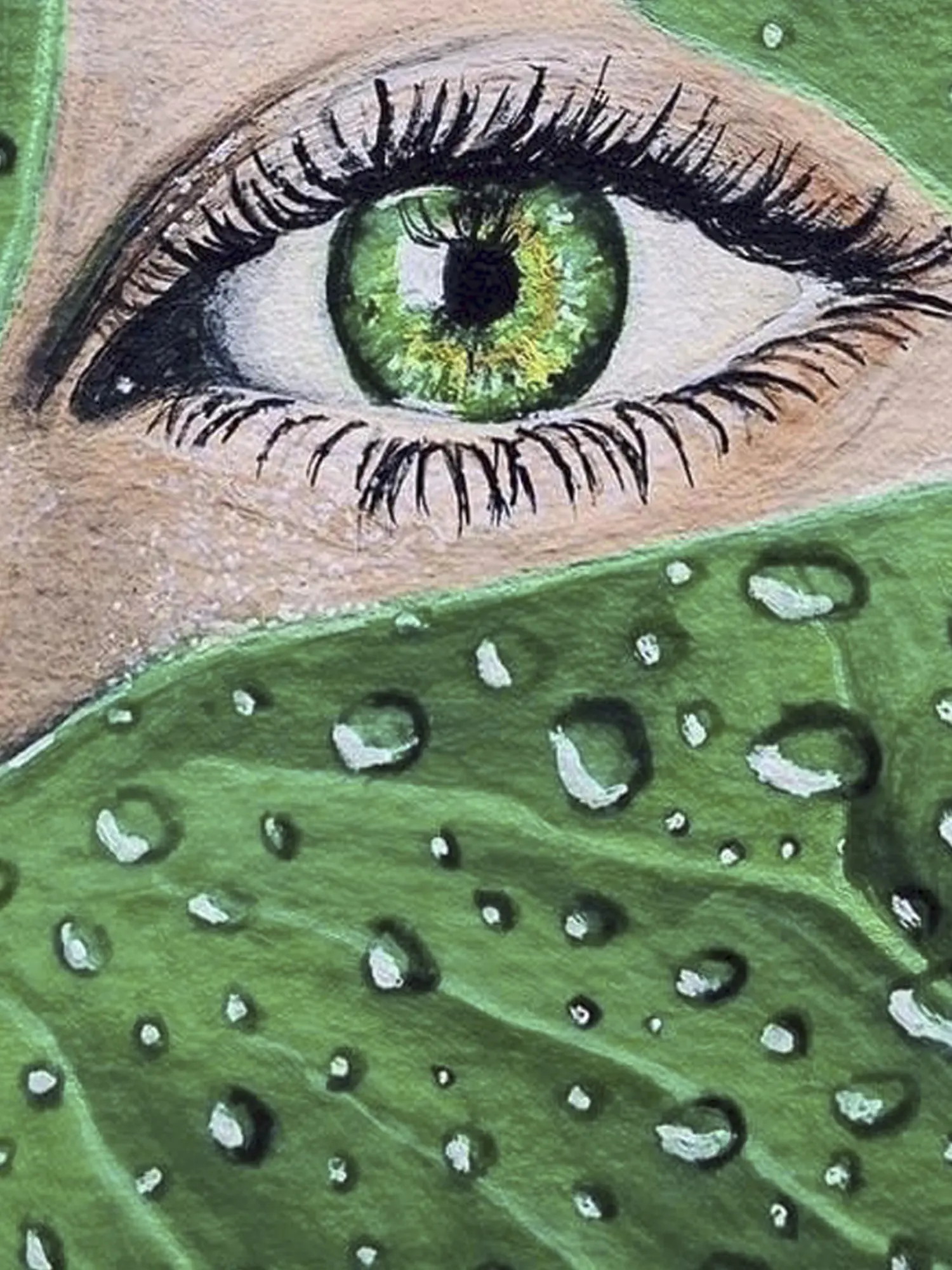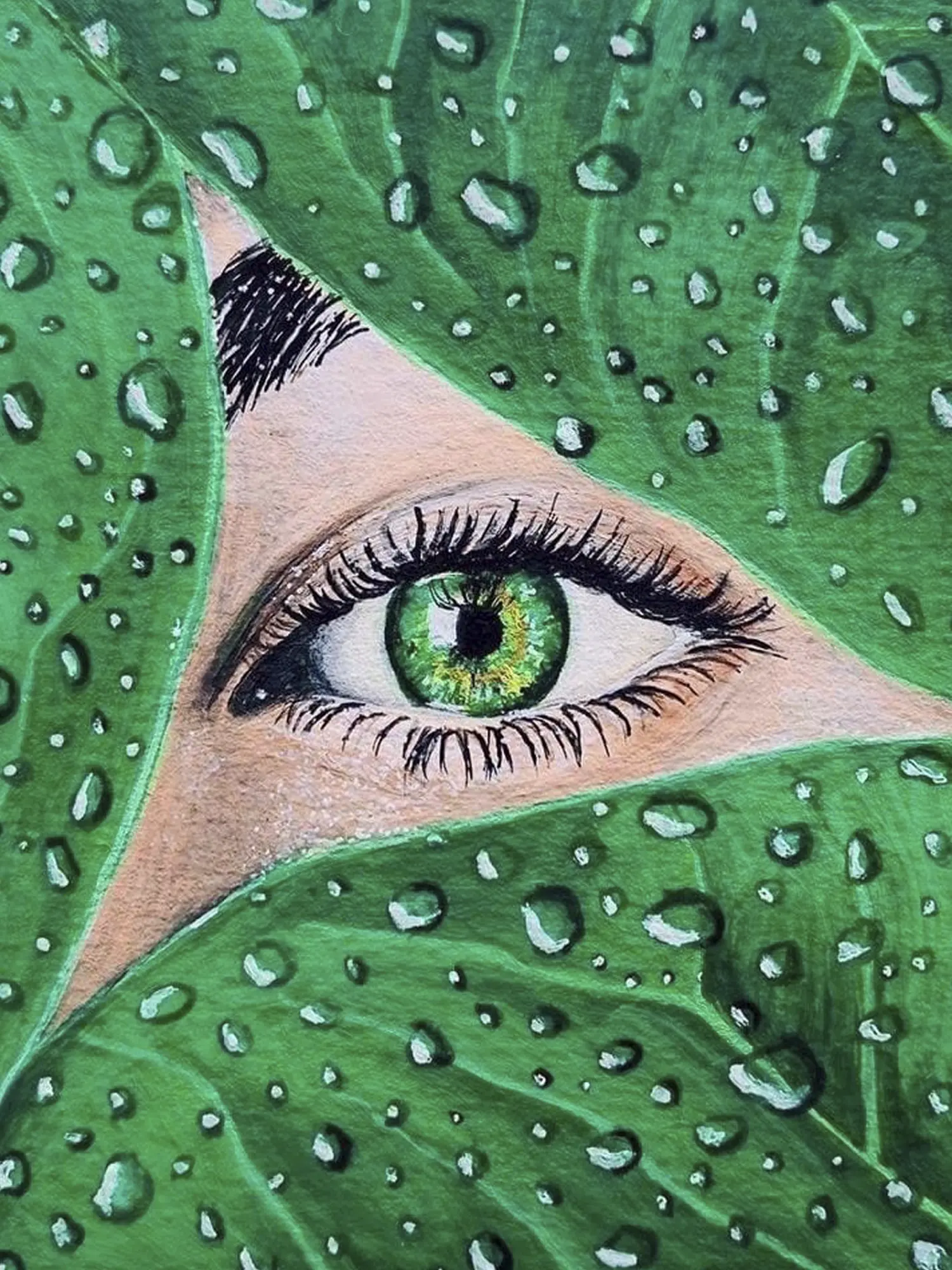 This piece subtly evokes themes found in ancient nature myths and philosophies, where the eyes are often seen as windows to the soul and conduits of primal energy. The lush, wet foliage suggests a connection to renewal and fertility, while the singular, watchful eye embodies awareness and deep understanding. It speaks to a universal appreciation for the serene yet powerful presence of the natural world.