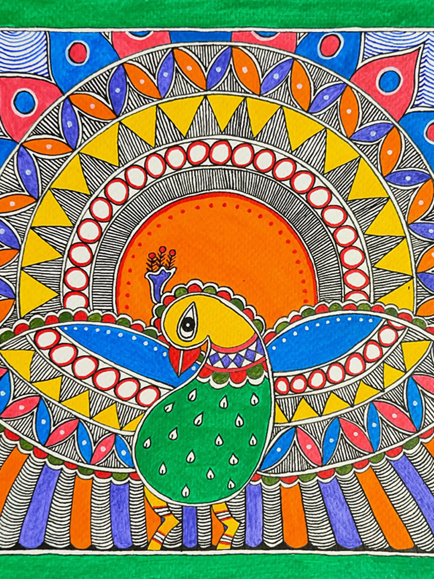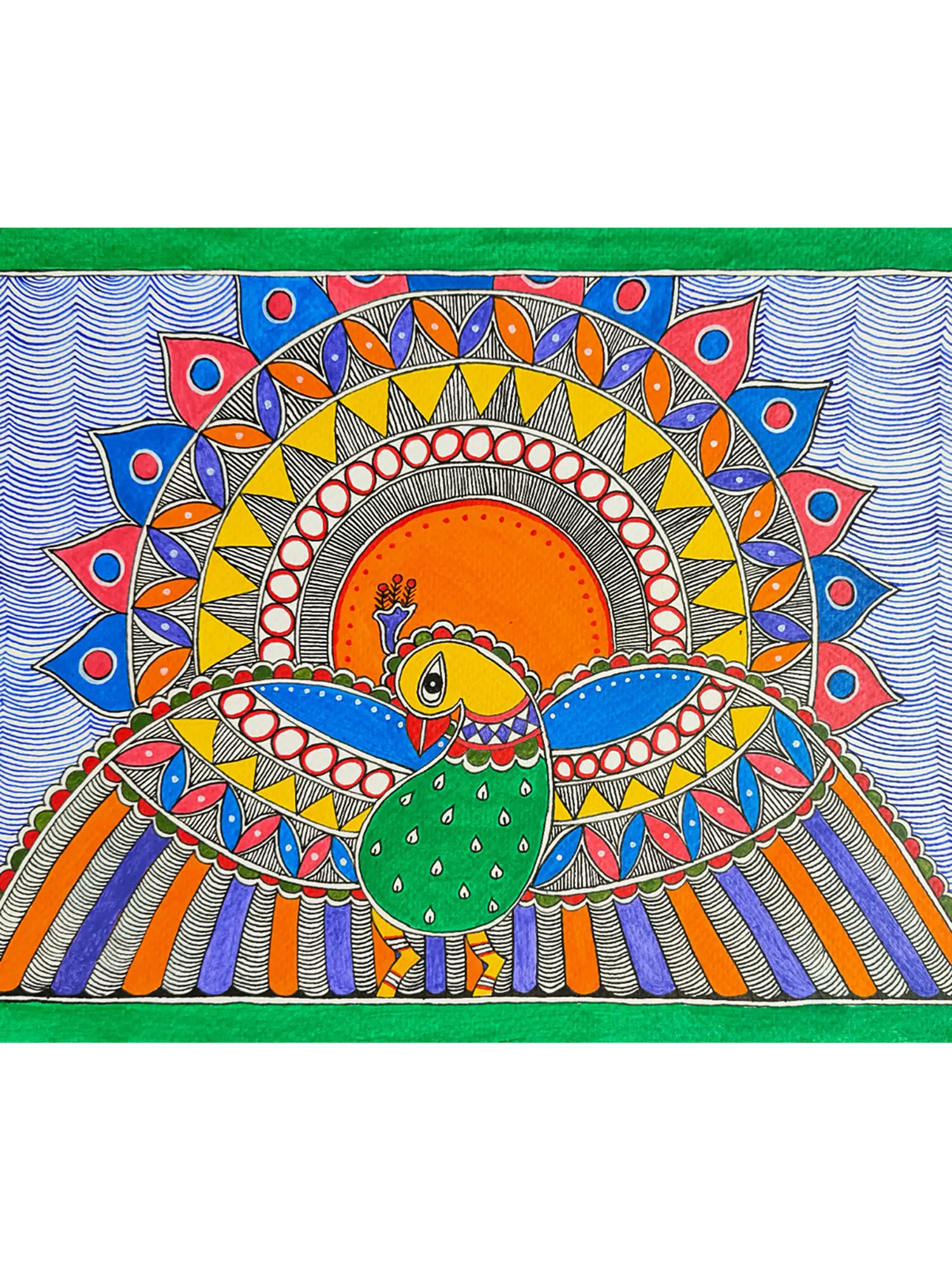 Madhubani Peacock And Fish Painting | Acrylic On Handmade Paper | With Frame | By Mrunamayee Chandurkar Bakal