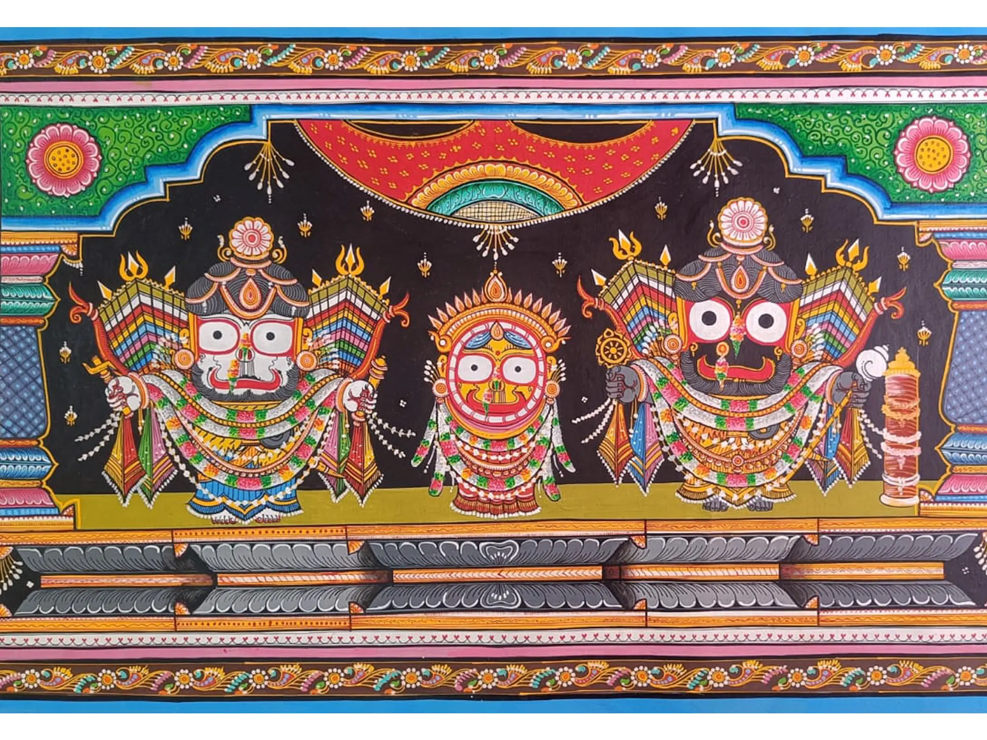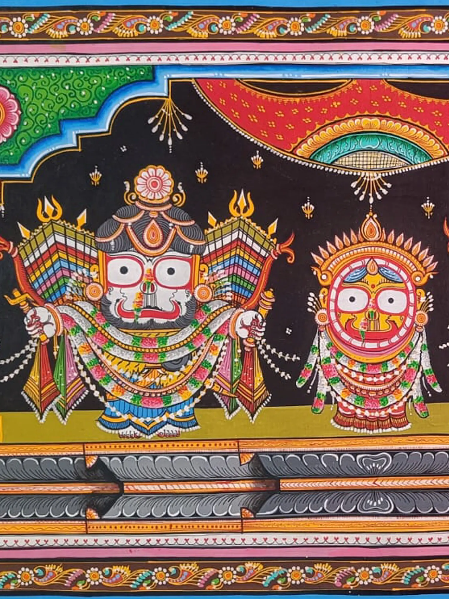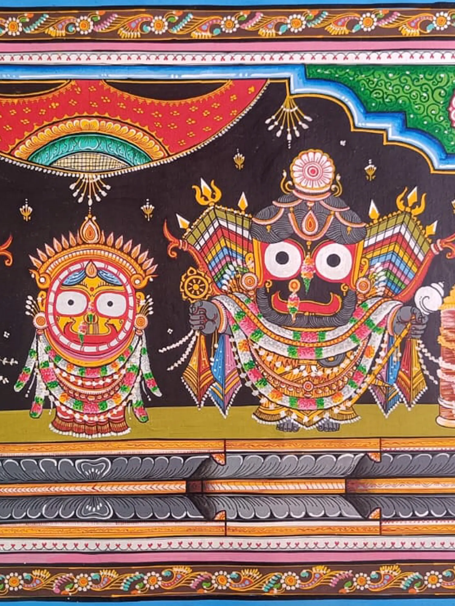 The divine incarnation of Nagarjuna, embodied by Lord Jagannath, unfolds in vibrant hues on canvas. From Jagannath's serene countenance to his majestic presence, every brushstroke captures the essence of cosmic wisdom and divine benevolence. The painting serves as a timeless ode to Lord Jagannath's eternal vigilance and cosmic role, inspiring devotees to seek solace and guidance in his divine embrace. Through its mystical symbolism and artistic finesse, the artwork transcends earthly realms, inviting viewers into the ethereal realms of devotion and spiritual enlightenment.