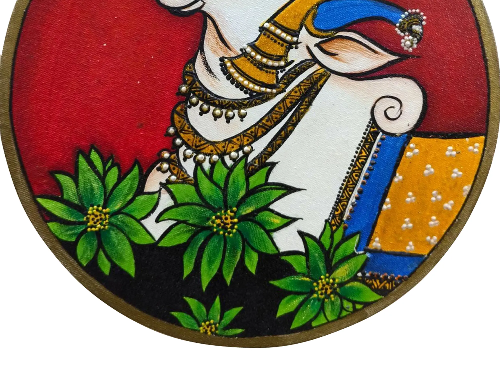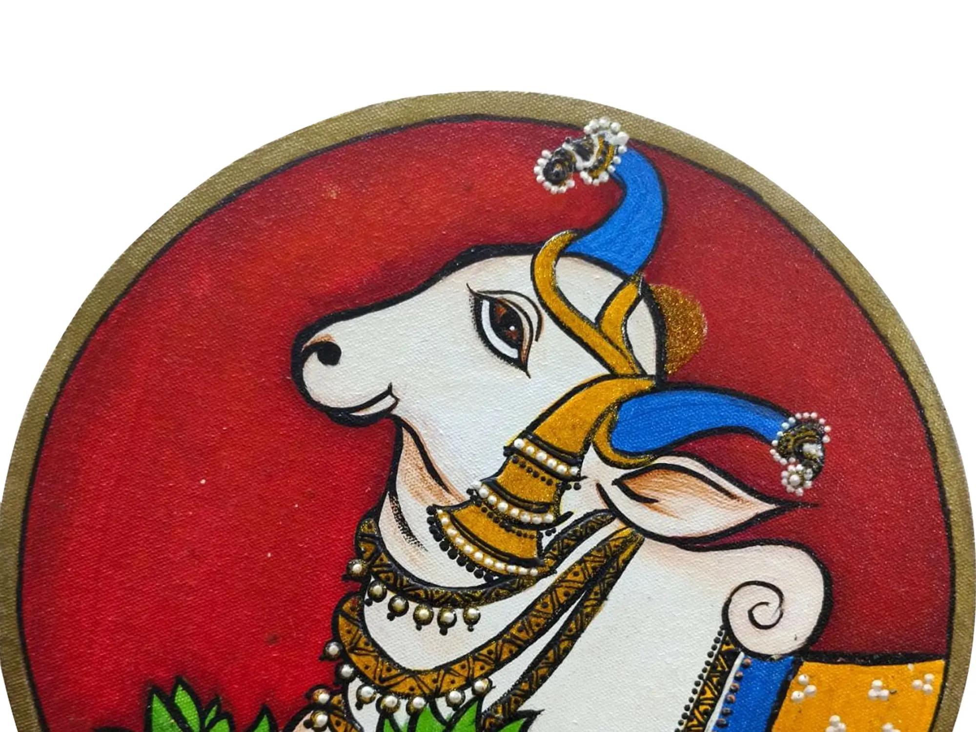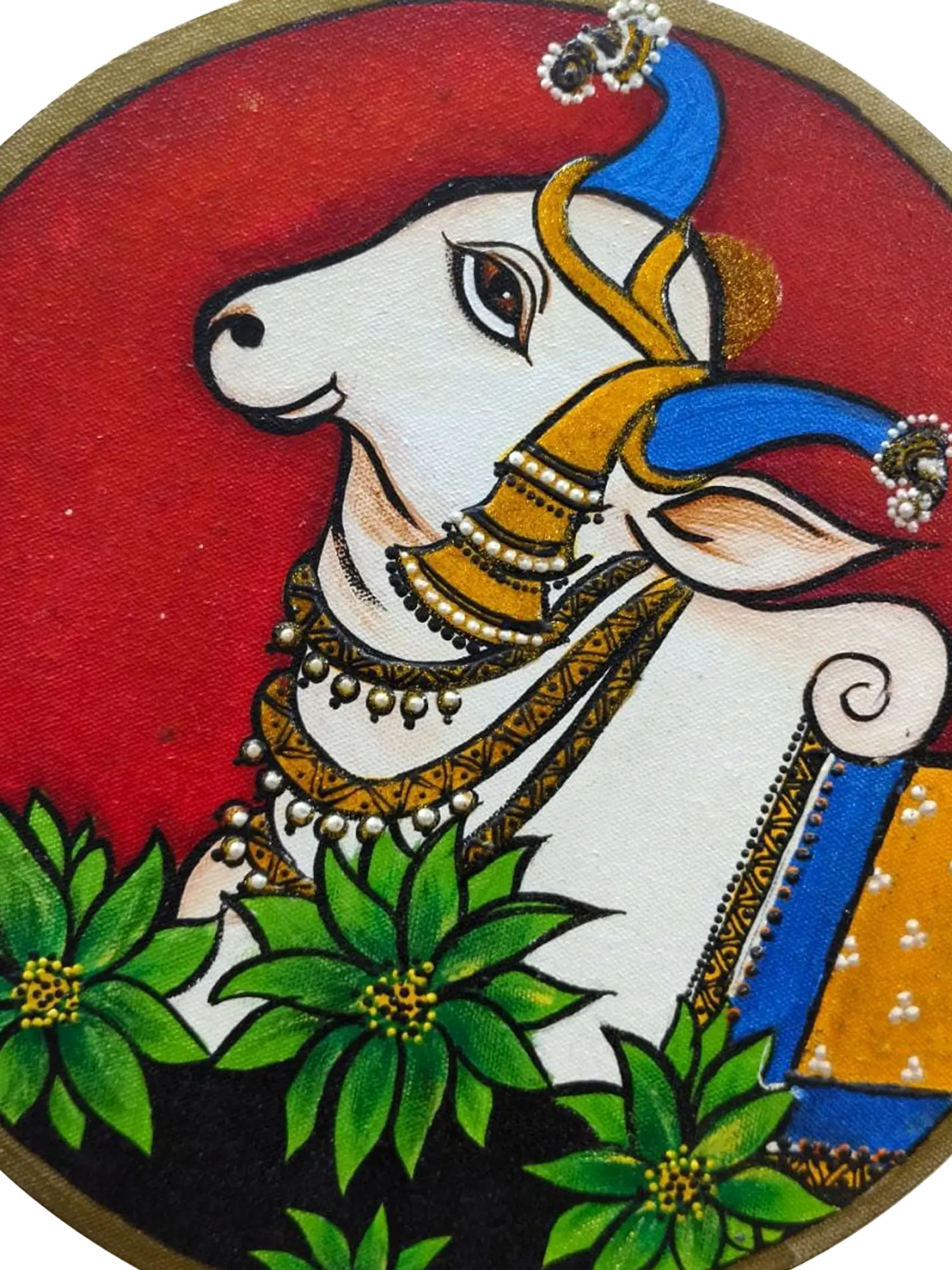 Enrich your surroundings with the divine energy of this Pichwai Painting. Crafted with acrylic colours on canvas, the artist pays homage to Lord Shiva's sacred mount bull, Nandi. The stunning finishing and vibrant colours bring Nandi to life, exuding a sense of reverence and spiritual significance. The Pichwai art style adds cultural depth to this piece, making it a meaningful addition to your space.