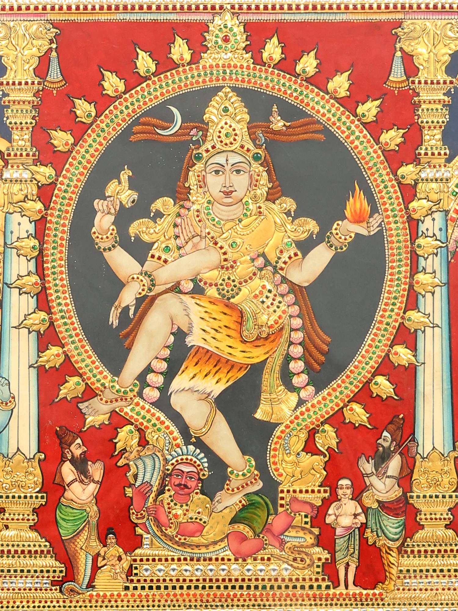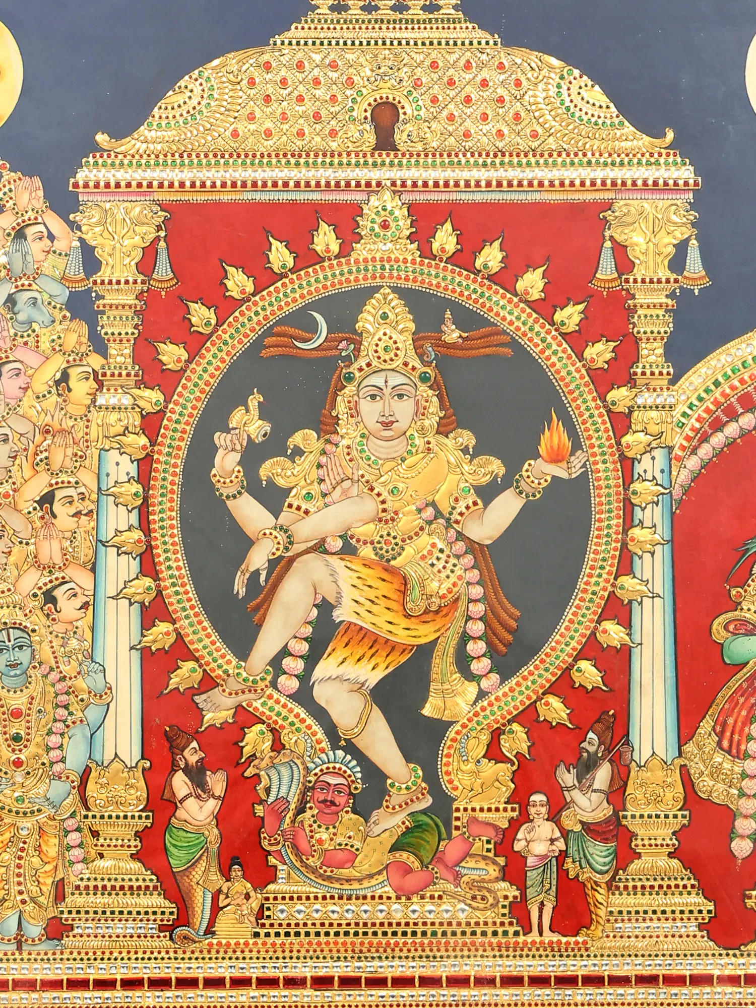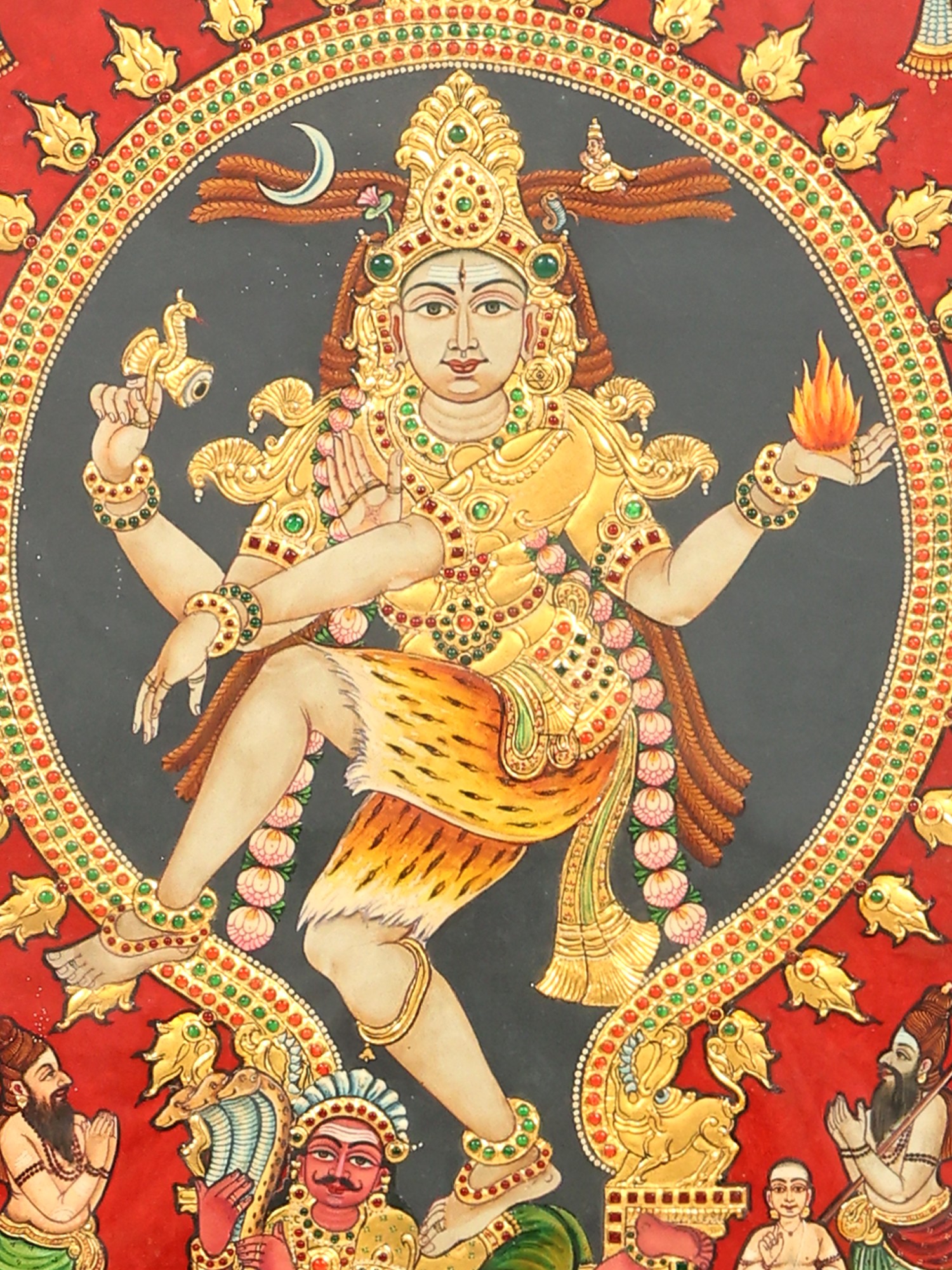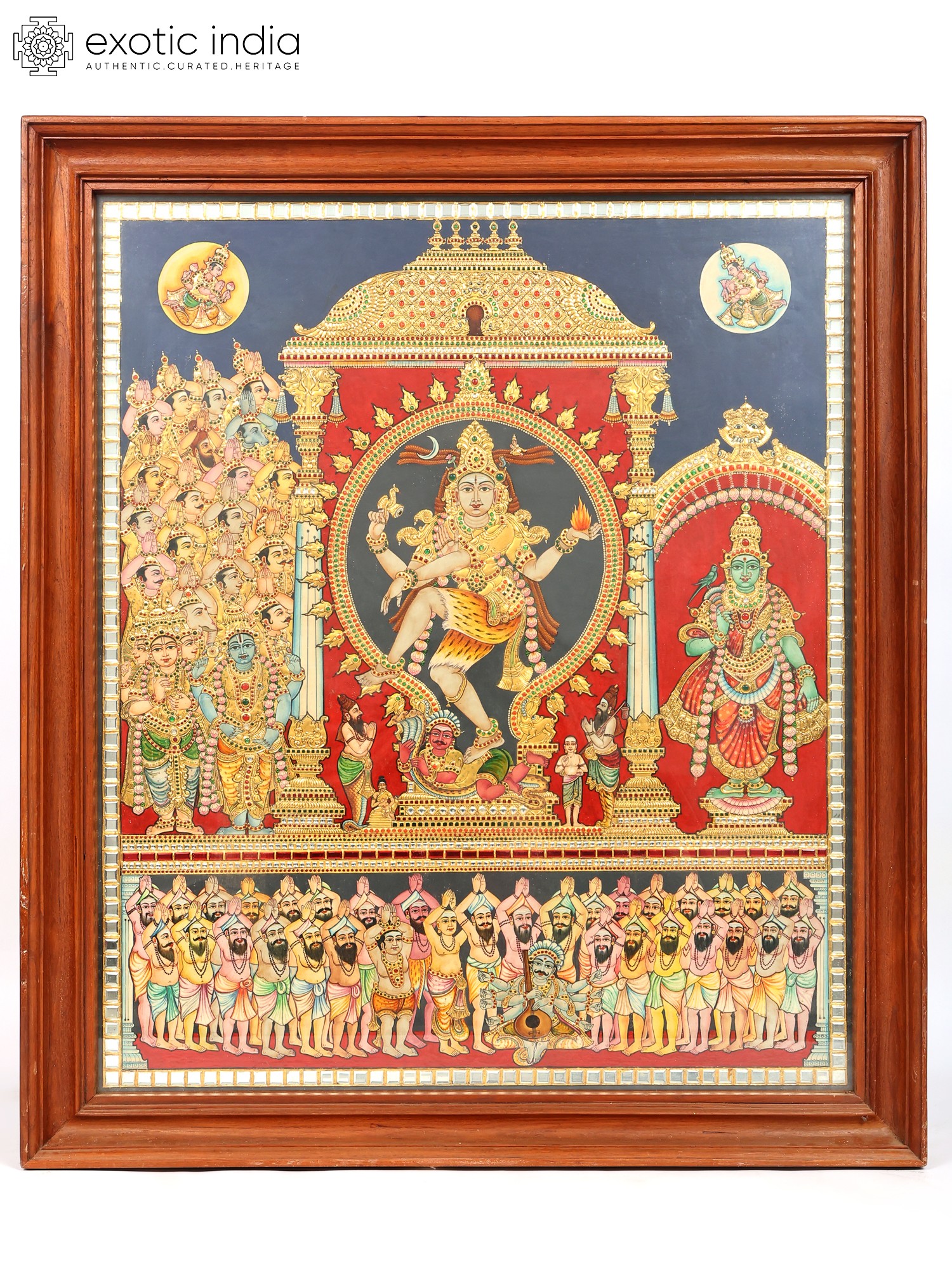Large Urdhva Tandav (Dancing Shiva) Tanjore Painting | Traditional Colors With 24K Gold | Teakwood Frame | Gold & Wood
