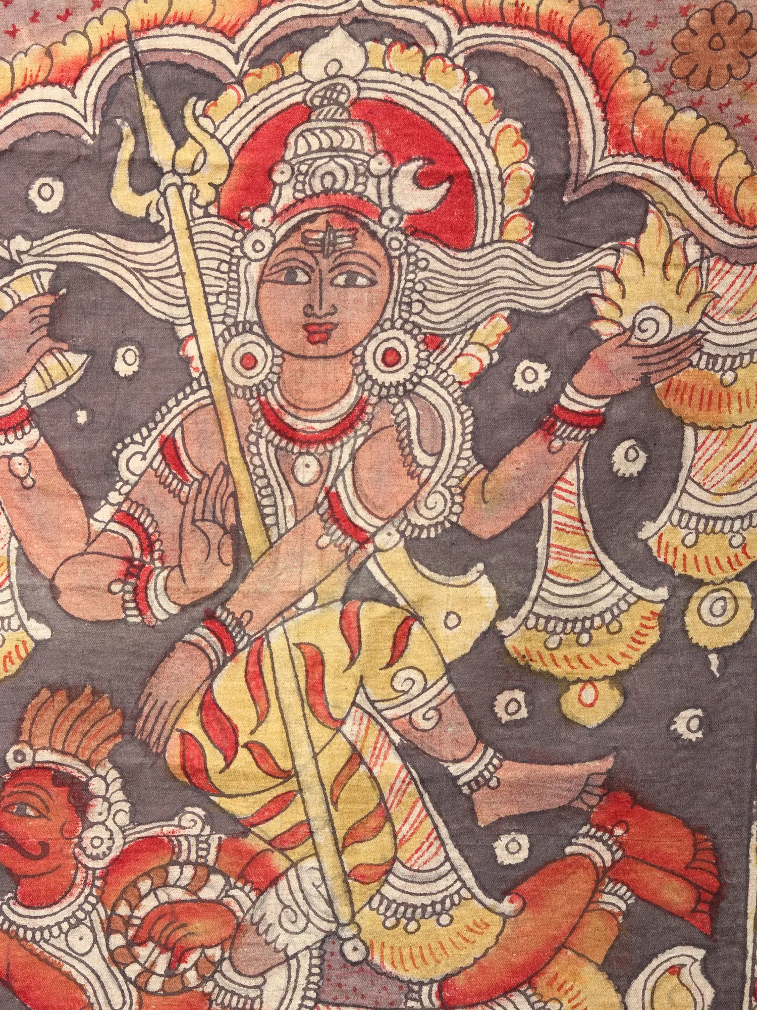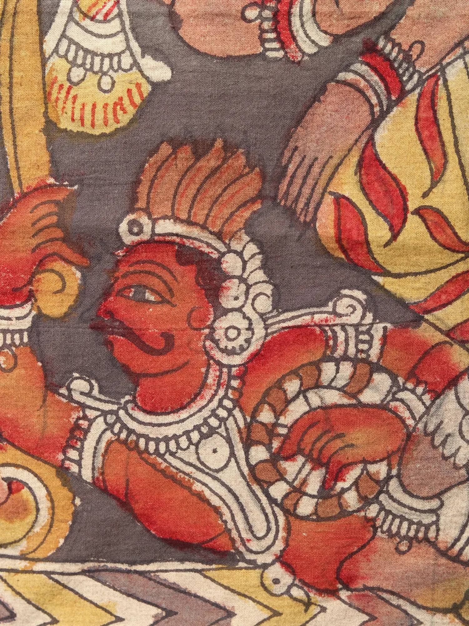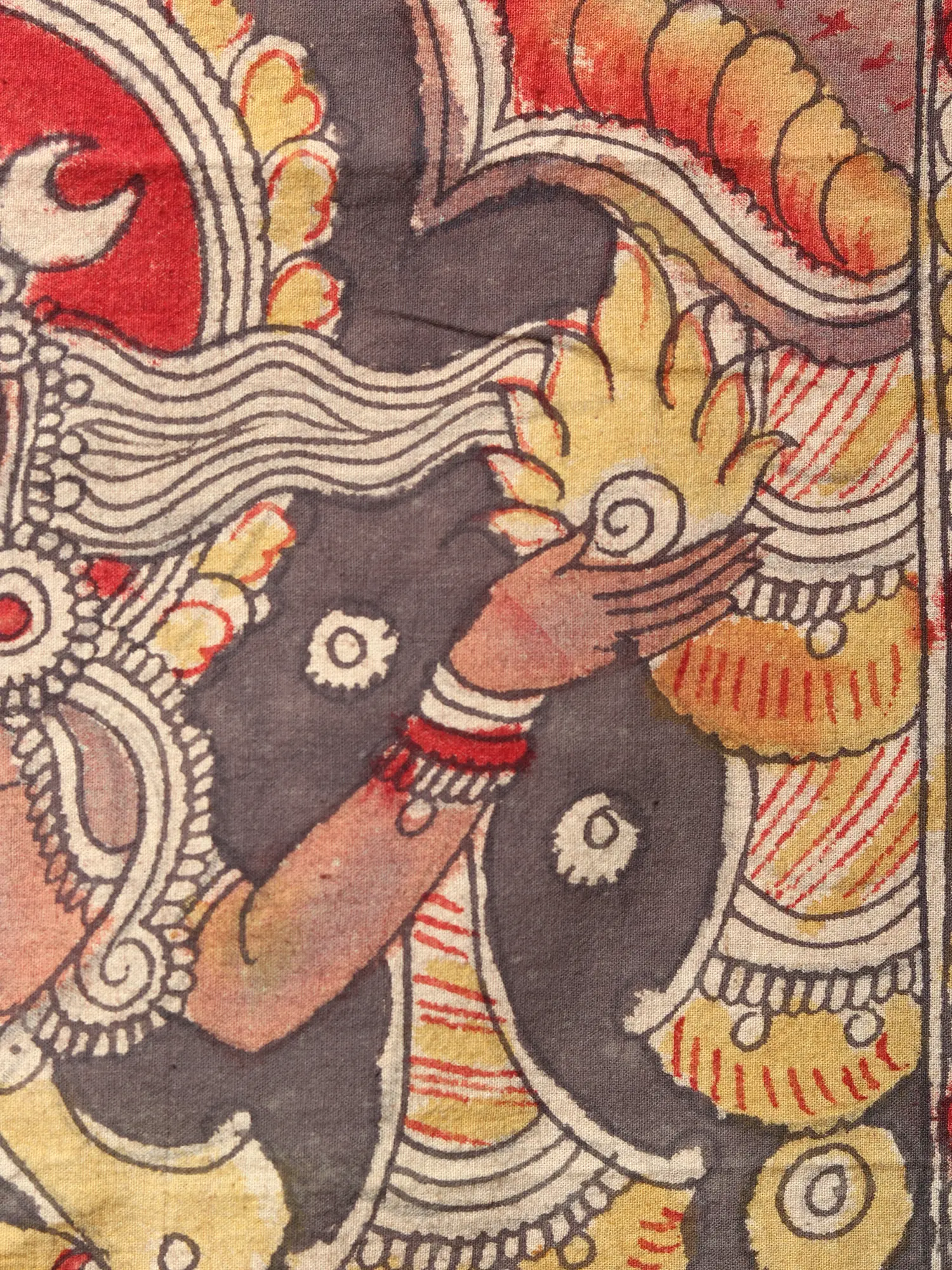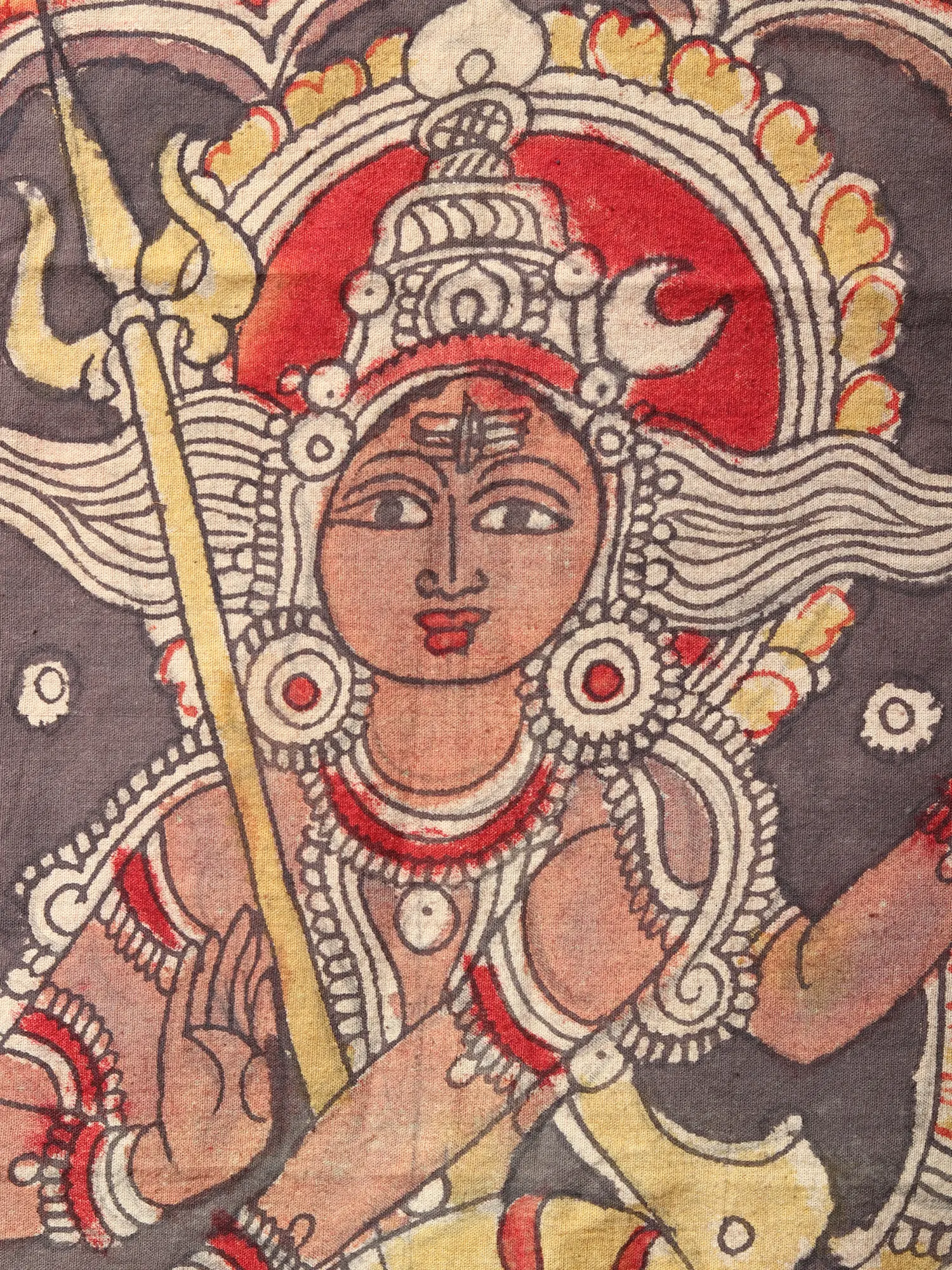 This Kalamkari Painting on Cotton of Lord Nataraja, which represents Lord Shiva's cosmic dance, captivates with its amazing detail. This specific Shiva figure became connected with dance academies; a Nataraja image or statue could be found at the entrance of practically every dance theatre. It has long been customary to honor this memorial before beginning any performing arts project.