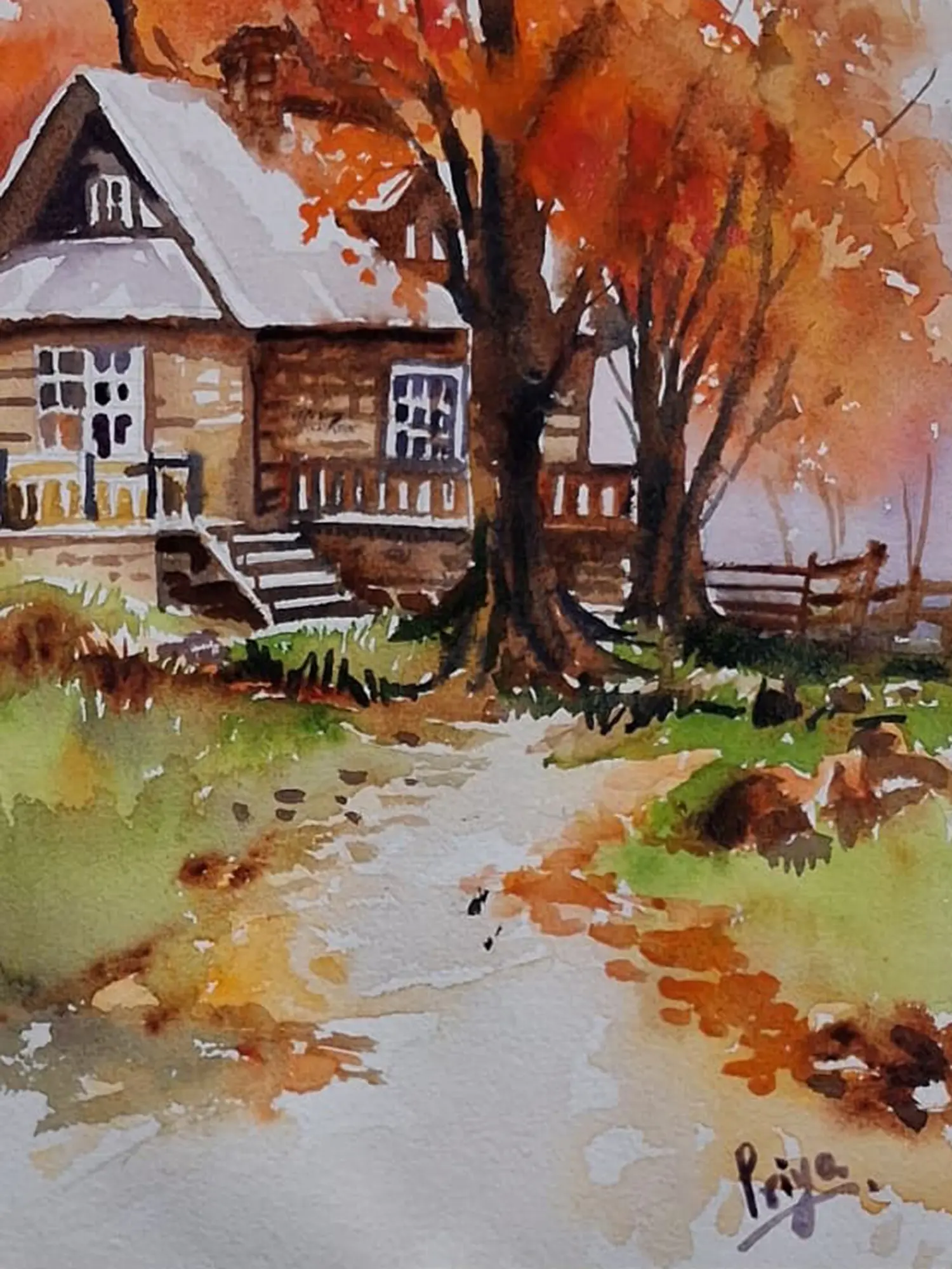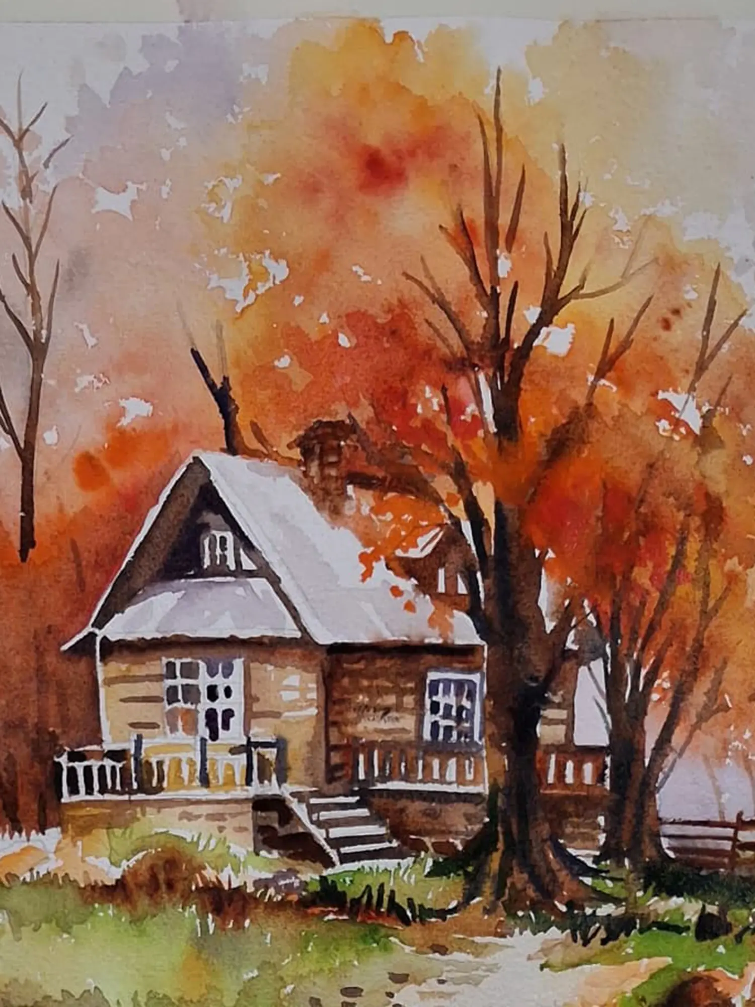 Crafted with meticulous care, this piece is born from the exquisite medium of watercolour on paper. Each stroke is a deliberate dance, allowing the pigments to blend and bleed with a delicate transparency that only watercolours can achieve. You'll appreciate the artist's masterful control, coaxing forth vibrant autumn foliage and the textured charm of the wooden cabin with a fluidity that feels both organic and intentional. The paper itself, chosen for its ability to capture and hold the luminous quality of the paints, serves as a perfect canvas for this ephemeral scene.