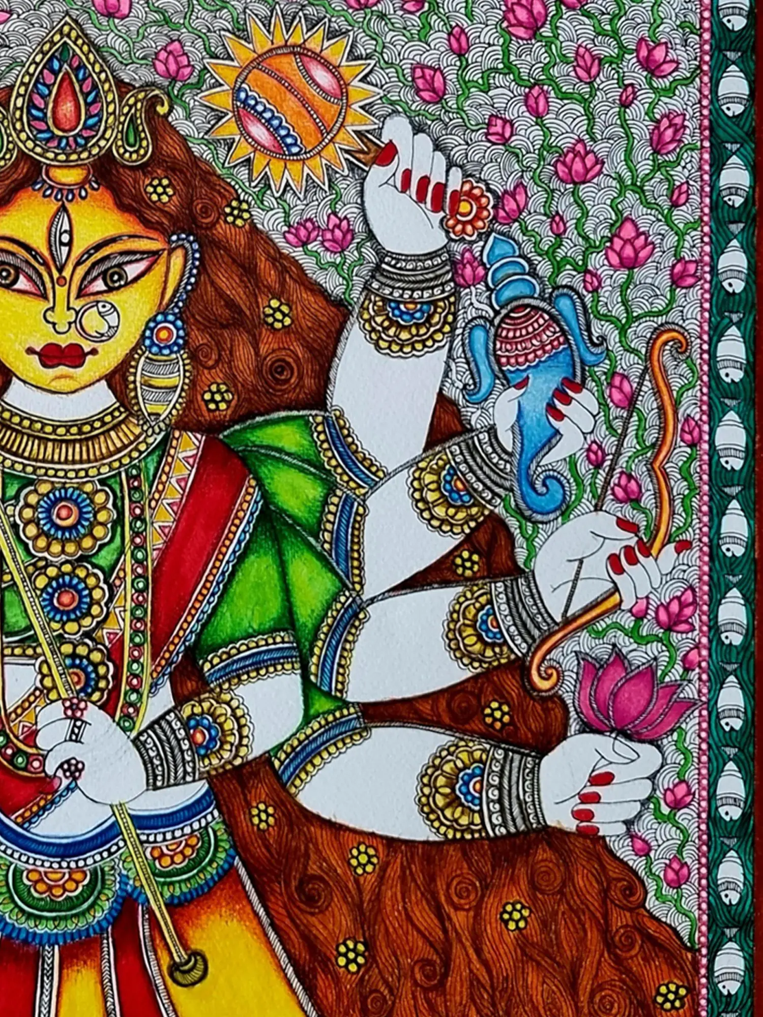 This artwork draws inspiration from the powerful and multifaceted goddess Durga, a paramount figure in Hindu mythology revered as the slayer of demons and protector of the universe. The circular depictions surrounding the central form represent various manifestations of the divine mother, each embodying distinct attributes and powers. You'll find yourself drawn to the symbolism embedded within each character, a testament to centuries of cultural and spiritual heritage.