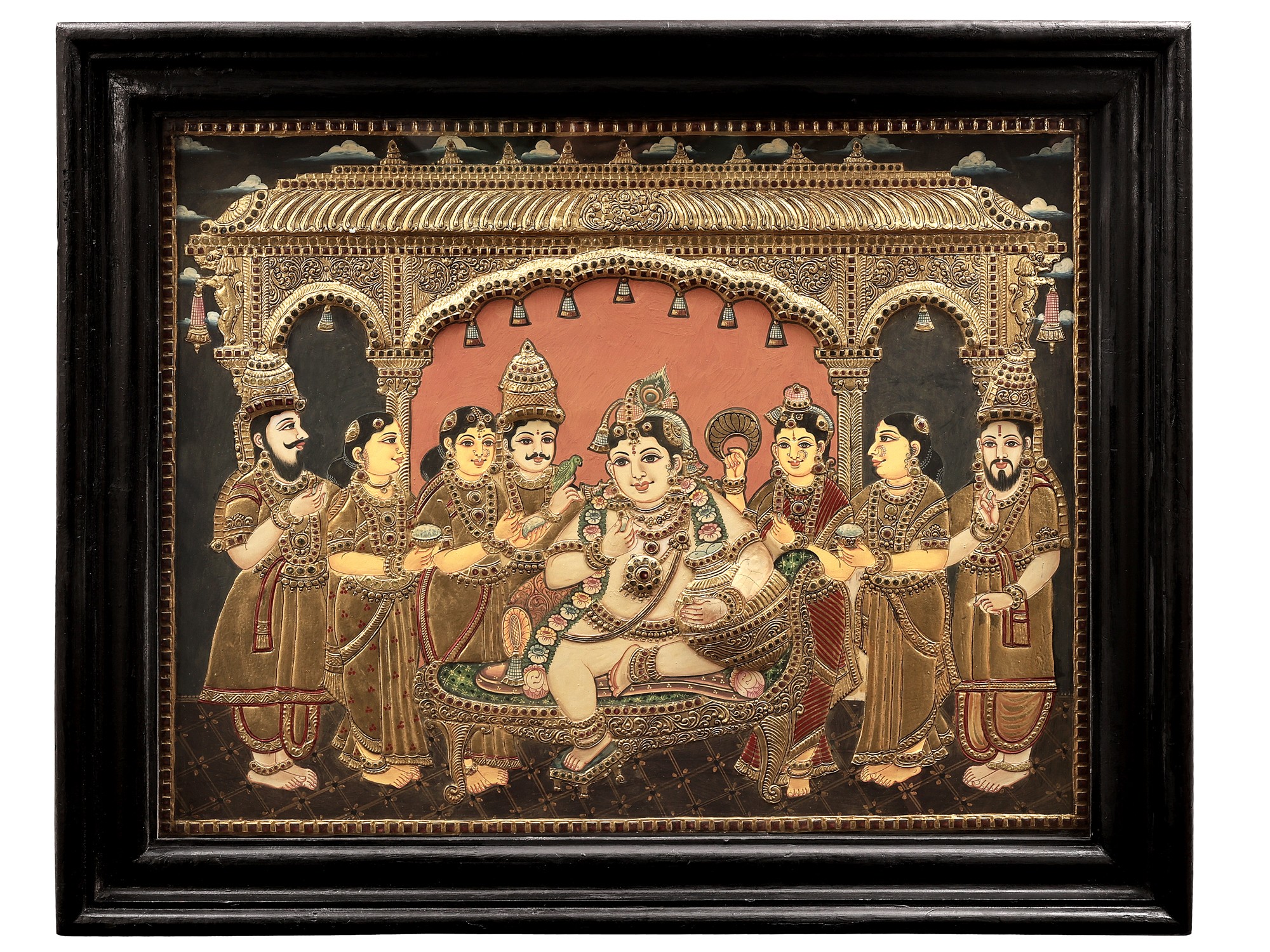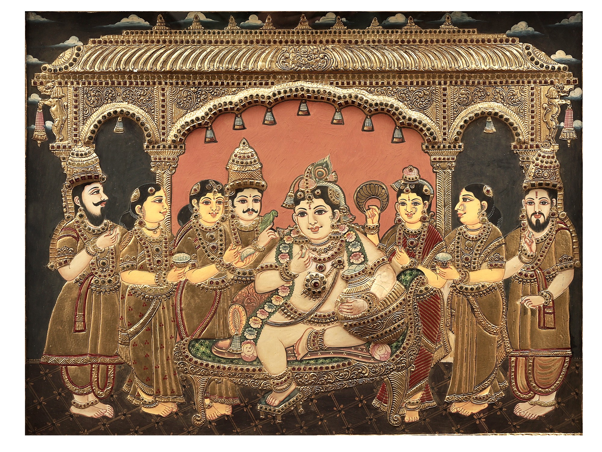 With the whole village gathered and symbolizing the unity of the family, Lord Krishna sits on a chaise lounge in his Navaneetha (Bal Krishna) form. He is the physical embodiment of innocence and purity. Even in his guilelessness, he was divine and all-knowing. Once, as a kid, Lord Krishna ate mud. When his brother Balrama complained about it to Yashoda, she rushed out to scold him. To clean out his mouth, he had to open his mouth and Yashoda urged him to do so. As he opened his mouth, she was stunned.