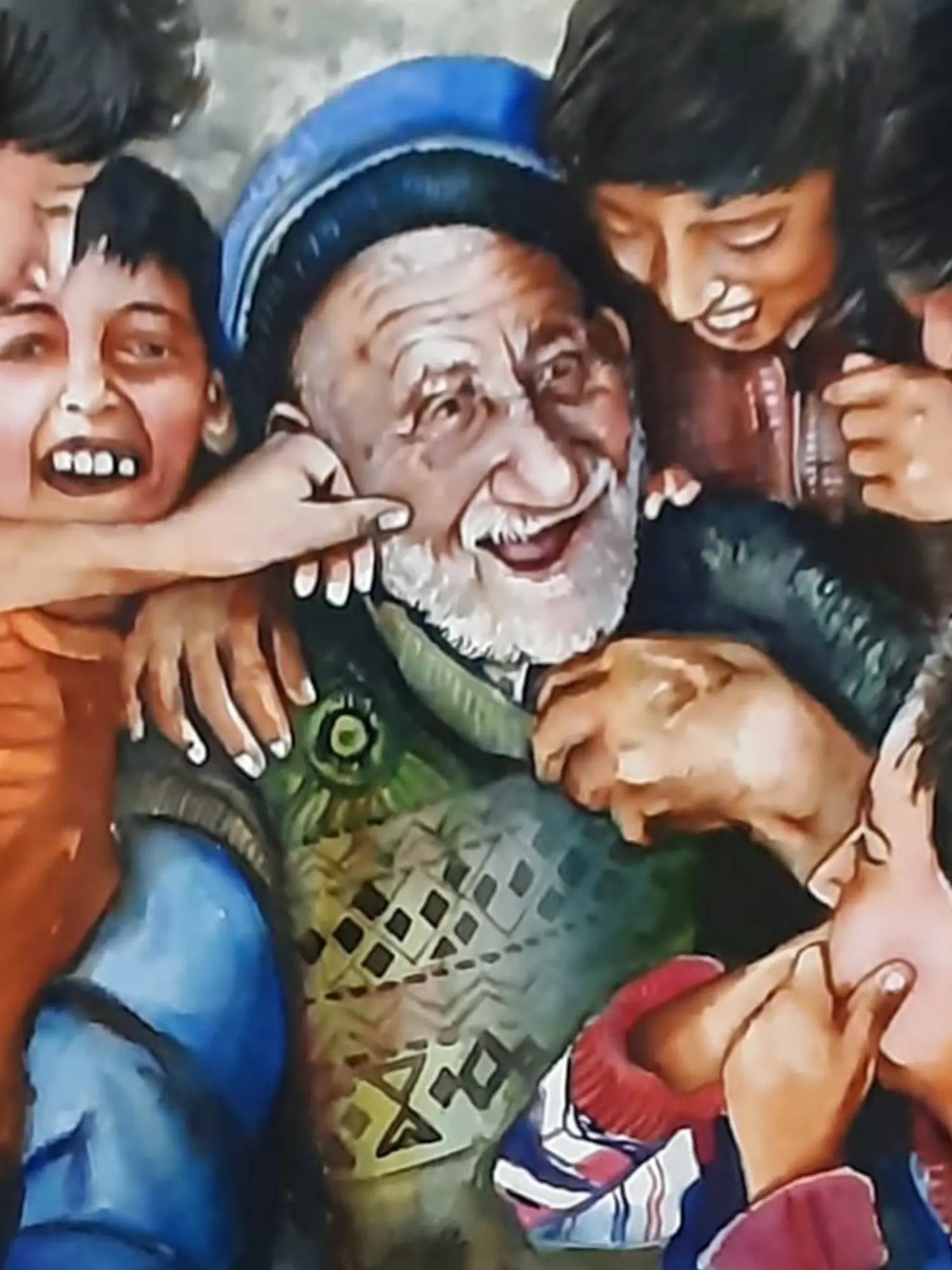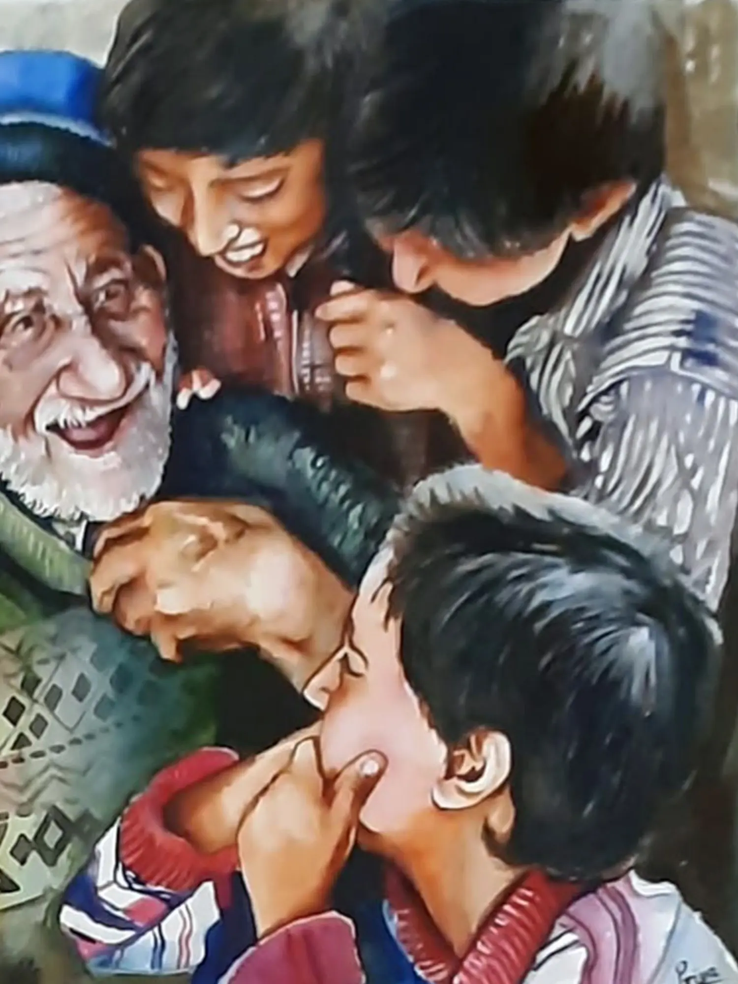 Priya Ghosh's artistic skill shines through in the meticulous detail of each character's expression. The children, a diverse group brimming with youthful energy, are rendered with a tenderness that speaks to the artist's keen eye for observation. Their affectionate gestures towards the elderly man – touching his face, leaning on him – speak volumes about their bond, portraying a depth of emotion rarely captured with such vibrancy. The subtle nuances in the man's weathered features, a testament to a life lived, are equally poignant, revealing a contentment and amusement derived from the children’s company. The overall composition of the piece invites a sense of intimacy, drawing the viewer into the heart of the moment.