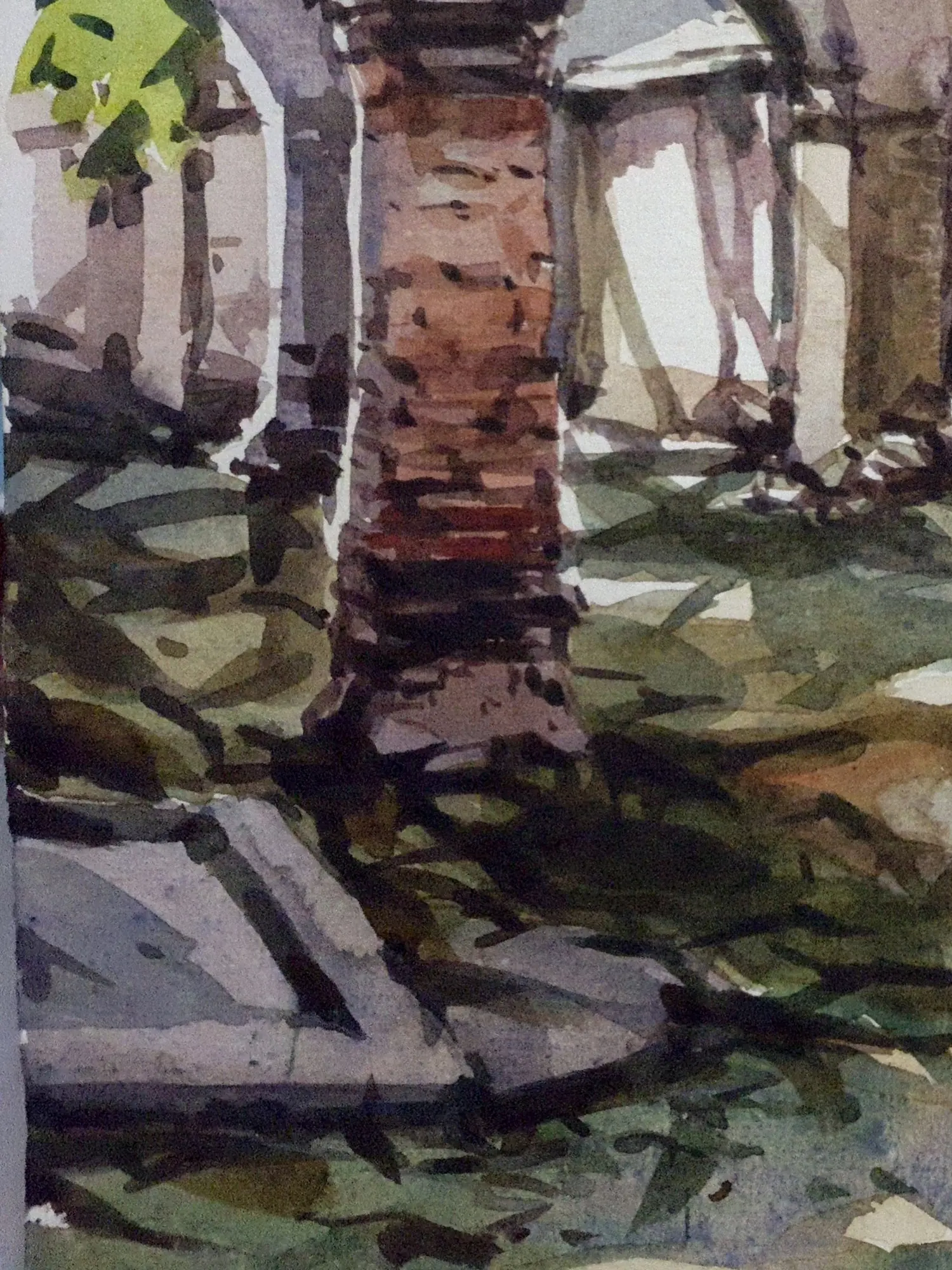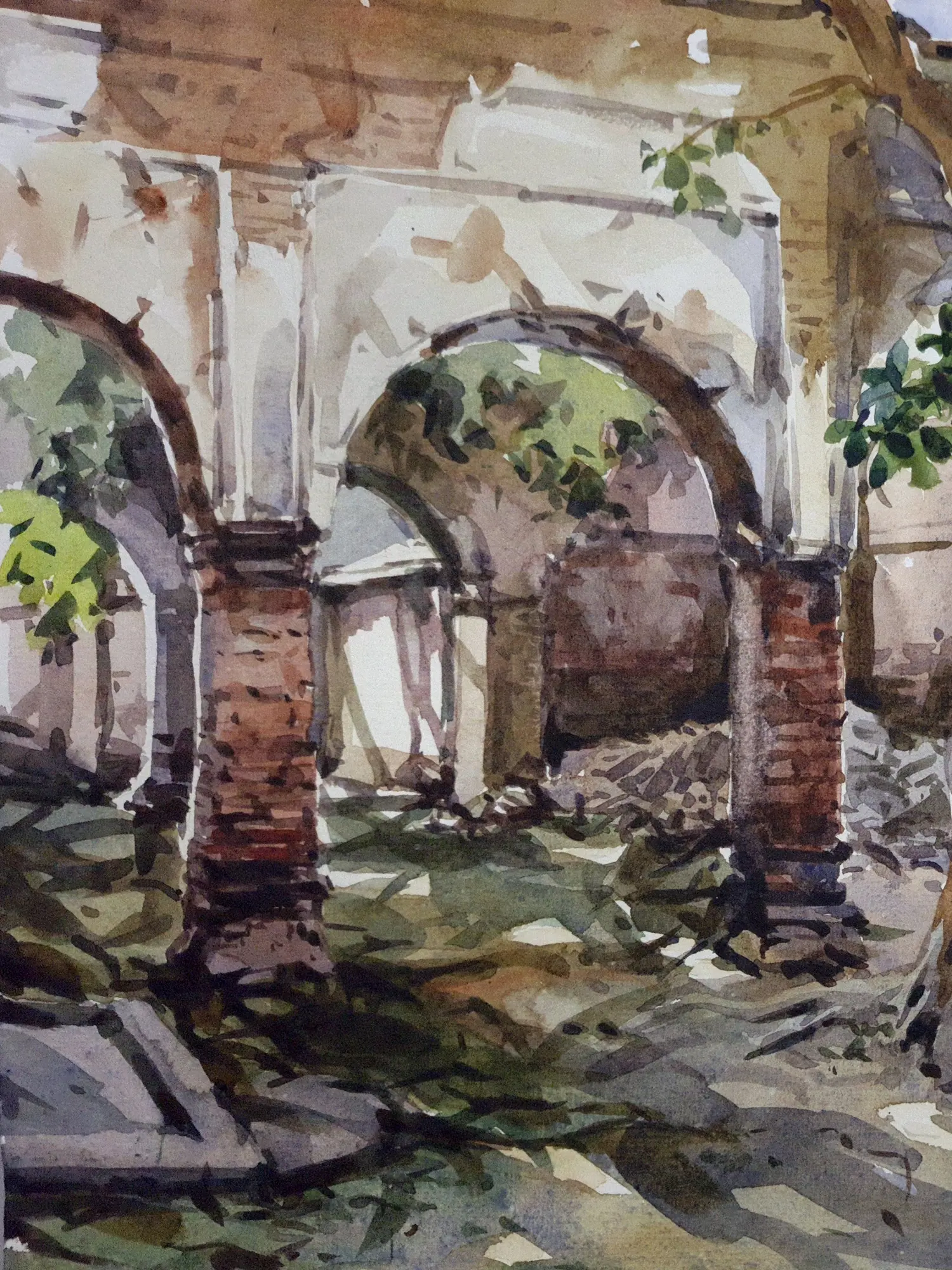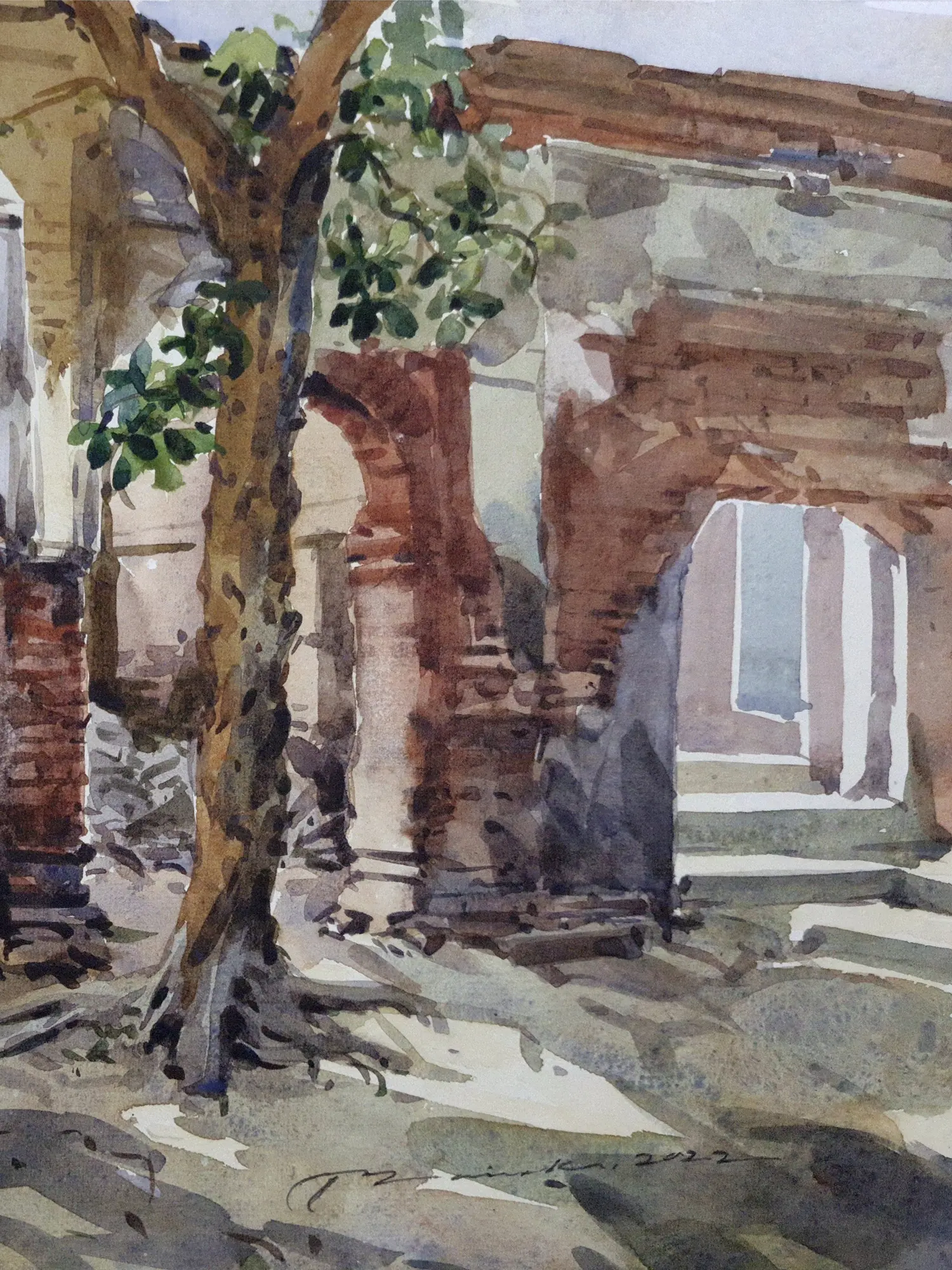 The composition unfolds across 11 by 14 inches, a thoughtfully chosen canvas that allows for an intimate yet expansive viewing experience. You'll be drawn to the interplay of organic forms, such as the weathered tree, against the structured geometry of the ancient arches. The artist skillfully utilizes a palette that speaks of earth and time, evoking a sense of quiet decay and enduring beauty. The subtle rendering of light filtering through the ruins adds a dynamic element, creating an almost tangible atmosphere.