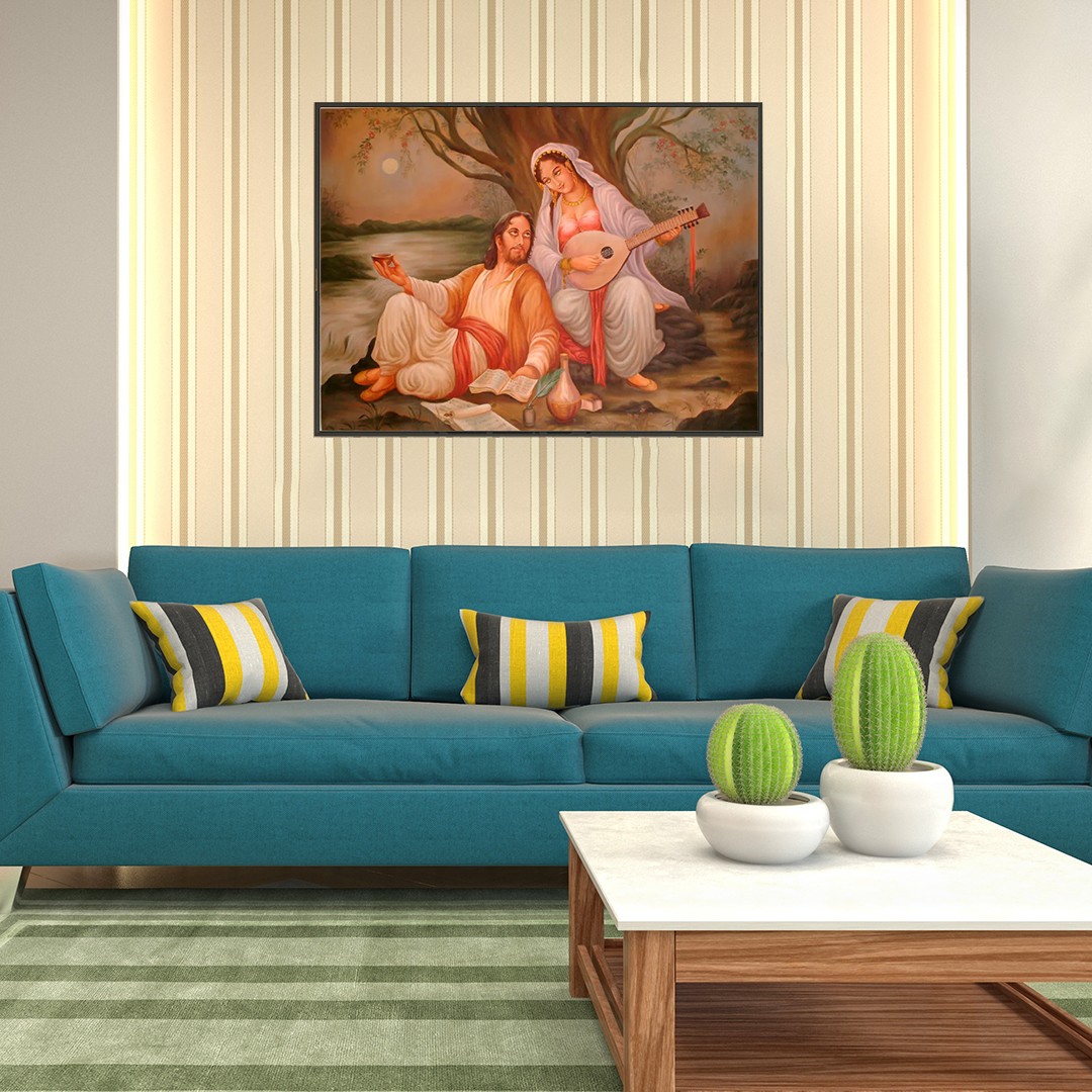 Oil on canvas is the only medium that offers means to represent reality realistically. And together with the Safavid visual vocabulary, the artist has created a masterpiece. Oman Khayyam, born in Iran in the late 11th century is the main protagonist of this painting. He was an astronomer and mathematician at the royal court but he is best known for his poetry. Wine and women formed an integral part of the poet's life. Seen here with Omar Khayyam is a beautiful woman strumming the strings of the instrument, providing him inspiration.