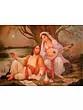 He has a cup of wine in one hand as he holds the manuscript in he other, reading out the stanzas to her. A jar of ink with a feather stylus dipped in it sits next to the wine casket. If the inebriating effect of wine, woman and poetry wasn't enough, there is the moonlit night, with moonbeams falling on the stream. The colour palette of the background, the delicate flowers, the softly undulating hills, all give the painting an ethereal look.