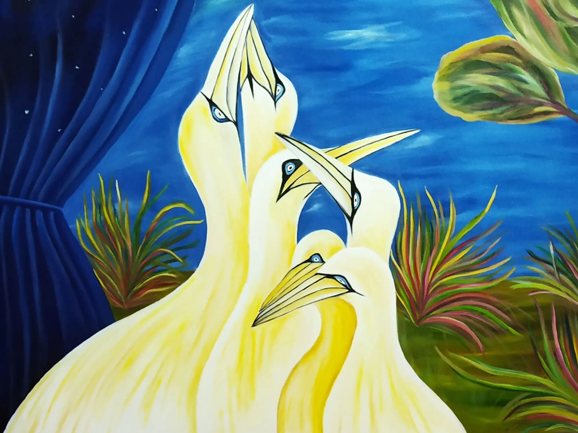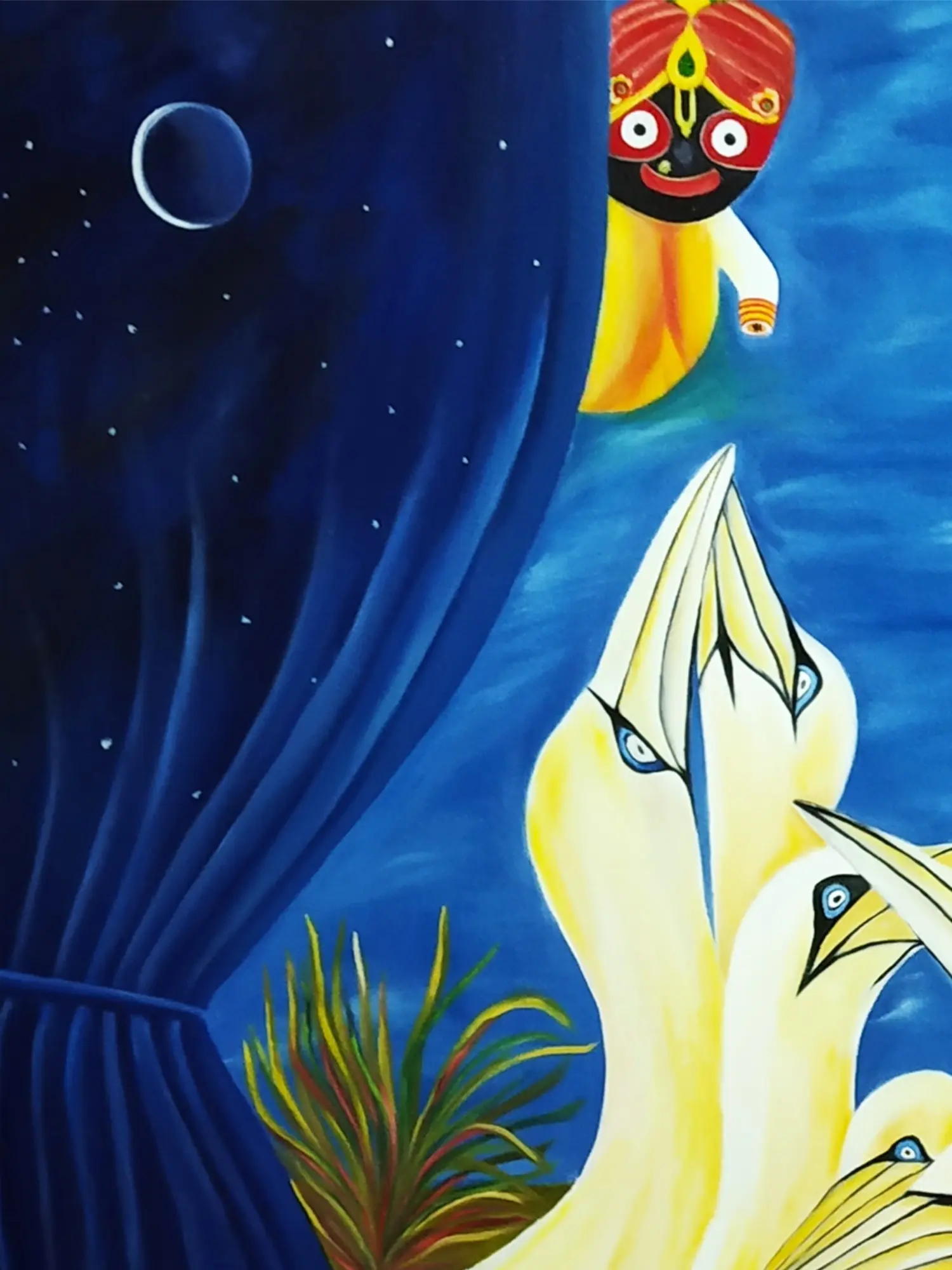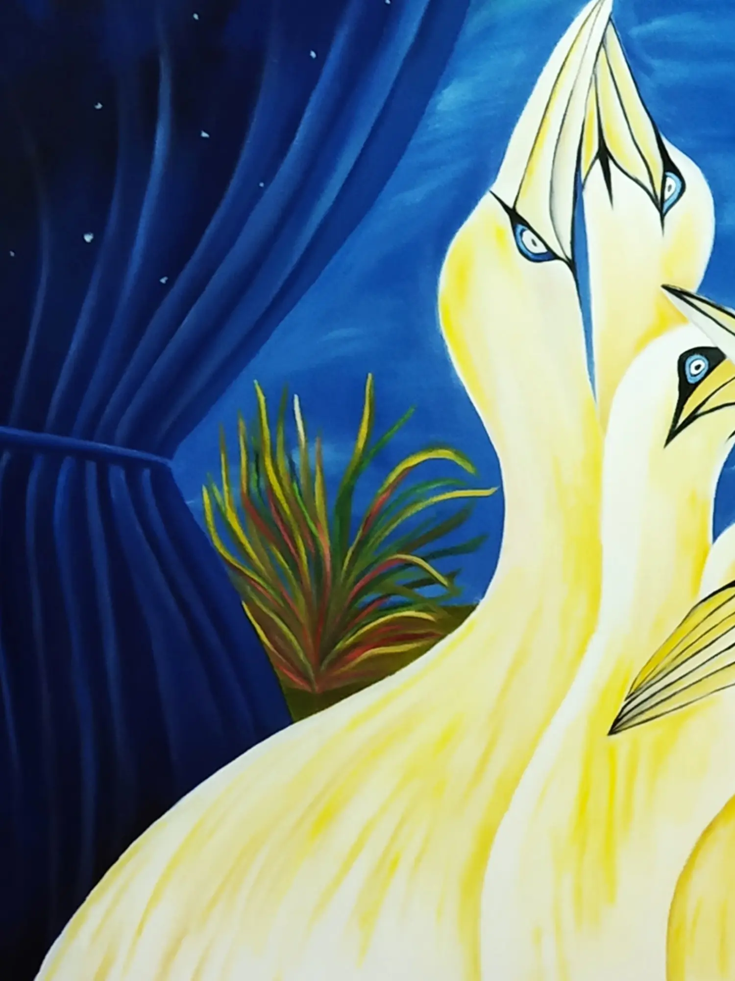 The composition unfolds across a canvas measuring 33.00 inches in height by 29.00 inches in width, a generous expanse that allows the scene to breathe. You'll appreciate the striking contrast between the velvety darkness of the night sky, dotted with celestial bodies, and the radiant glow of the birds. Their elegant forms, rendered in soft yellows and creams, are brought to life by piercing blue eyes, creating a focal point of intense yet peaceful energy. Hints of lush foliage frame the scene, adding a touch of natural splendor to the overarching spiritual narrative.