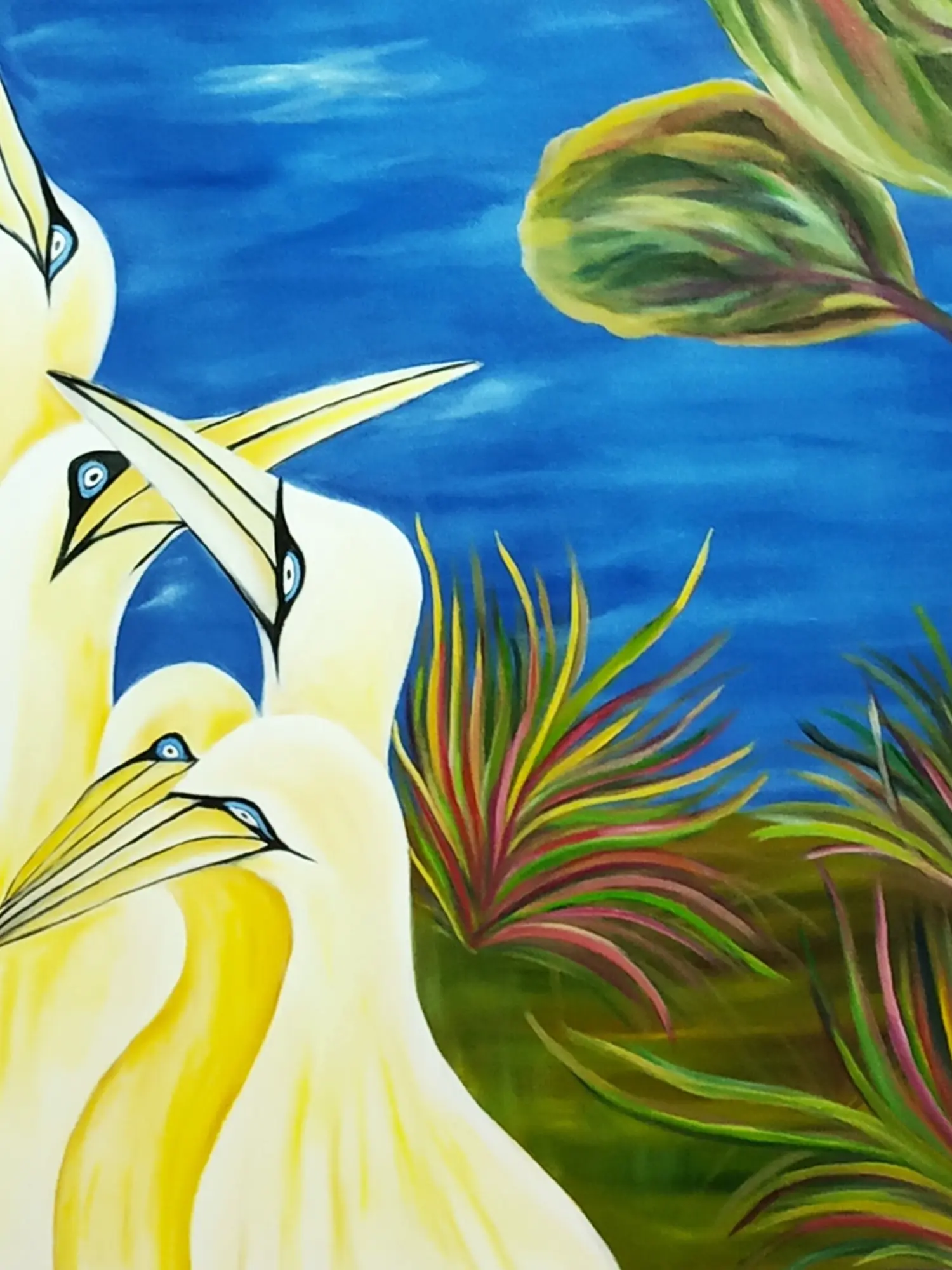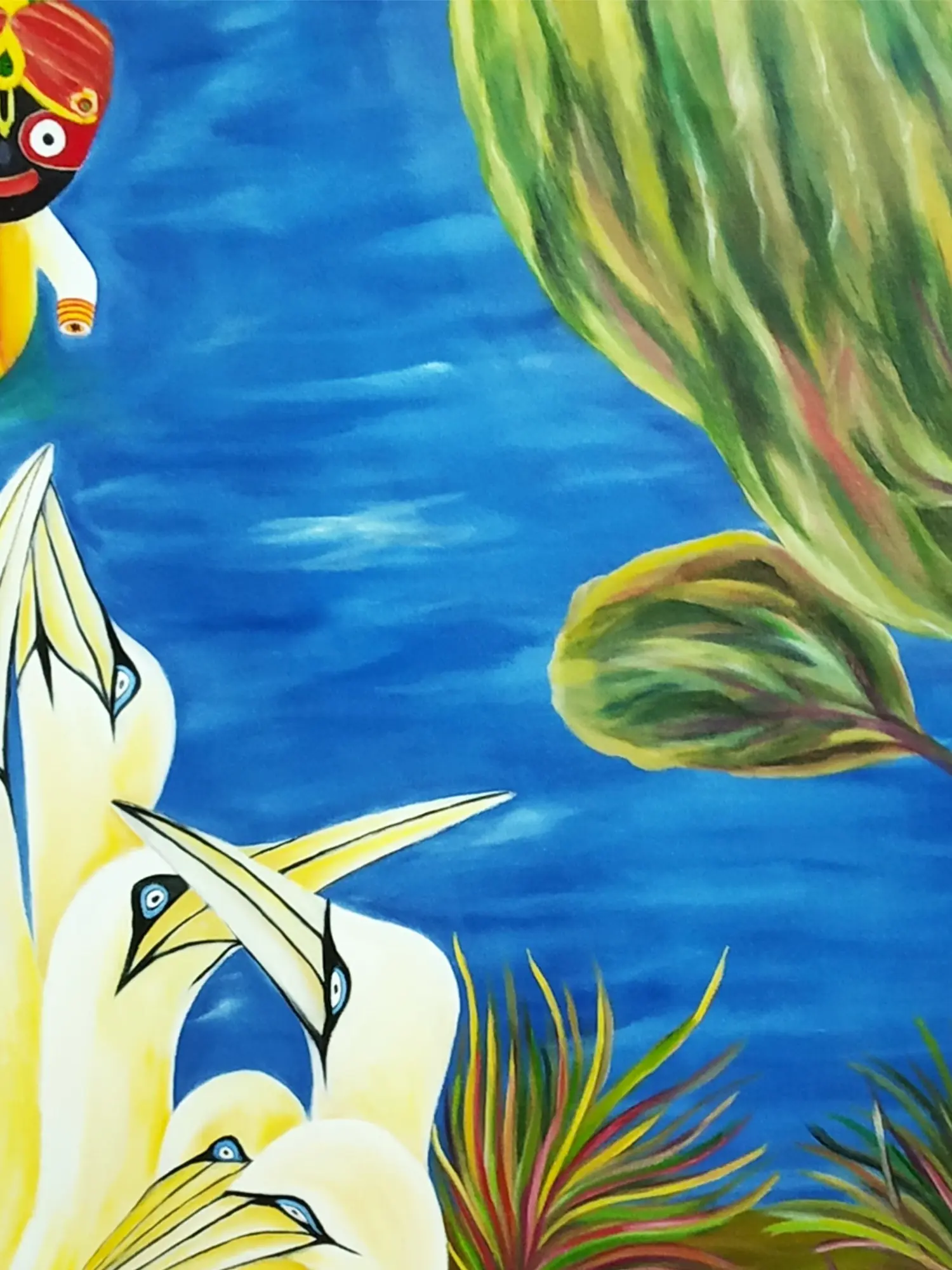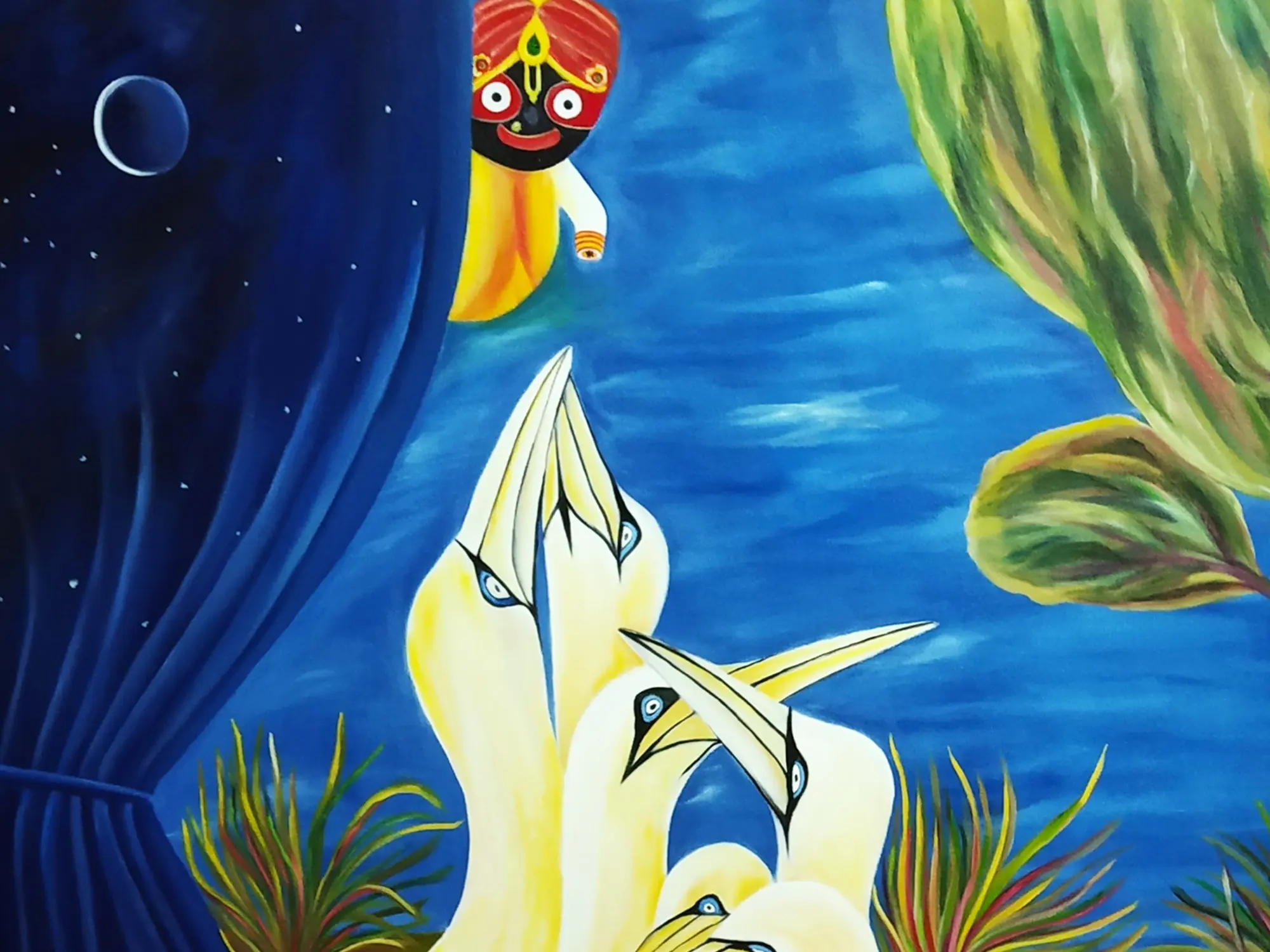 The composition unfolds across a canvas measuring 33.00 inches in height by 29.00 inches in width, a generous expanse that allows the scene to breathe. You'll appreciate the striking contrast between the velvety darkness of the night sky, dotted with celestial bodies, and the radiant glow of the birds. Their elegant forms, rendered in soft yellows and creams, are brought to life by piercing blue eyes, creating a focal point of intense yet peaceful energy. Hints of lush foliage frame the scene, adding a touch of natural splendor to the overarching spiritual narrative.