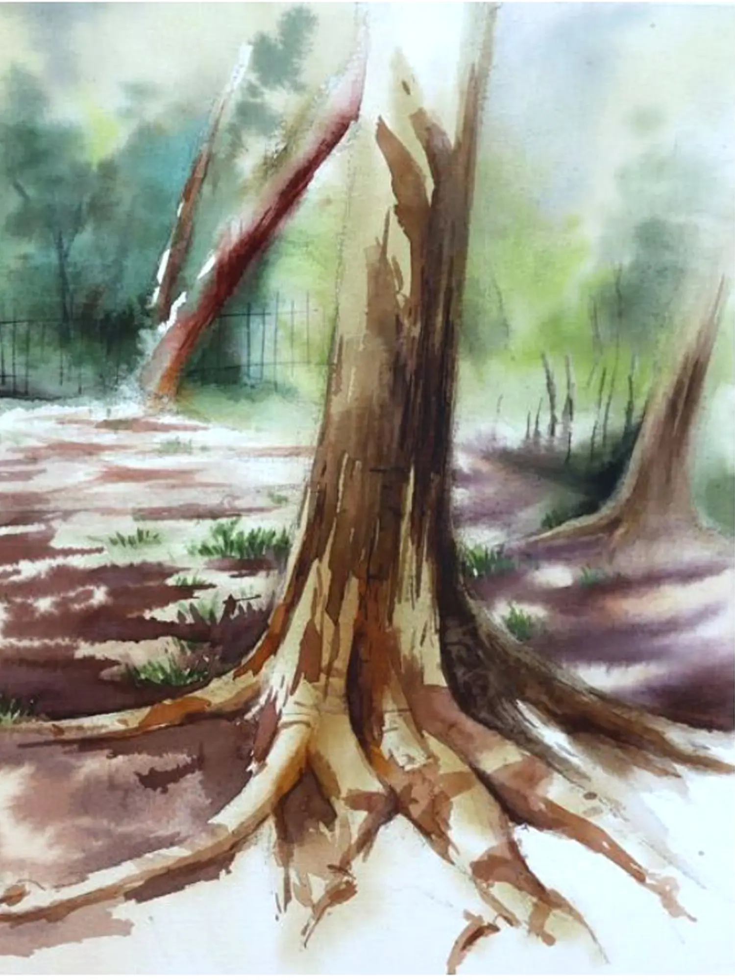 Crafted with exquisite skill using the delicate medium of watercolor, this piece exemplifies the artist's mastery of light and form. Each wash and stroke is carefully considered, allowing the natural luminosity of the paper to shine through, creating an ethereal and nuanced portrayal. The transparent layers build depth and atmosphere, revealing the artist's sensitive hand in every detail, from the textured bark of the trees to the dappled sunlight on the path.