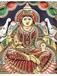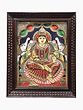 Here, Goddess Gajalakshmi is gracefully seated on a throne in Ardhapadmasana; her right leg placed on the seat of the throne, while the left one goes towards the floor. As she sits in this posture, the pleats of her red saree beautifully spread between her legs. She is flanked by a pure white elephant (gaja) on her either side who raise their trunks above as if honoring the Goddess with all their capacity. Her molten gold complexioned body is bedecked with different gold ornaments and a huge crown on her head represents her exalted position. In each of her two upper arms, she holds a lotus flower, while the lower hands are in the boon granting Varada Mudra and Abhaya Mudra (the hand gesture of fearlessness). A soft and gentle smile on her beautiful face describe her extremely merciful nature towards her devotees. A stream of flow of gold coins pouring down can also be seen. Finally, the Prabhavali surrounding her adds to the beautification of the painting and the rich traditional color combinations make it attractive and unique.