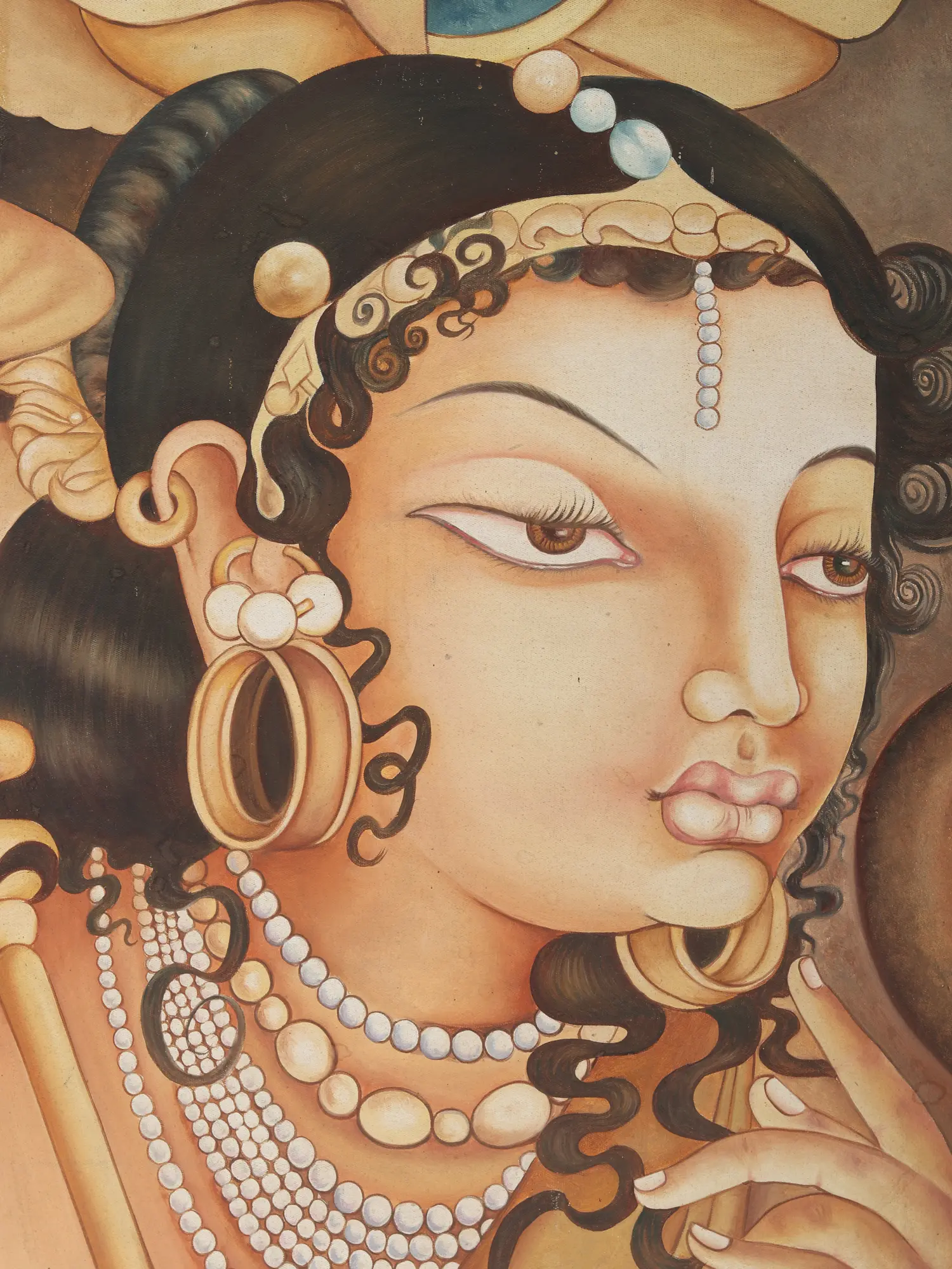 The "Ajanta Lady" framed oil painting is a homage to the iconic frescoes of the ancient Ajanta Caves. The lady's visage is depicted with an eloquent expression, her eyes brimming with a narrative as old as time. Adorned with classical jewelry that echoes the regal Indian heritage, her persona is a celebration of antiquity and mythology. Each brushstroke on this canvas is a testament to the mastery of oil painting, capturing the ethereal beauty and mystique associated with the historic Ajanta artworks. This framed piece is not merely a painting; it is a slice of history, a conversation starter, and a treasure for any art lover looking to enrich their collection with a piece that resonates with cultural depth and artistic brilliance. It's ideal for those who appreciate art that tells a story and serves as a stunning focal point in any space.