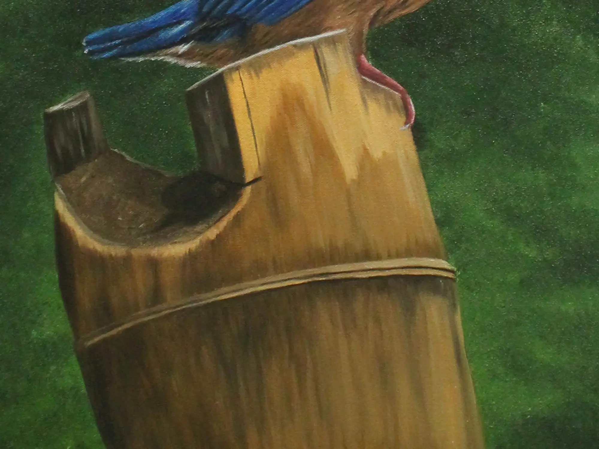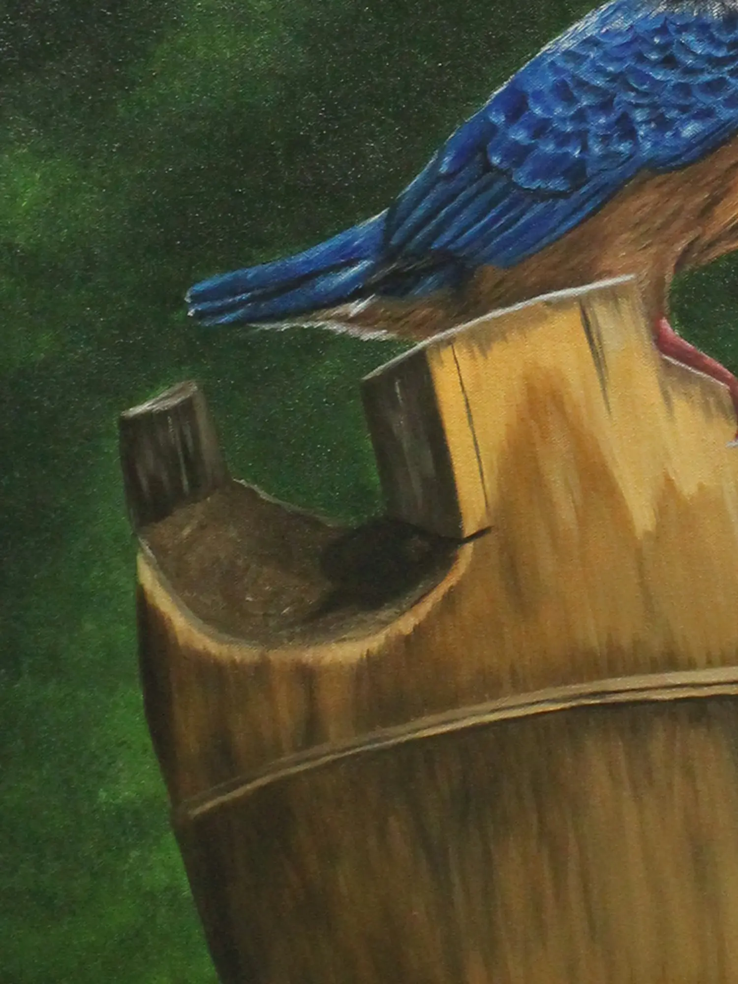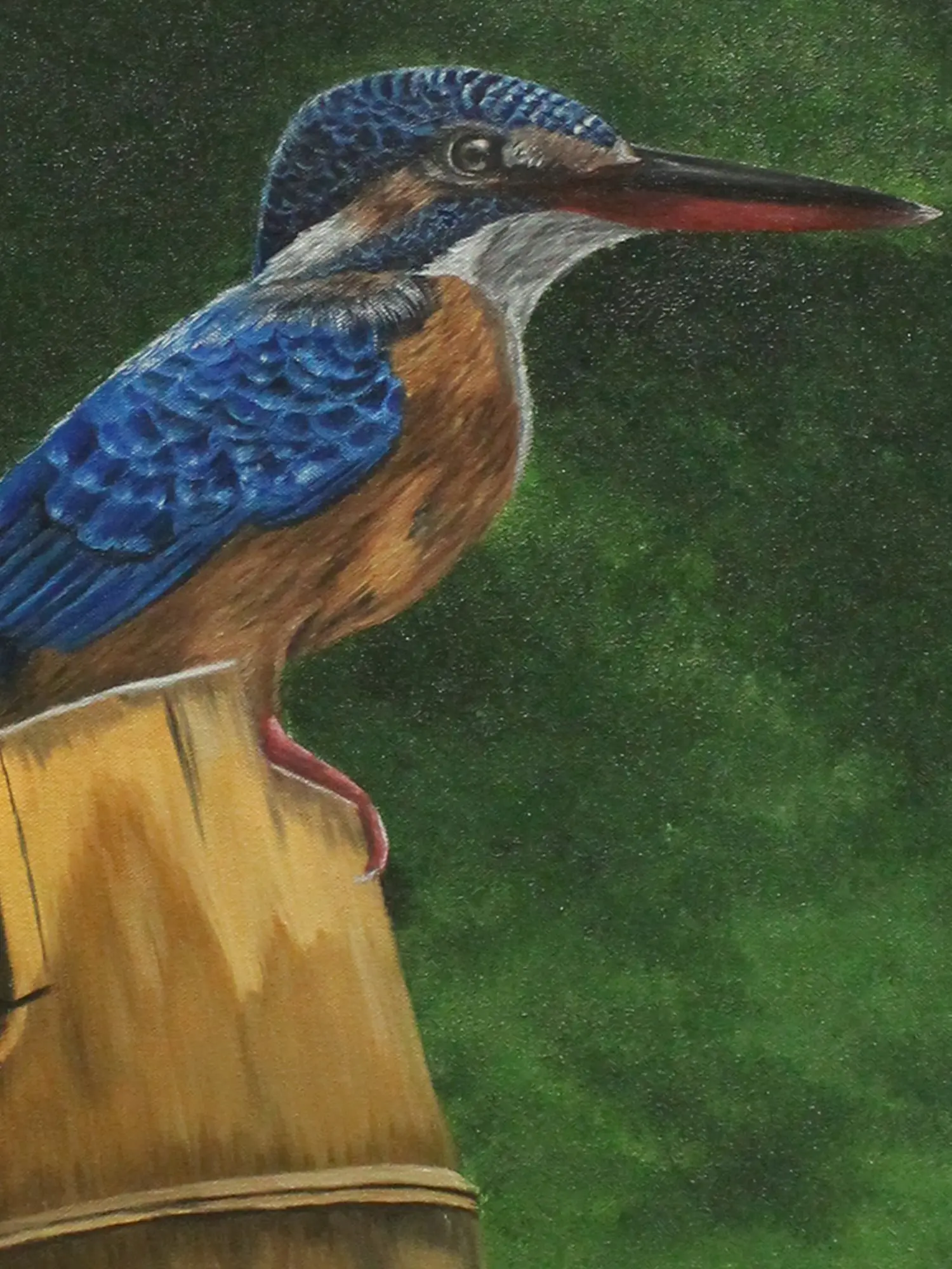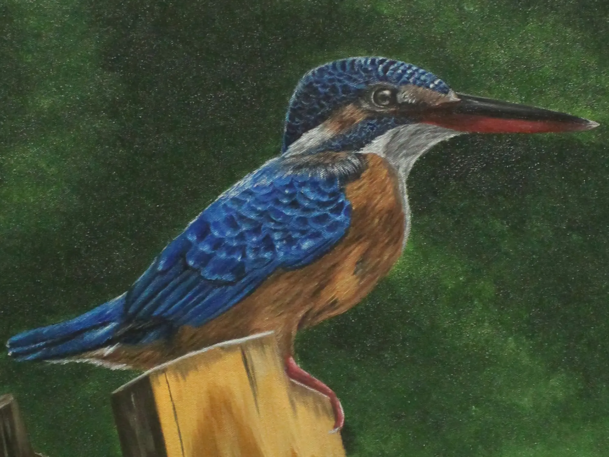 The Kingfisher, a frequently traveling bird is often regarded as the Nomad Bird. It is believed to be lucky to spot a Kingfisher. The blue color of the bird gives it a beautiful look and people become happy to spot one of these birds. This painting titled "The King of Fishers" by Karthik, is an oil on canvas marvel, celebrating the majesty of the kingfisher. The bird is shown sitting peacefully with a serene background. The dark green background gives a contrasting look to the blue body of the bird. With vibrant hues and intricate details, the artwork portrays the bird's regal pose and radiant plumage. With this painting, the artist wants to bring a beautiful image of nature balancing the colors among its elements.