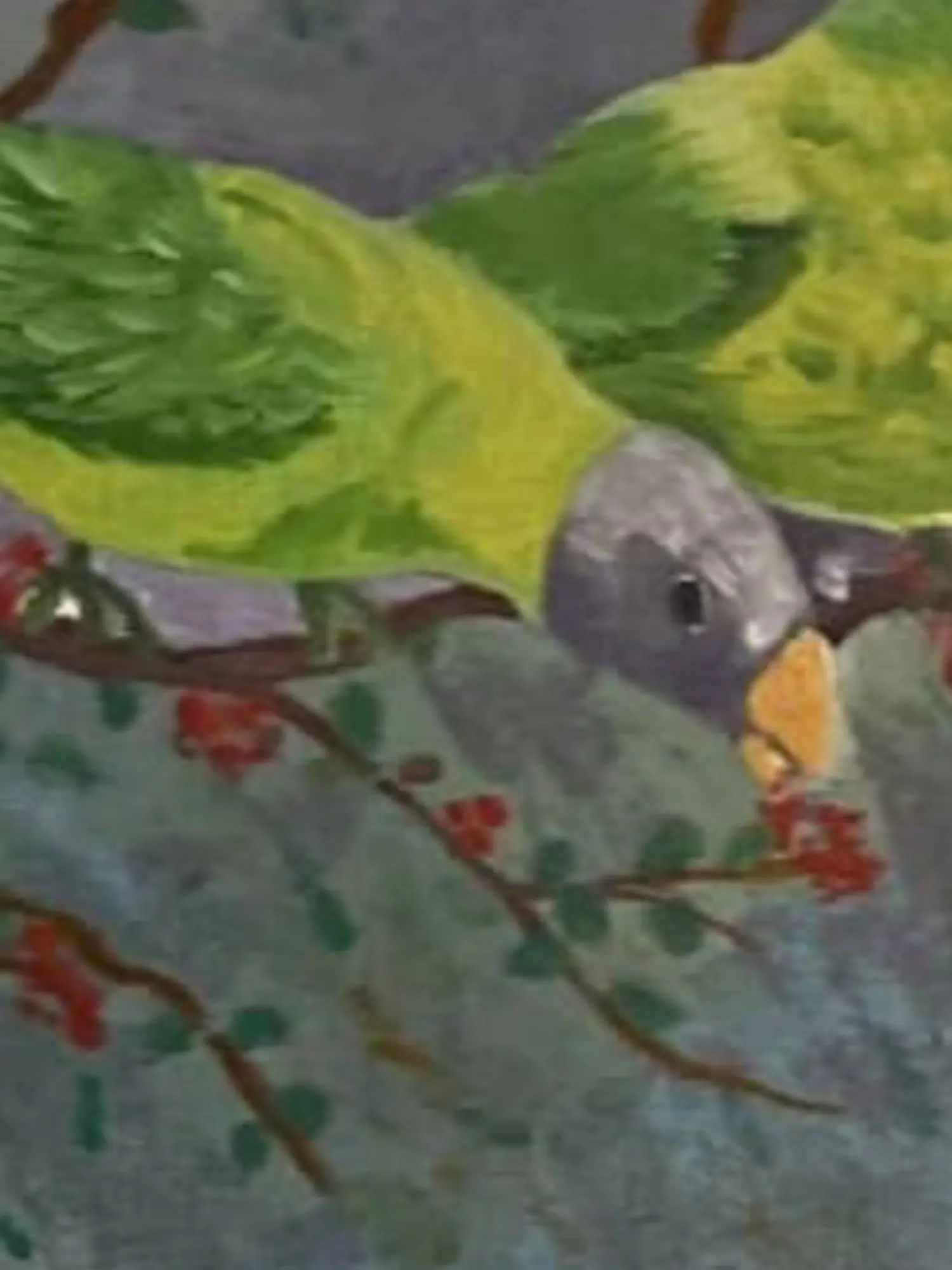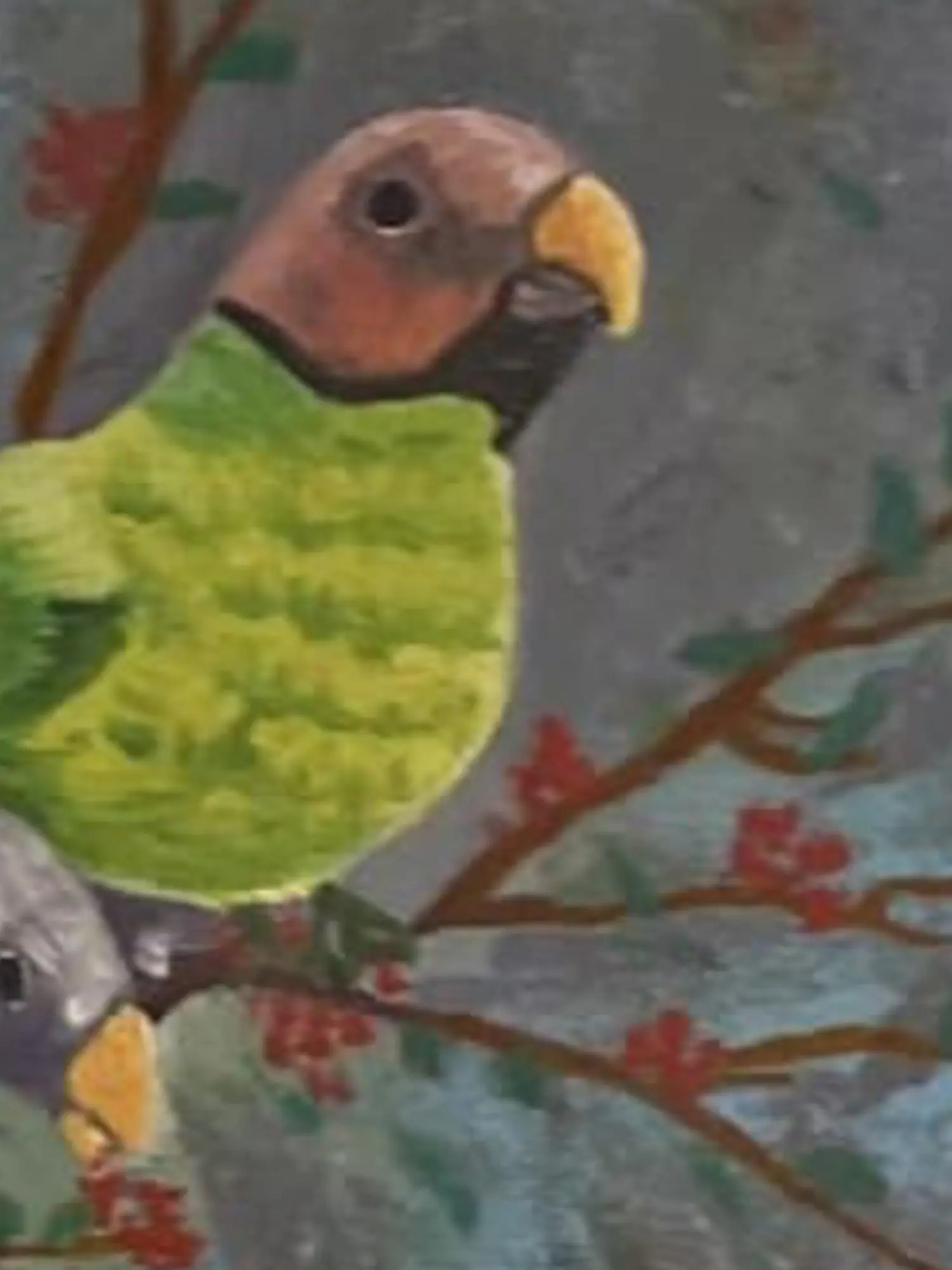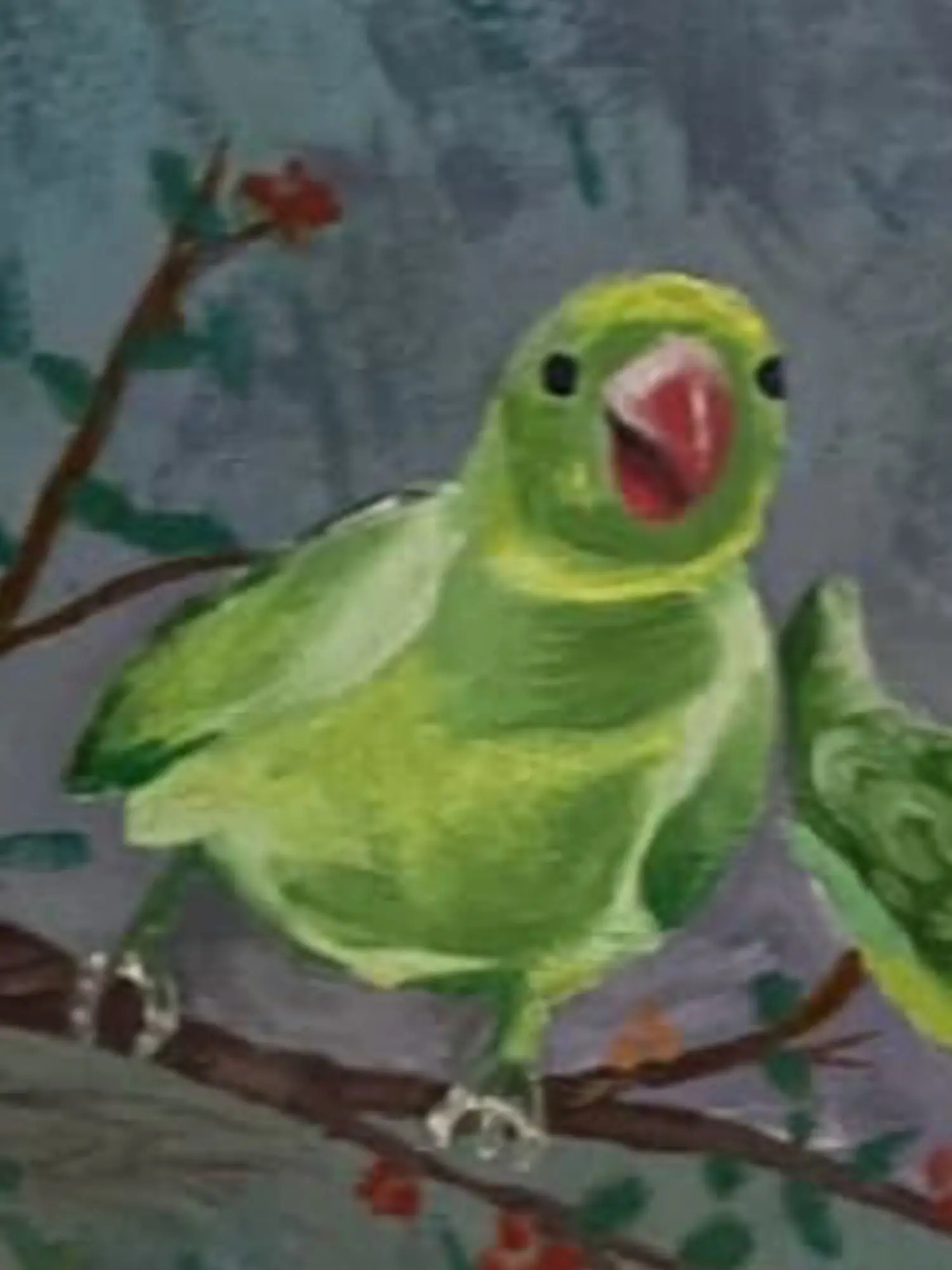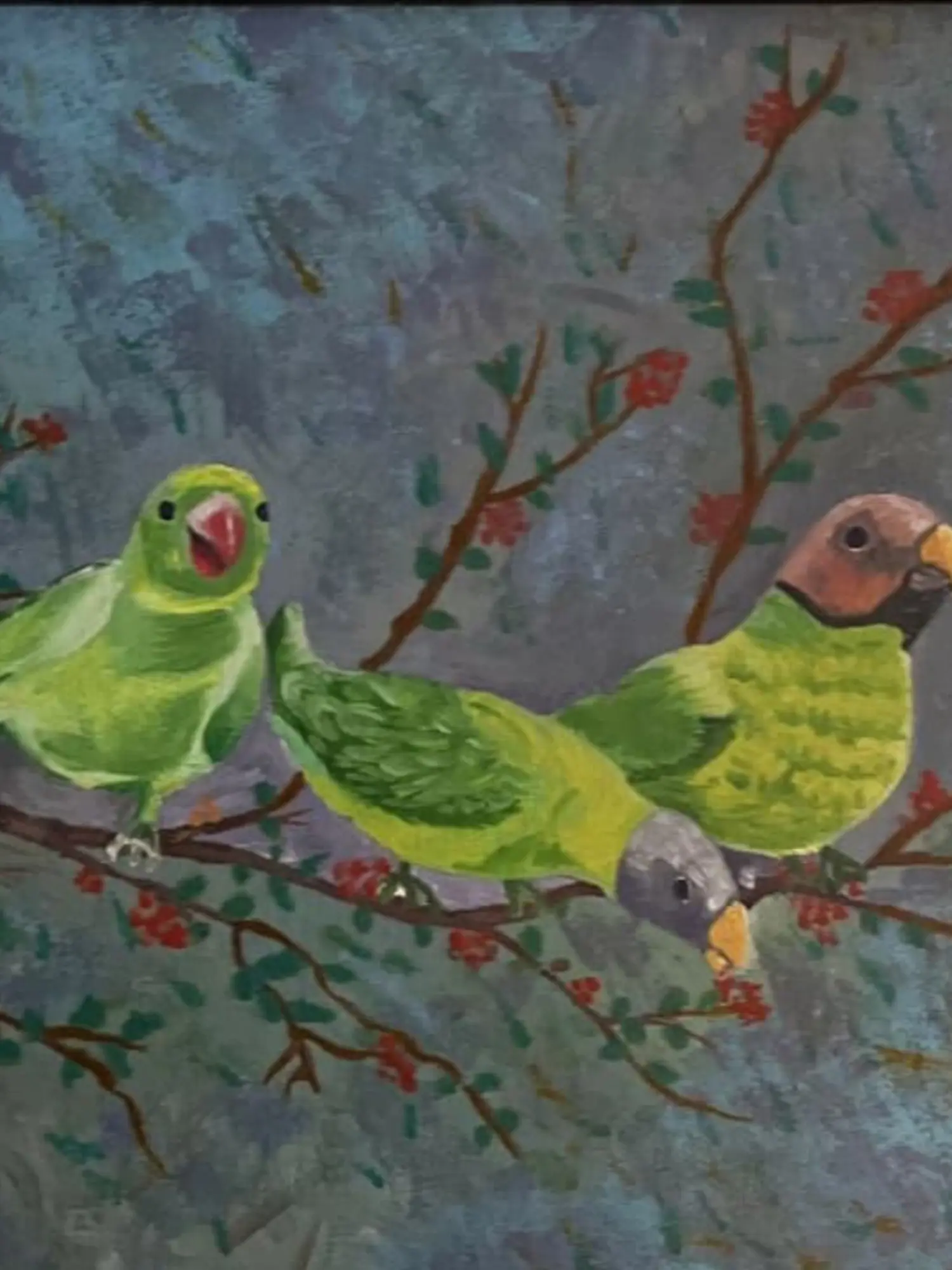 The background shading adds depth, creating a cheerful and harmonious composition. Gupta's art not only celebrates the beauty of wildlife but also subtly conveys symbolic richness, making "Parrots on the Branch" a captivating and thought-provoking addition to any art enthusiast's collection.