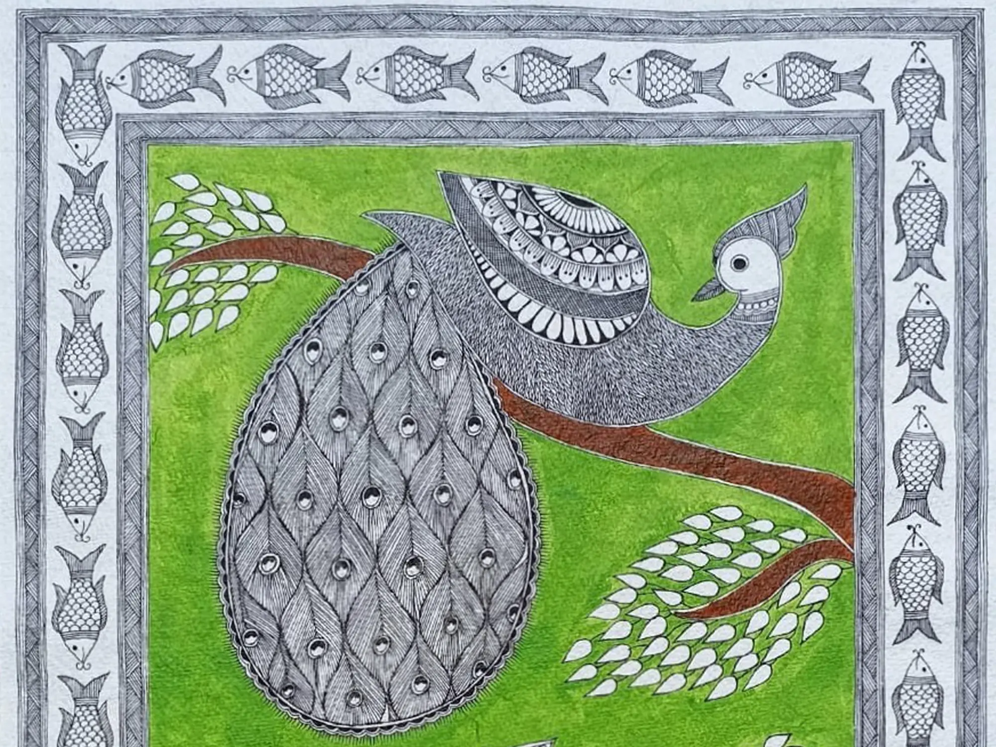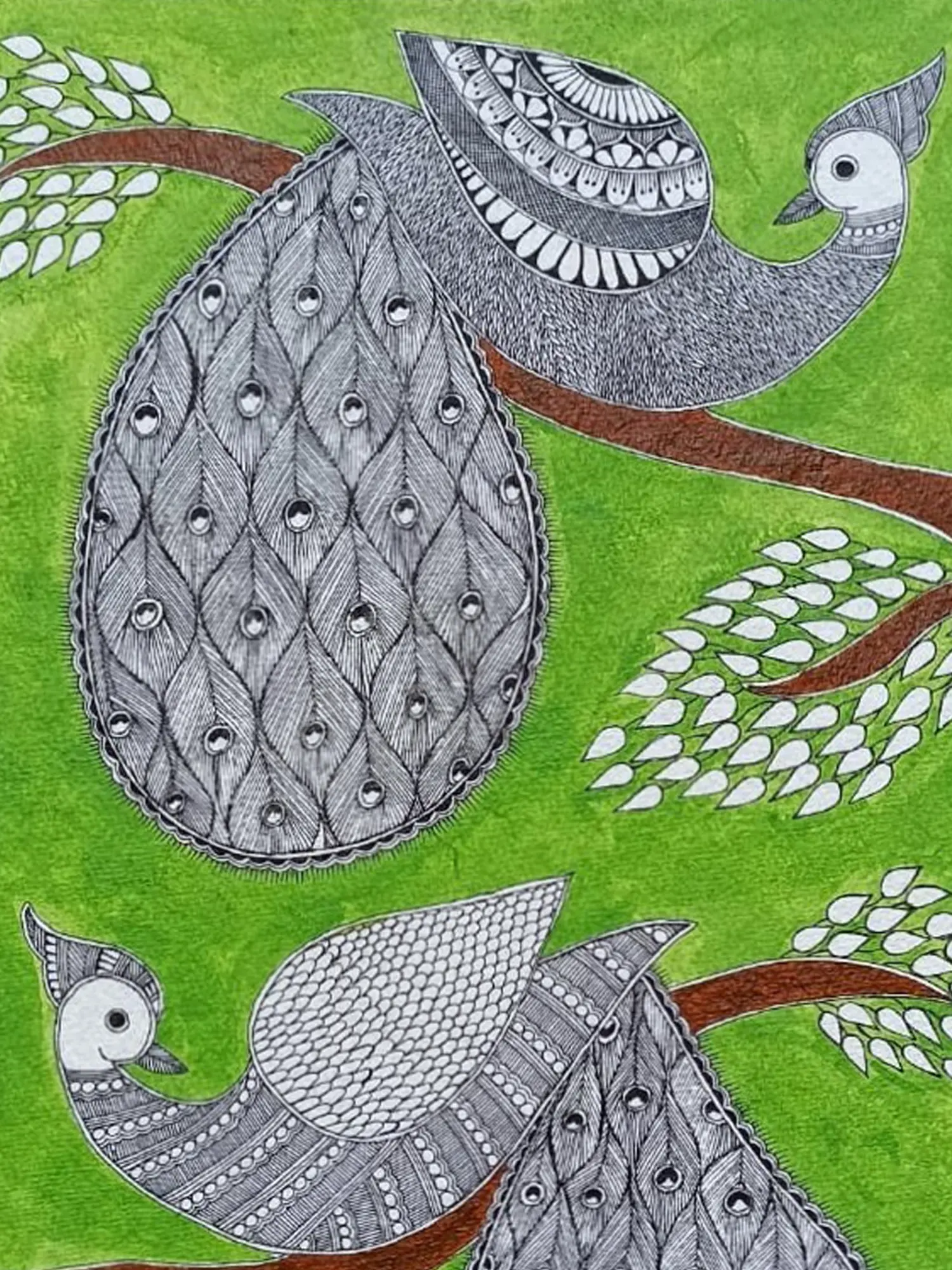 Celebrate the rhythm of nature with Mayuras in Varsha Ritu where vibrant hues and graceful forms herald the arrival of the monsoon season. Against a backdrop of lush greenery and rain-kissed foliage, peacocks settle in joyous abandon, their resplendent plumage shimmering in the gentle light. Each brushstroke captures the essence of renewal and vitality, inviting you to revel in the beauty of the natural world.