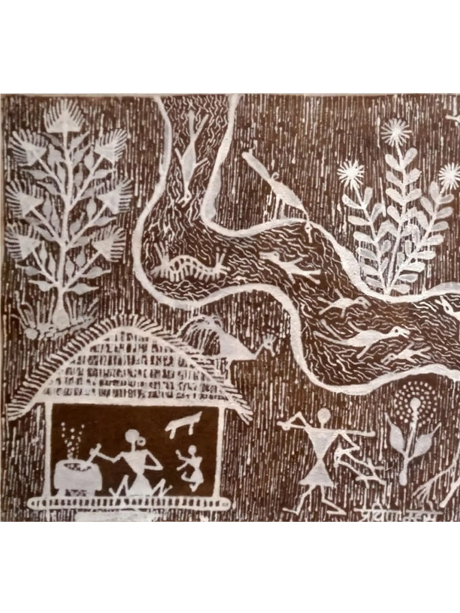 The dark green base showcases the rural life and the daily activities of people residing in the area with the help of motifs made of white acrylic paint. The river meanders through the village, depicted with earthy tones and organic textures. The use of cow dung adds a cultural richness while acrylic enhances vibrancy. Mhase's composition becomes a testament to the symbiotic relationship between nature and rural life, celebrating the artist's ingenuity in merging unconventional materials with a timeless portrayal of scenic serenity and traditional ethos.