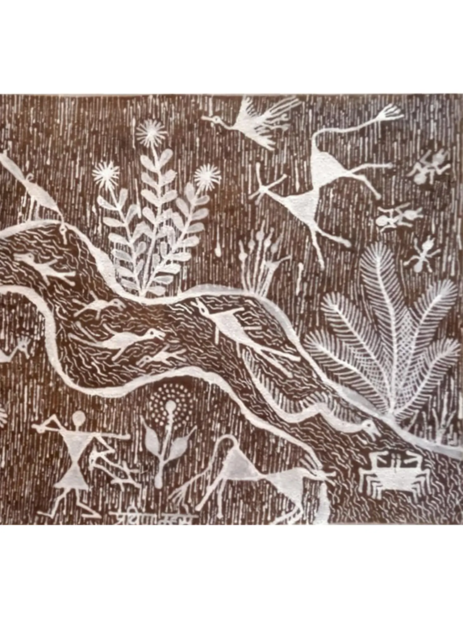 Pravin Mhase is a known artist of Warli. He was born into the famous Mhase family known for revving the Warli art. This Painting of River Flowing in the Village is a traditional Warli art made traditionally with Cow Dung and Acrylic on Manjarpat Cloth. Manjarpat is a low-quality, muslin-like cloth. It has limited absorbency and shrinks after washing. It is believed to be the best cloth for absorbing cod dung and making the canvas. The painting is highly traditional and holds a community emotion into it.