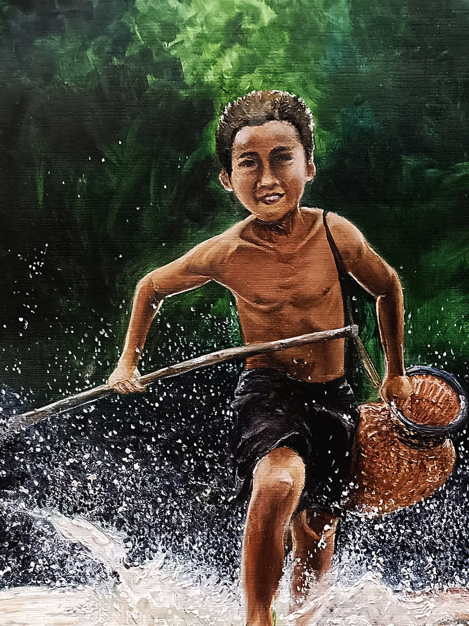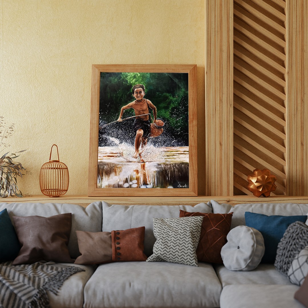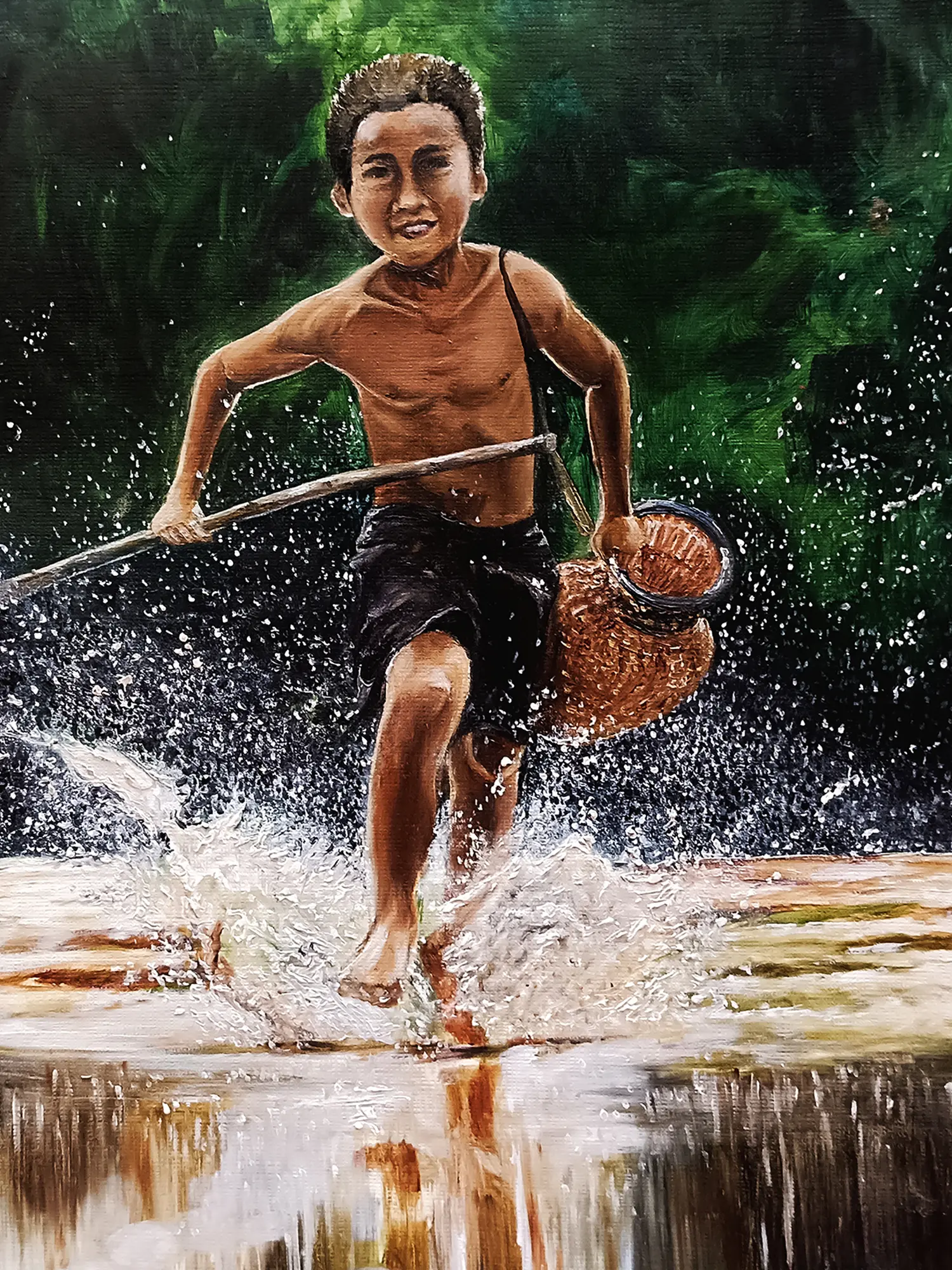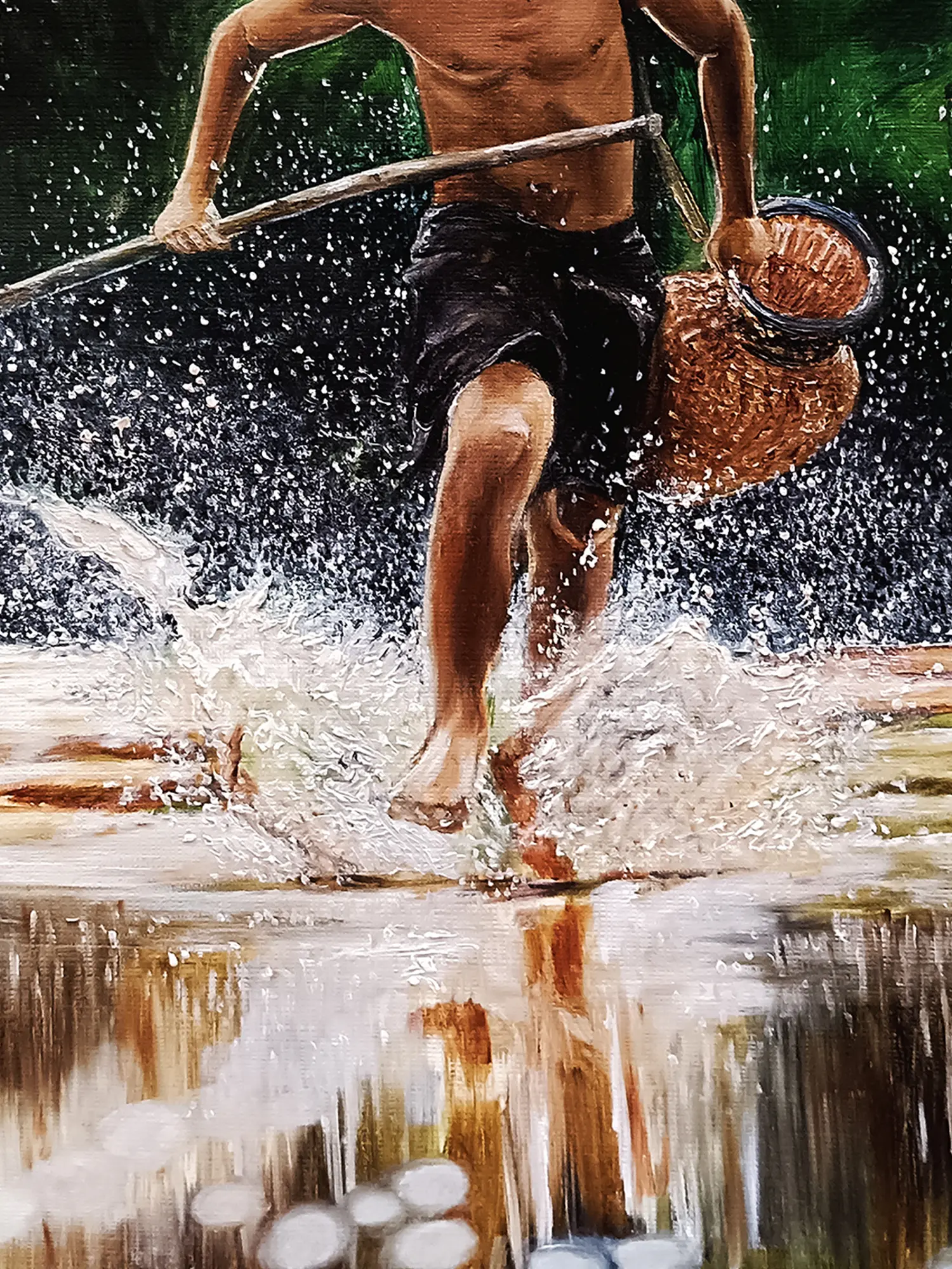 Souvik Hazra's dynamic Oil on Canvas portrait pays homage to the unrestrained energy and innocence inherent in childhood. The painting captures a child's exuberance as he joyfully runs on water, traditional fishing net in hand. Hazra's skillful depiction showcases the boy's stretched muscles, and the detailed splashes of water evoke a palpable sense of movement.