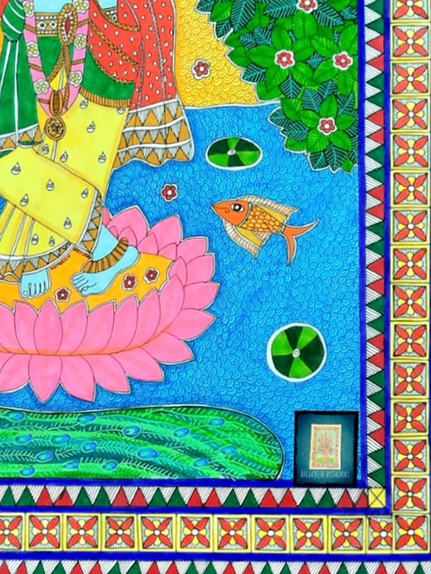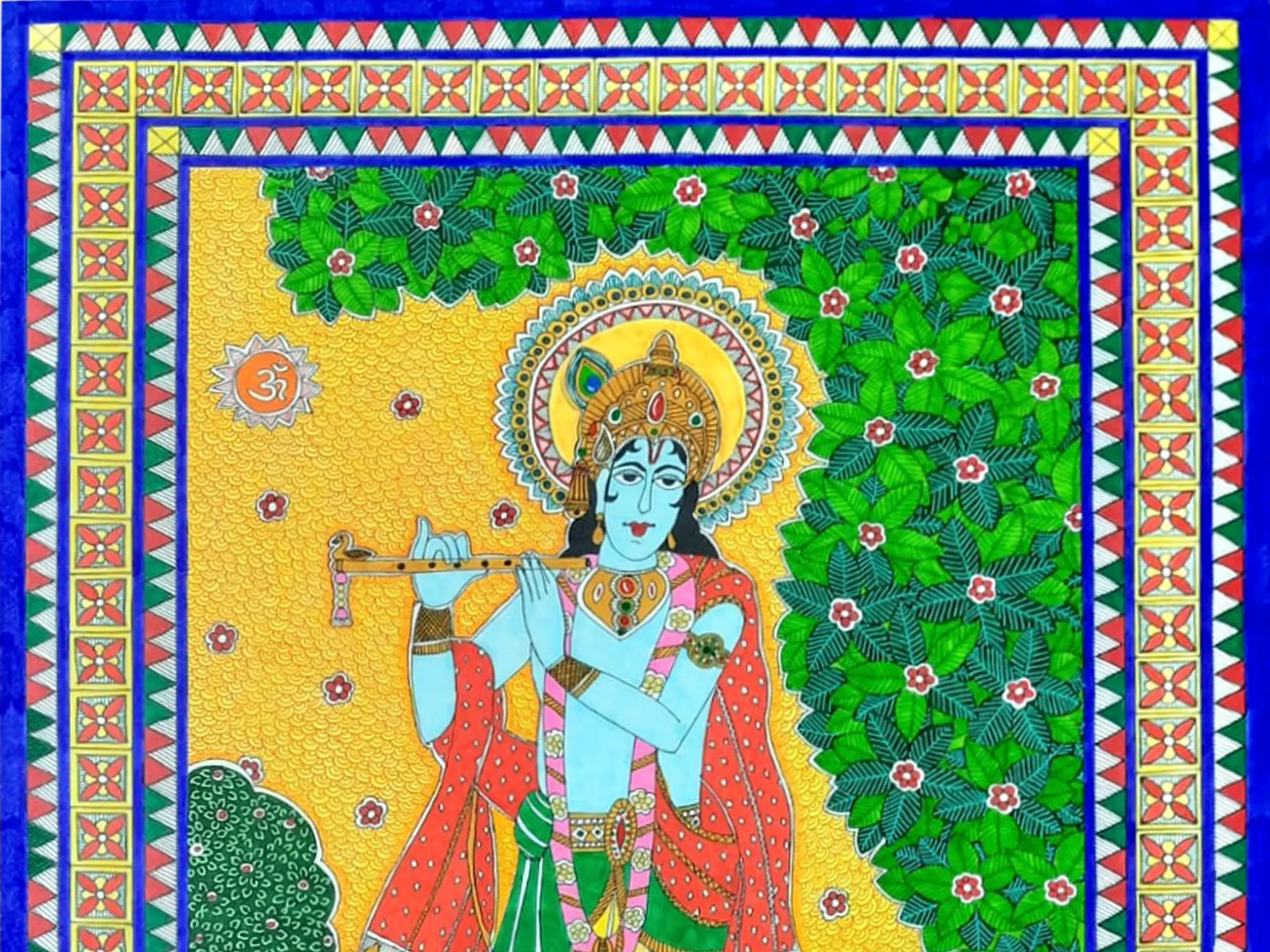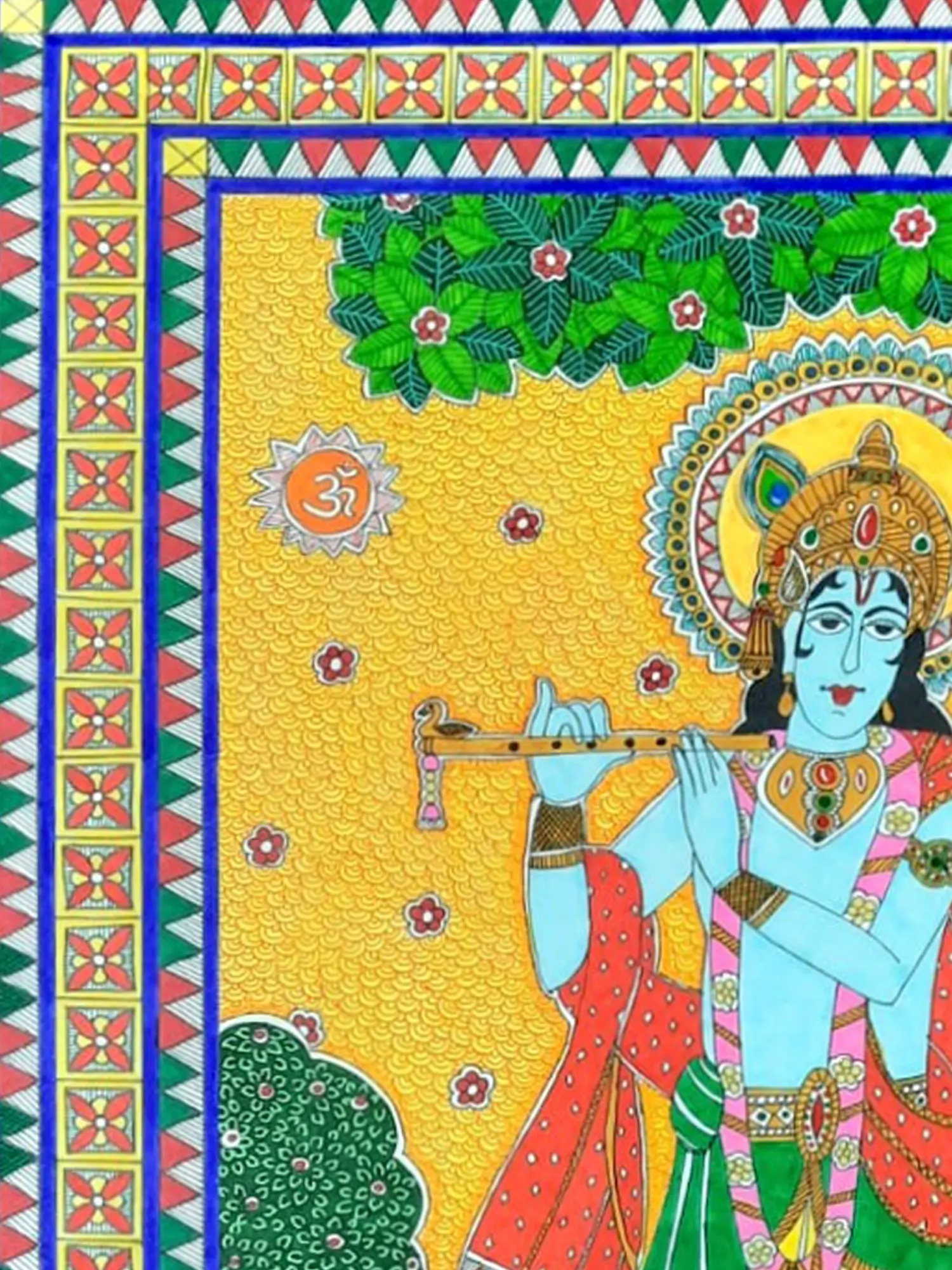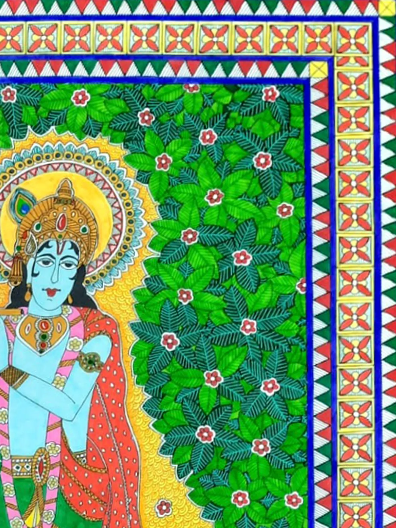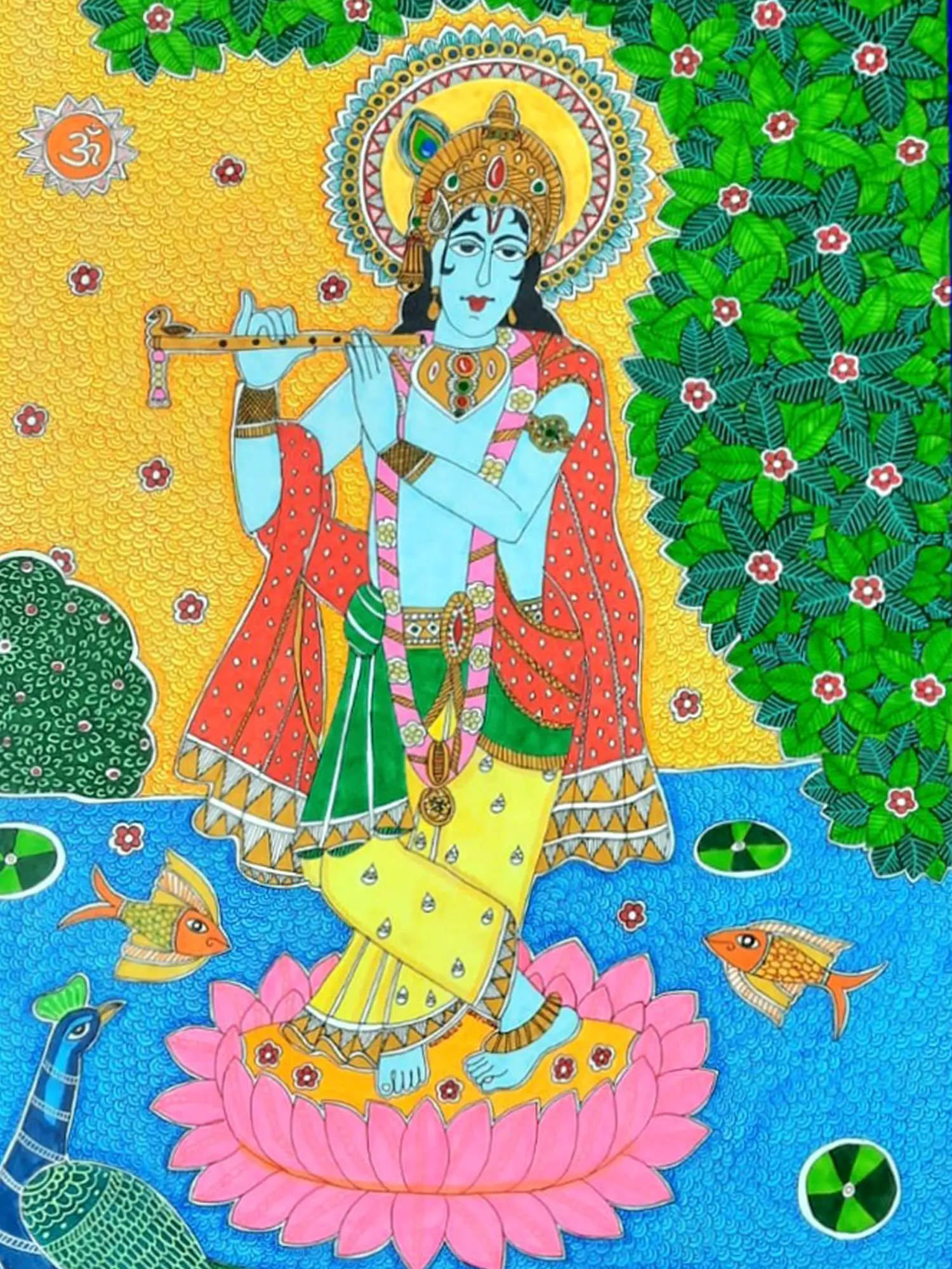 In this mesmerising rendition, Shri Krishna emerges as “Murlidhar,” the divine flutist, enchanting souls with celestial melodies. Enthroned upon a lotus in the tranquil embrace of a pond, Murlidhar orchestrates nature’s symphony, his form adorned with the grace of “Natvar asana.” Lush greenery envelops the scene, a testament to life’s abundance and vitality, while the majestic peacock dances in reverence to the cosmic maestro.