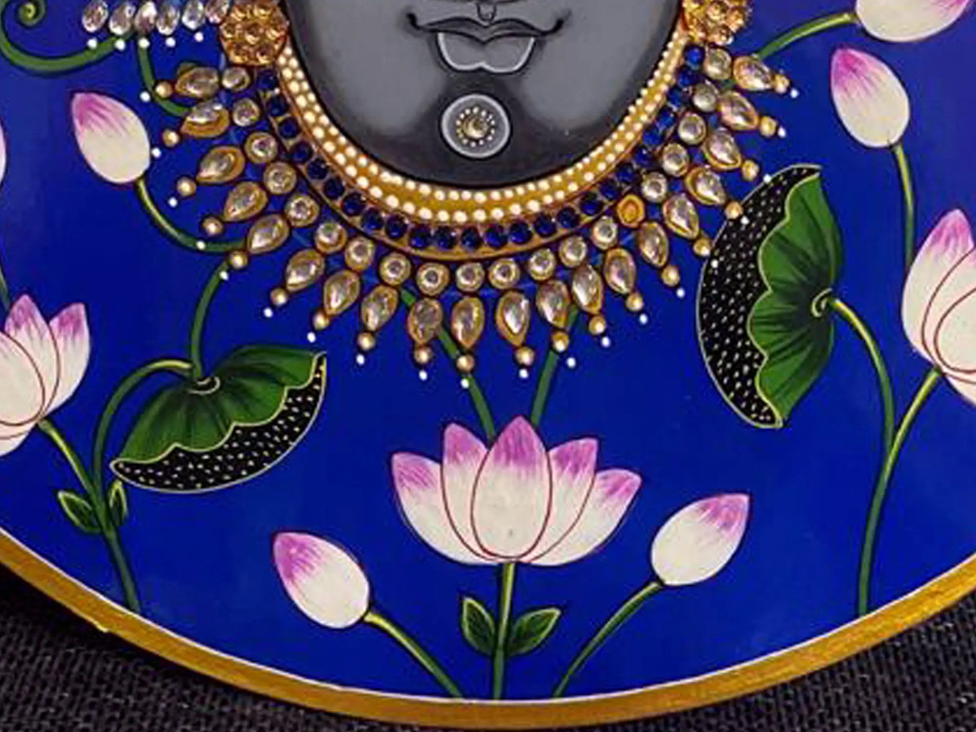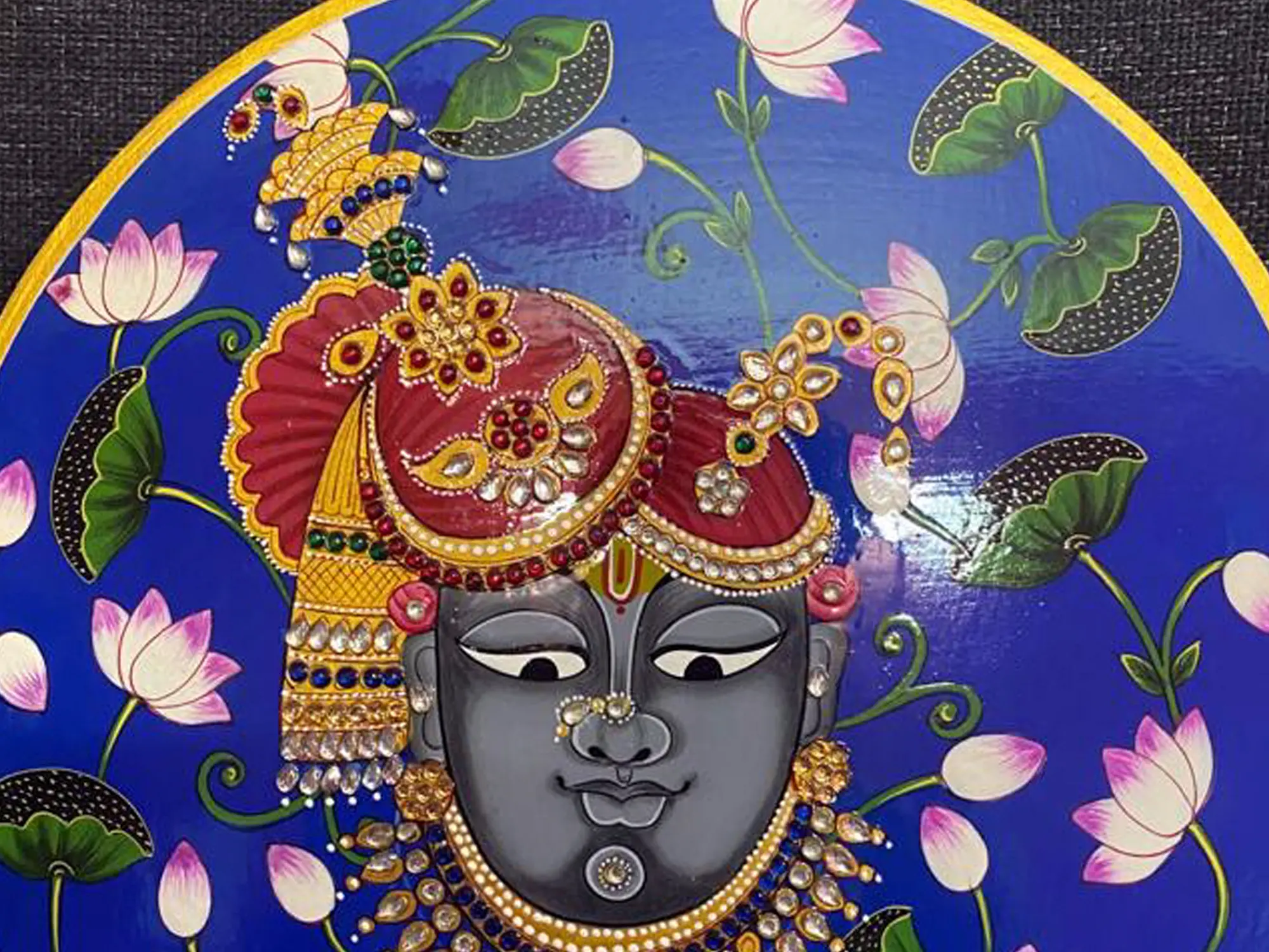 This artwork will charm your spirit as you go on a magical journey. Forged meticulously upon Wood MDF (Medium-density fibreboard) by Jagriti Bhardwaj, this sacred portrayal of “Bhagwan Sri Krishna” in the form of “Bhagwan Shrinathji” embodies grace, purity and prosperity.