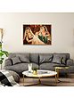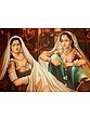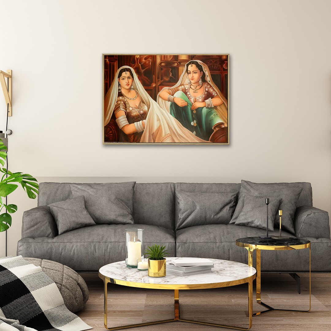 As if pausing from a hectic day, the two beauties dressed in traditional Indian garments sit in relaxed poses. Both of them possess alluring womanly charms, beautified by traditional ornaments and delicate clothes. A pot of water lies in a corner of the canvas. In the background of this oil painting are walls decorated with exotic motifs. Beautified by the two ladies, this painting is a reminder of the importance of leisure and recess in our busy lives.