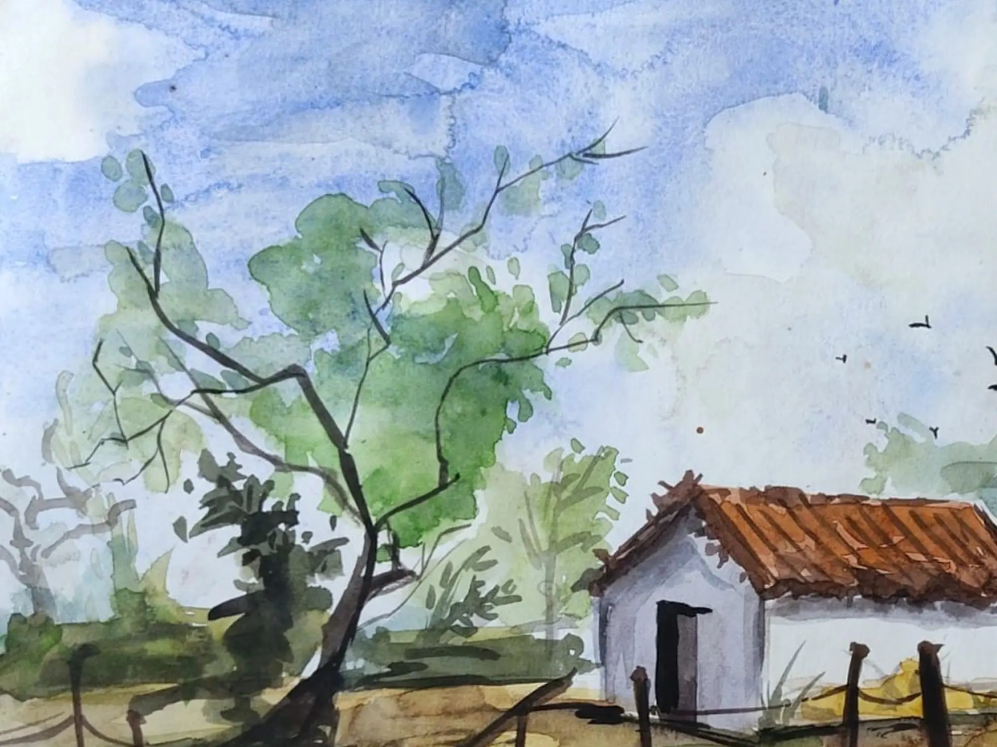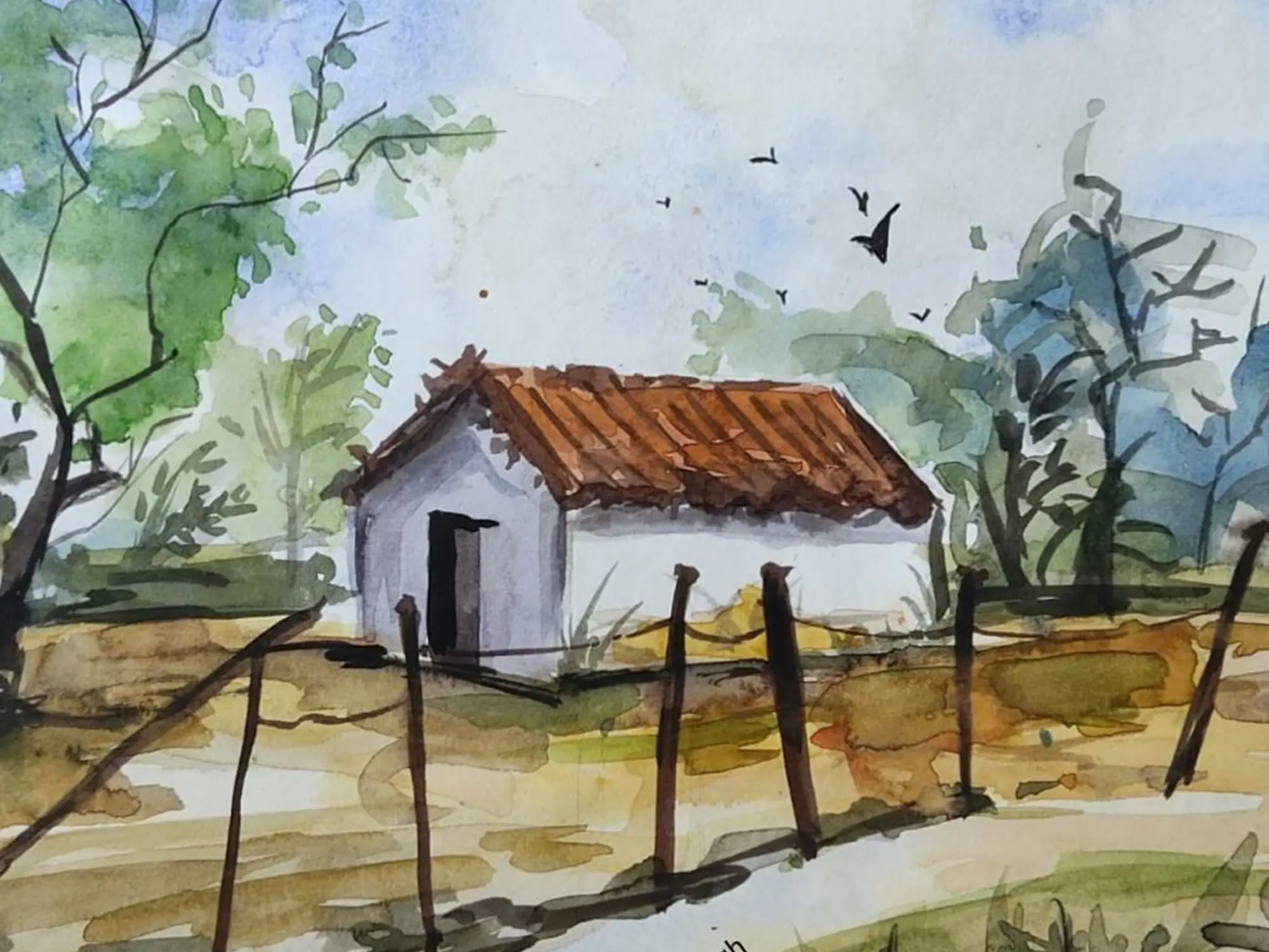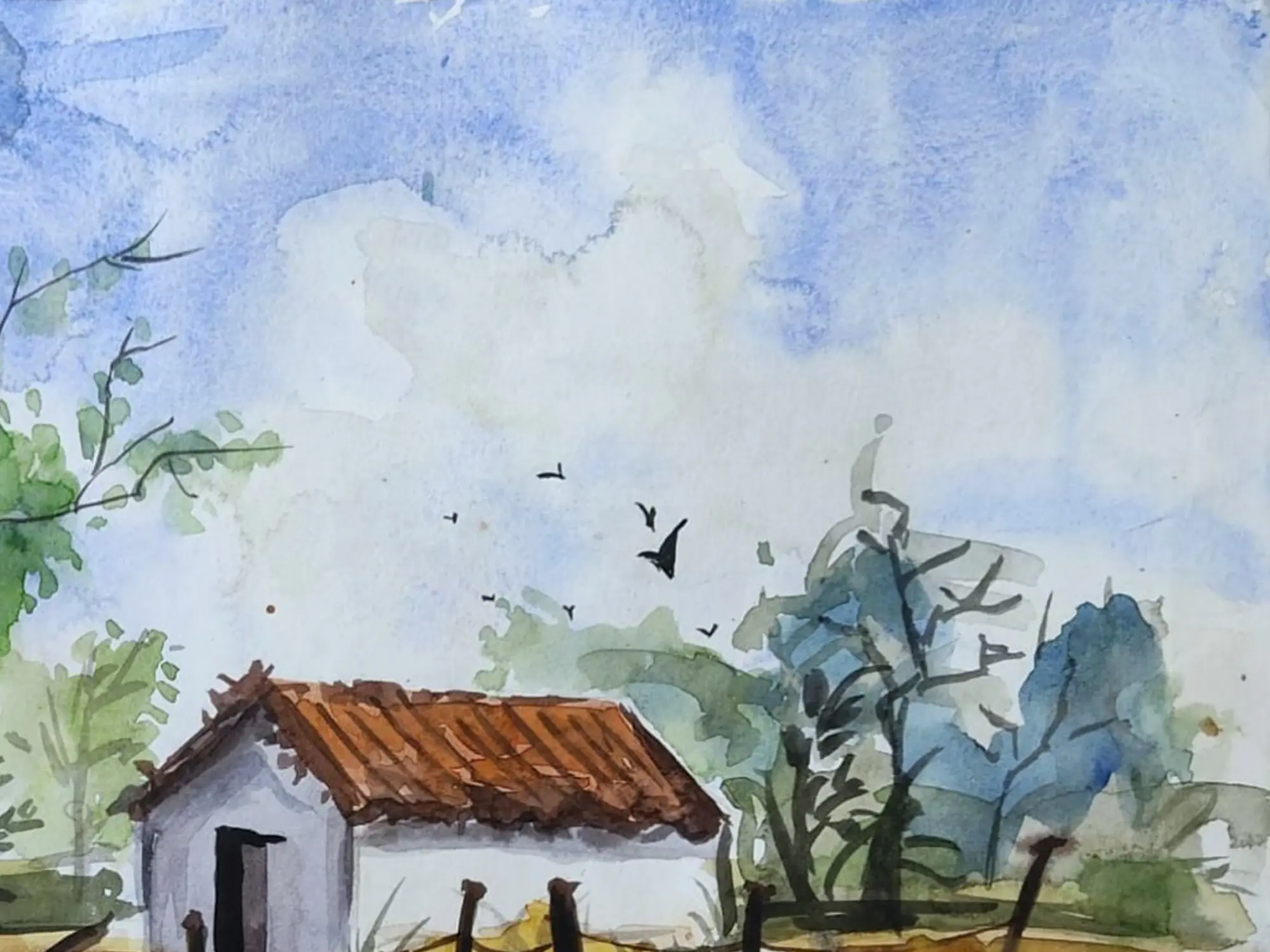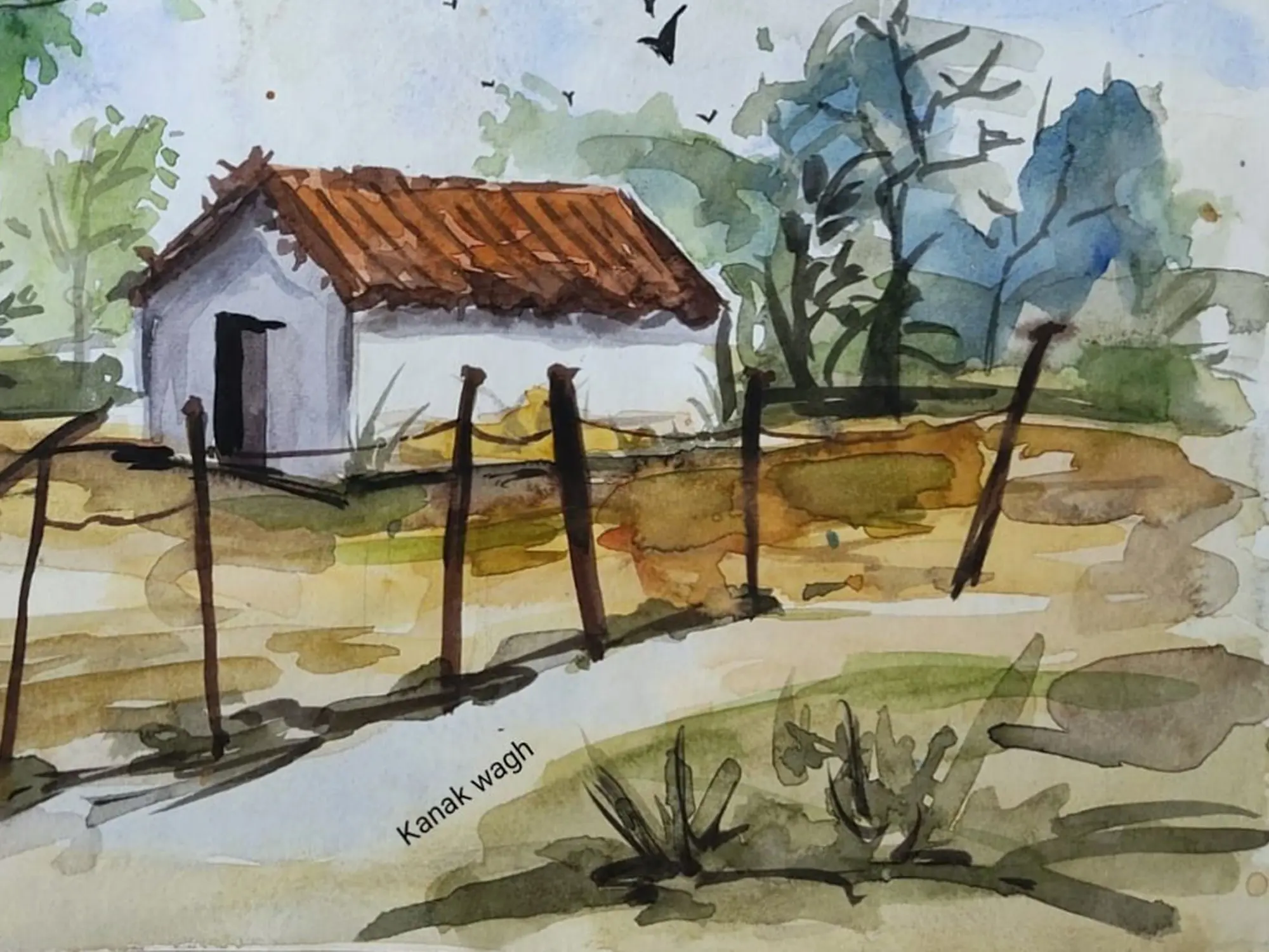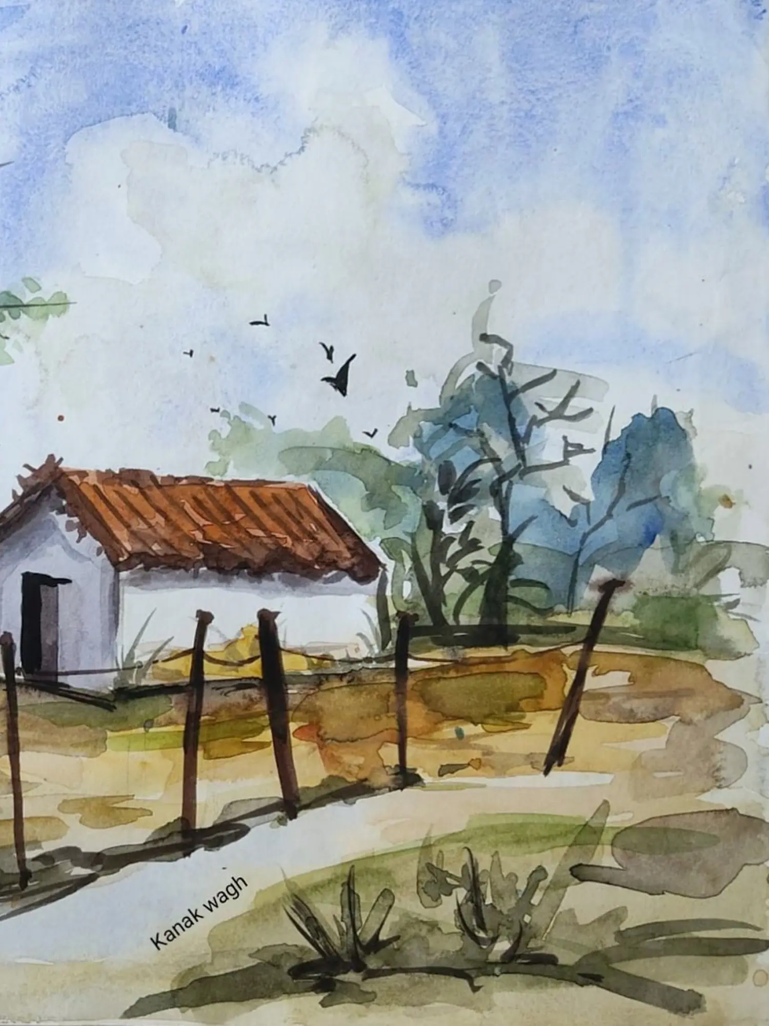 Journey to the heart of rural settings with "Village Landscape," a captivating watercolour painting that captures the beauty of countryside serenity. Rolling greens and quaint cottage dot the landscape, while lazy streams meander through fields of golden wheat. The artist's delicate brushwork and soft palette evoke a sense of nostalgia and warmth, inviting viewers to lose themselves in the idyllic charm of pastoral life.