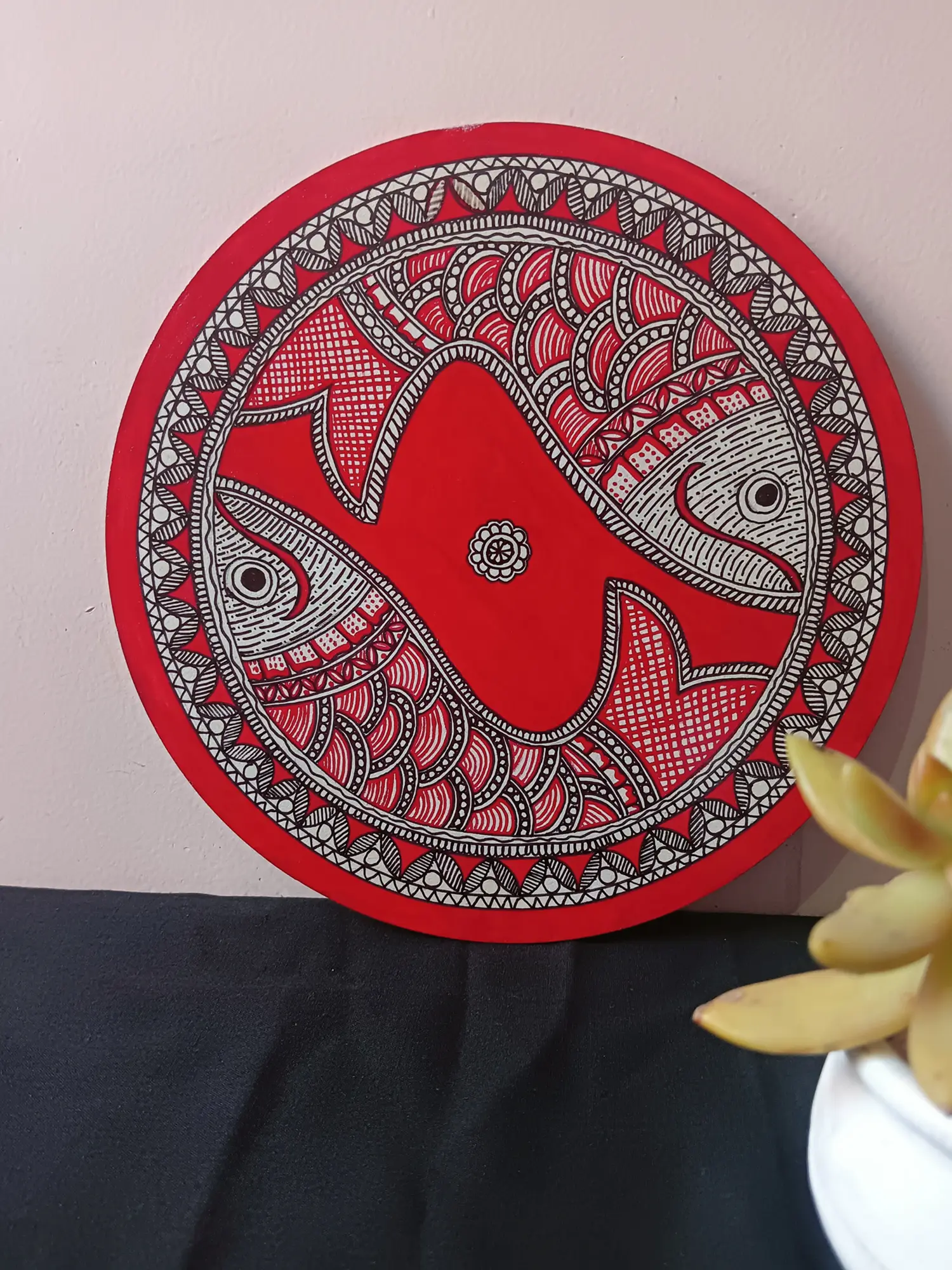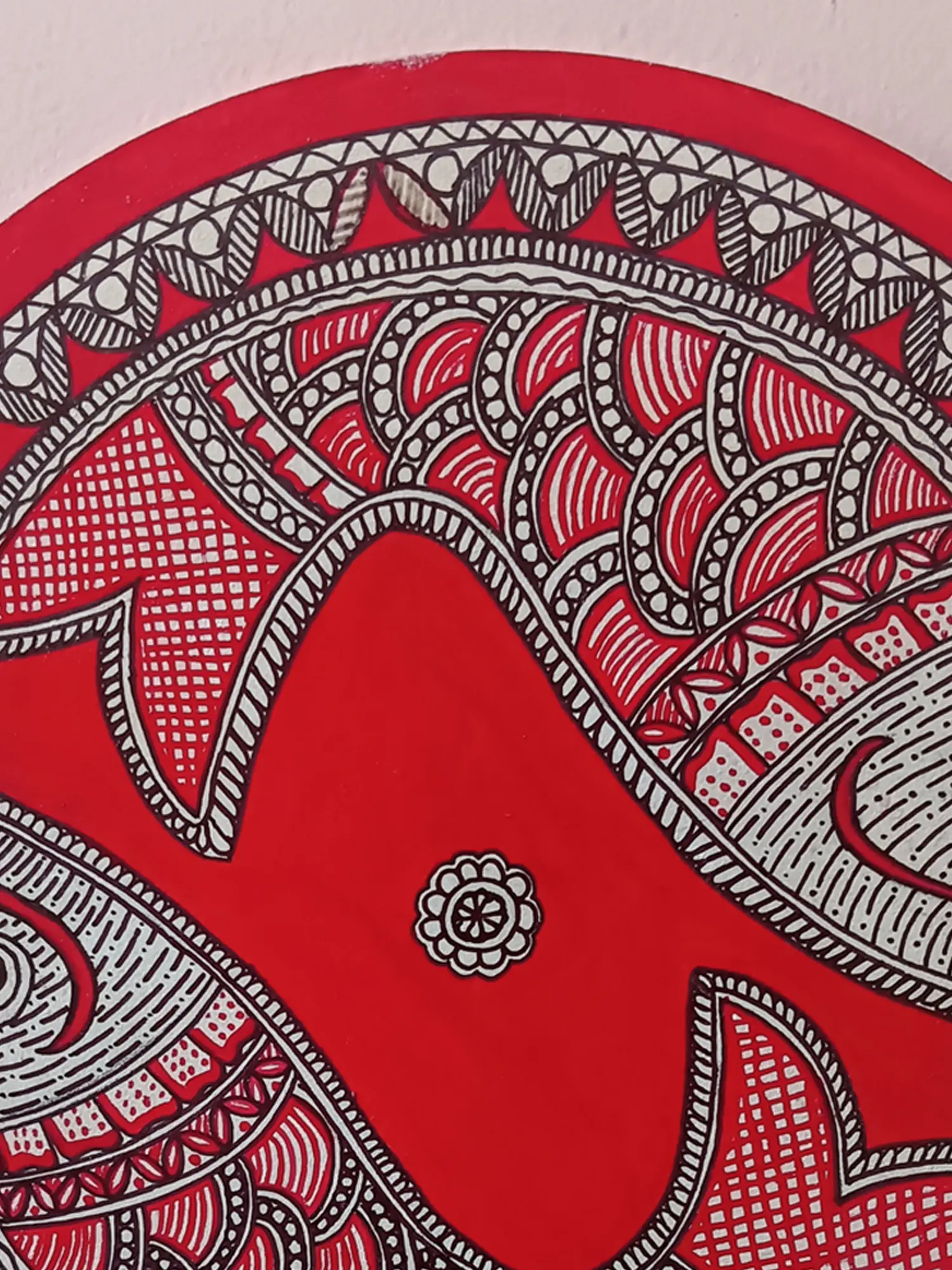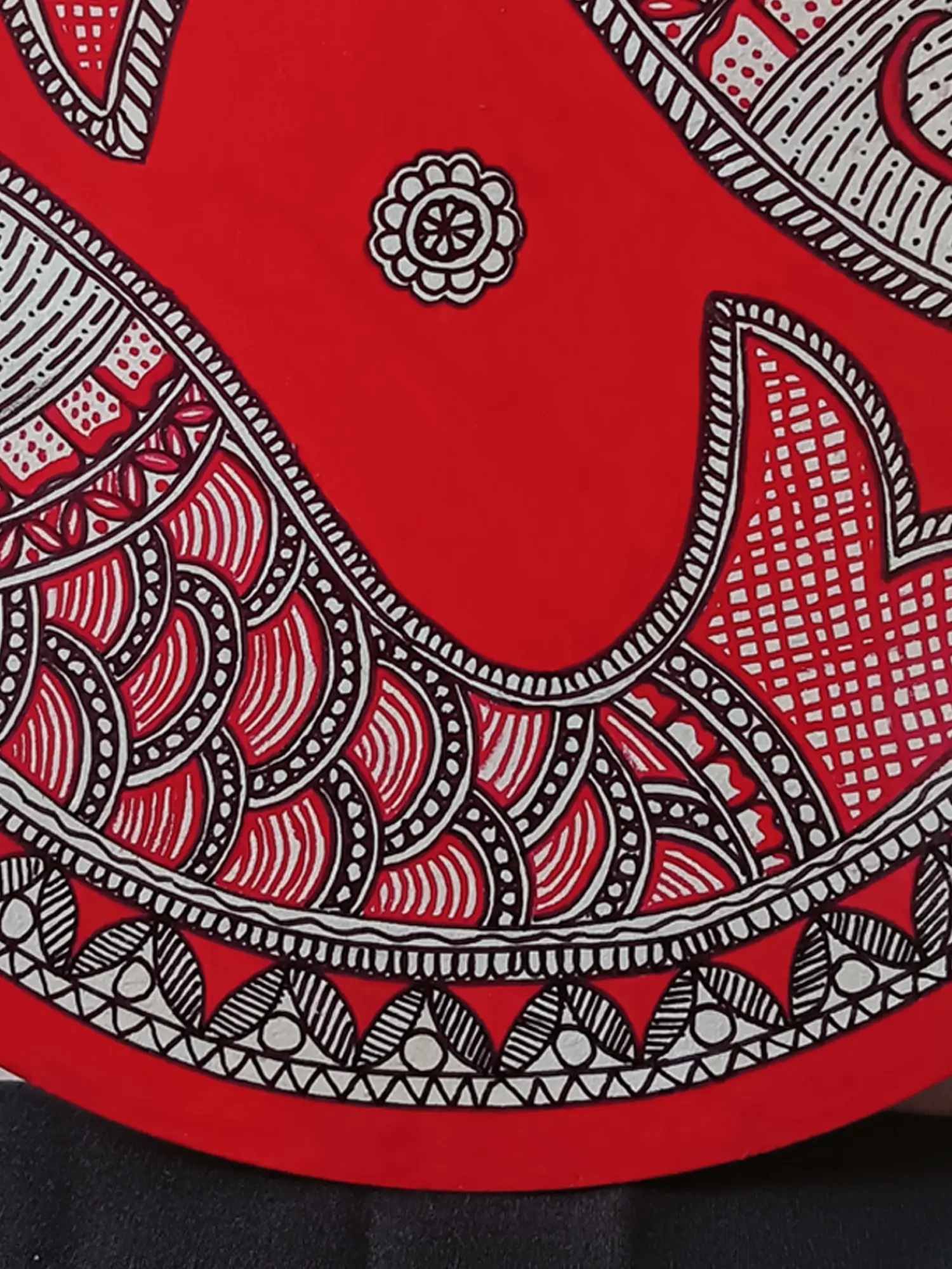 Rina Patwa's "Pair of Fish" on Acrylic and MDF Board is a captivating artwork that exudes beauty and balance. Against a rich dark red background, a pair of fish gracefully follows each other, forming a harmonious yin-yang figure. Rendered in contrasting white and black colors, the intricate detailing and fluid lines enhance the visual appeal.