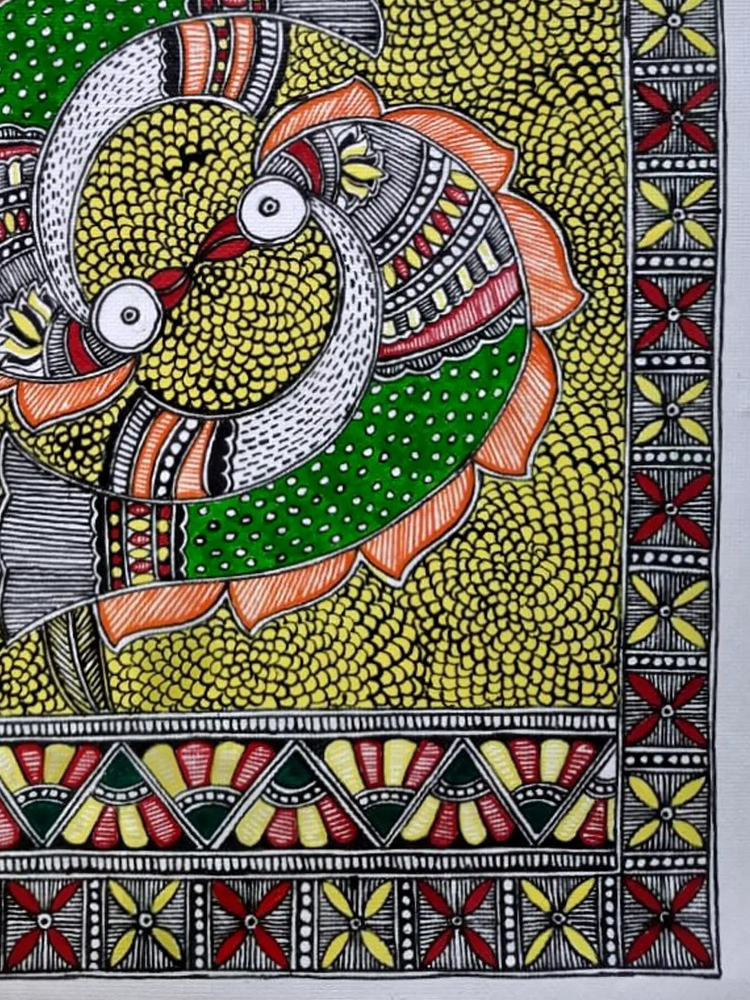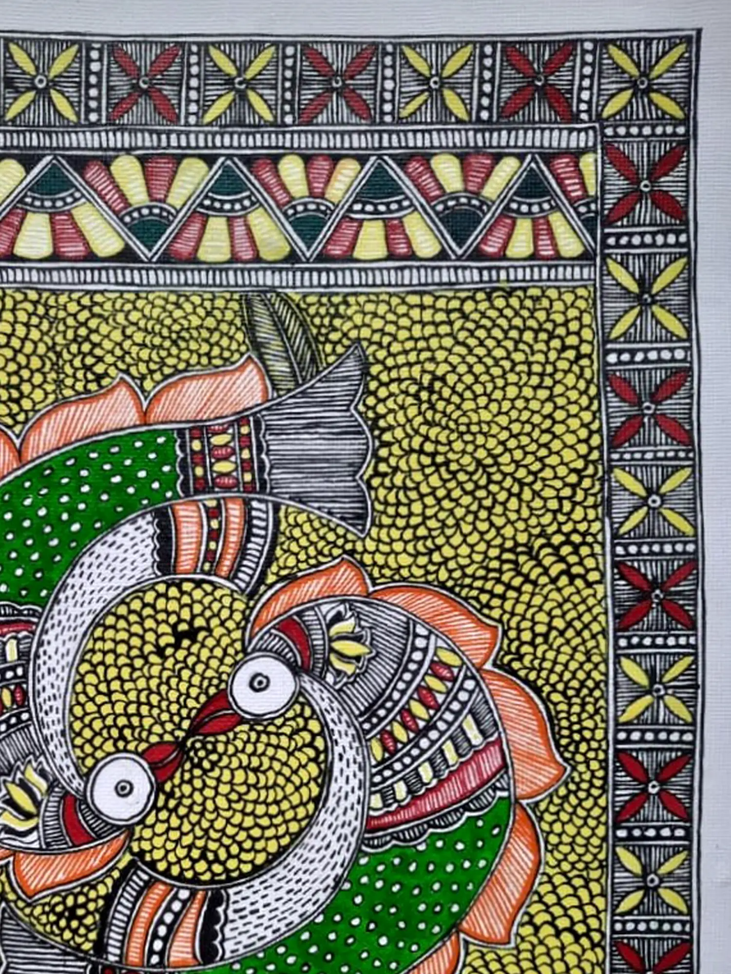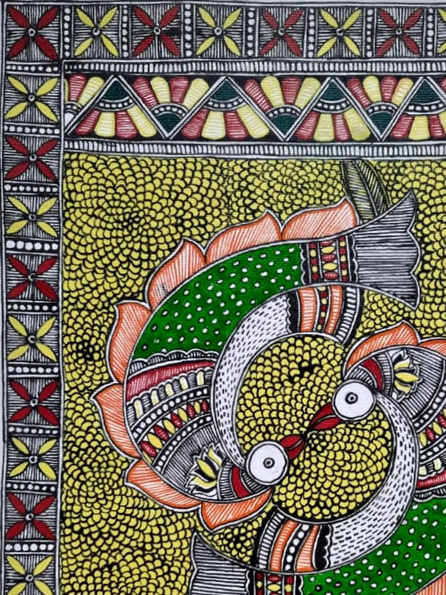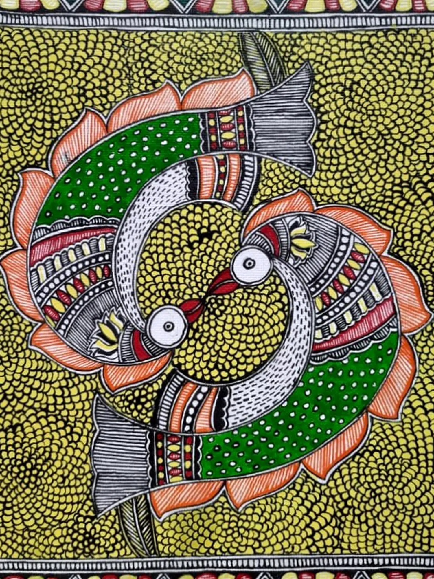 The composition features two stylized fish, rendered in striking shades of green and accented with fiery orange and crisp white. Their forms interlock in a graceful embrace, surrounded by a mesmerizing backdrop of meticulously applied yellow dots, reminiscent of sun-drenched water or fertile earth. Intricate geometric borders, adorned with patterns in red, yellow, and green, frame the central motif, adding depth and visual intrigue. The delicate white eyes of the fish seem to hold a spark of life, drawing you deeper into the narrative.
