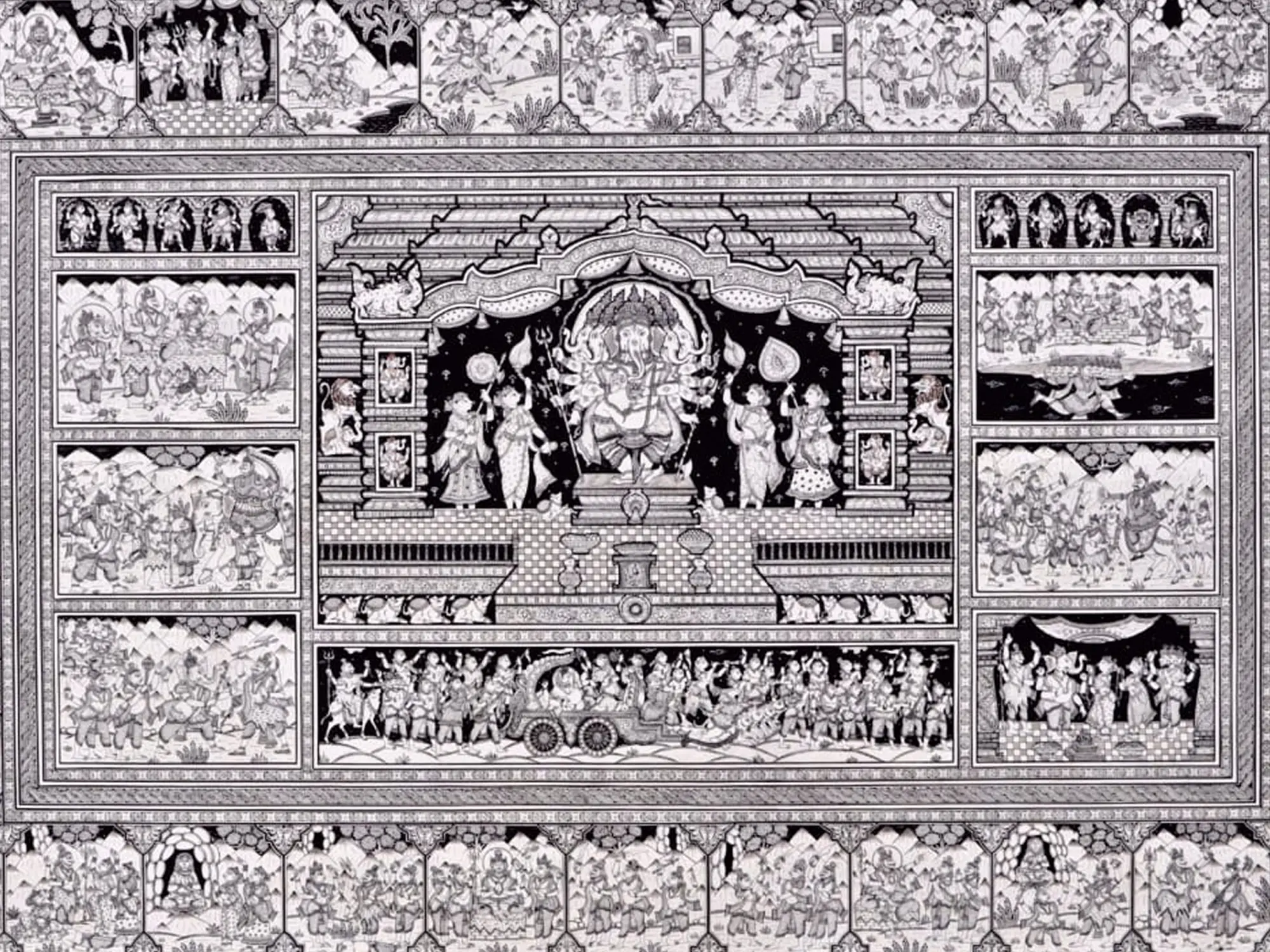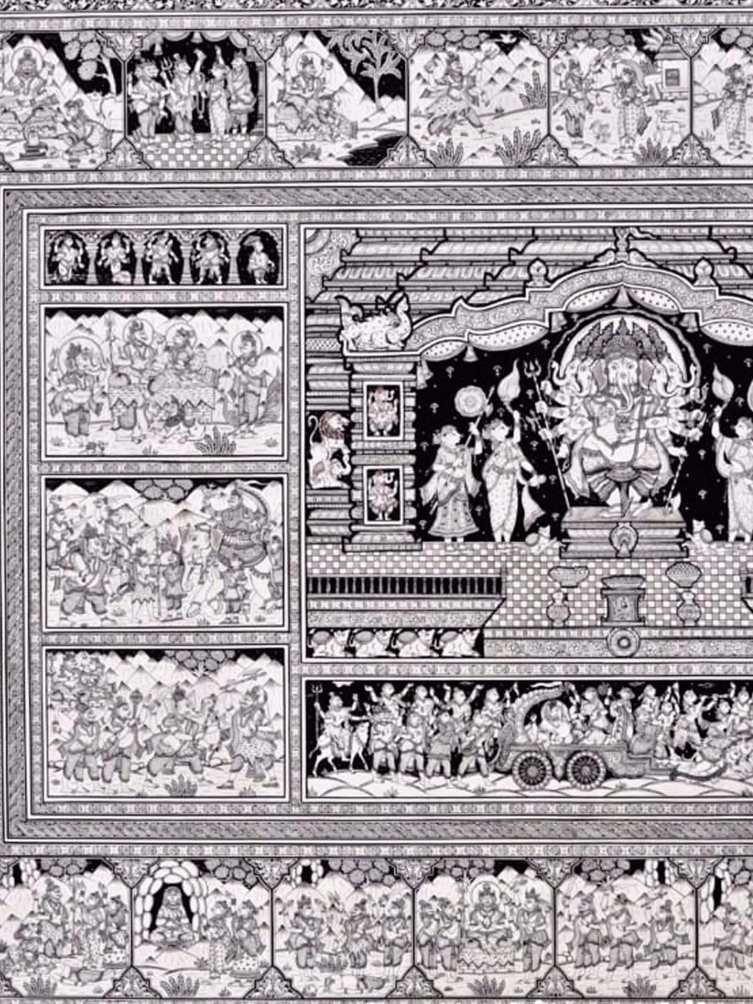 This work draws deeply from the rich tapestry of Hindu mythology, specifically celebrating the multifaceted form of Panchamukhi Ganesha, the five-faced elephant-headed deity. Each panel reveals a scene, potentially illustrating his various aspects, divine powers, or significant episodes from his celestial journeys. The intricate detailing and the storytelling embedded within its structure connect you to a timeless cultural heritage and spiritual wisdom.