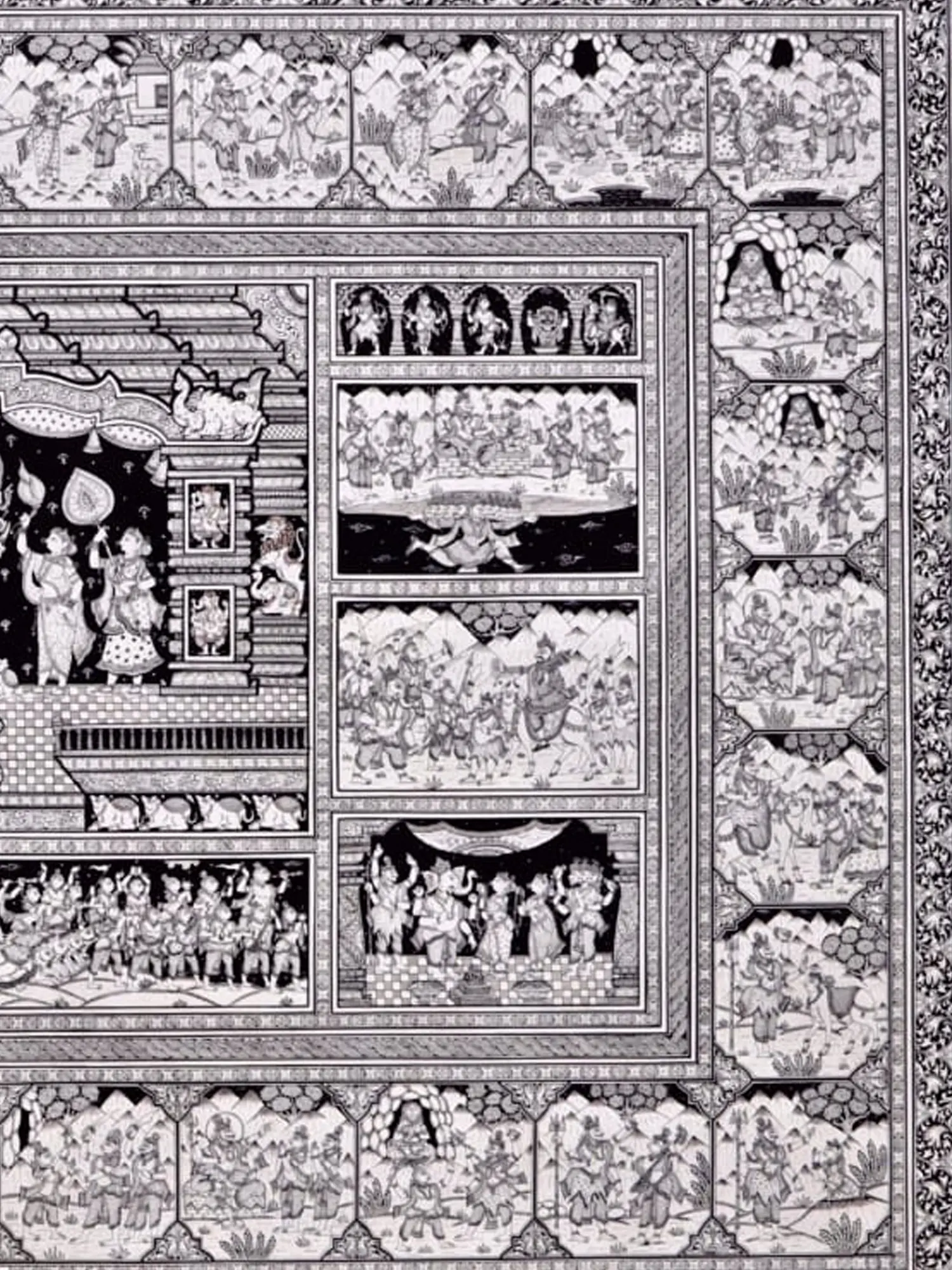 Measuring an impressive 36.00 inches in height and 60.00 inches in width, this expansive artwork draws the eye with its intricate composition. The central motif, a commanding depiction, is framed by a series of narrative vignettes that encircle the entire piece. You'll appreciate the delicate rendering of figures and the subtle interplay of light and shadow, all achieved through the painstaking application of natural pigments, creating a rich texture that adds depth and character.