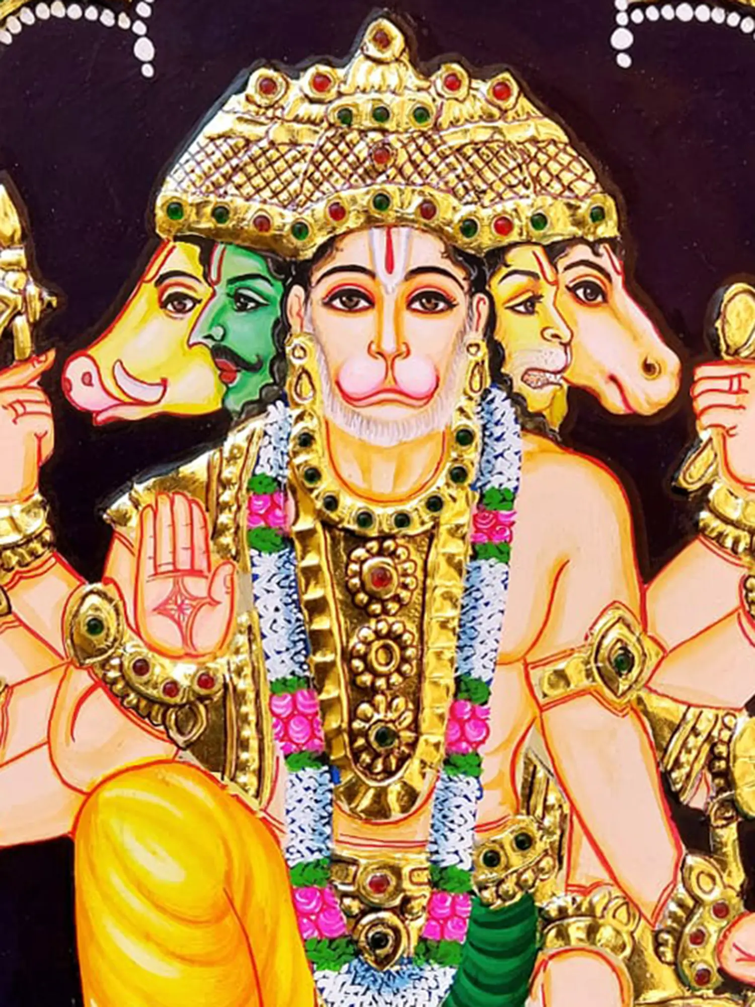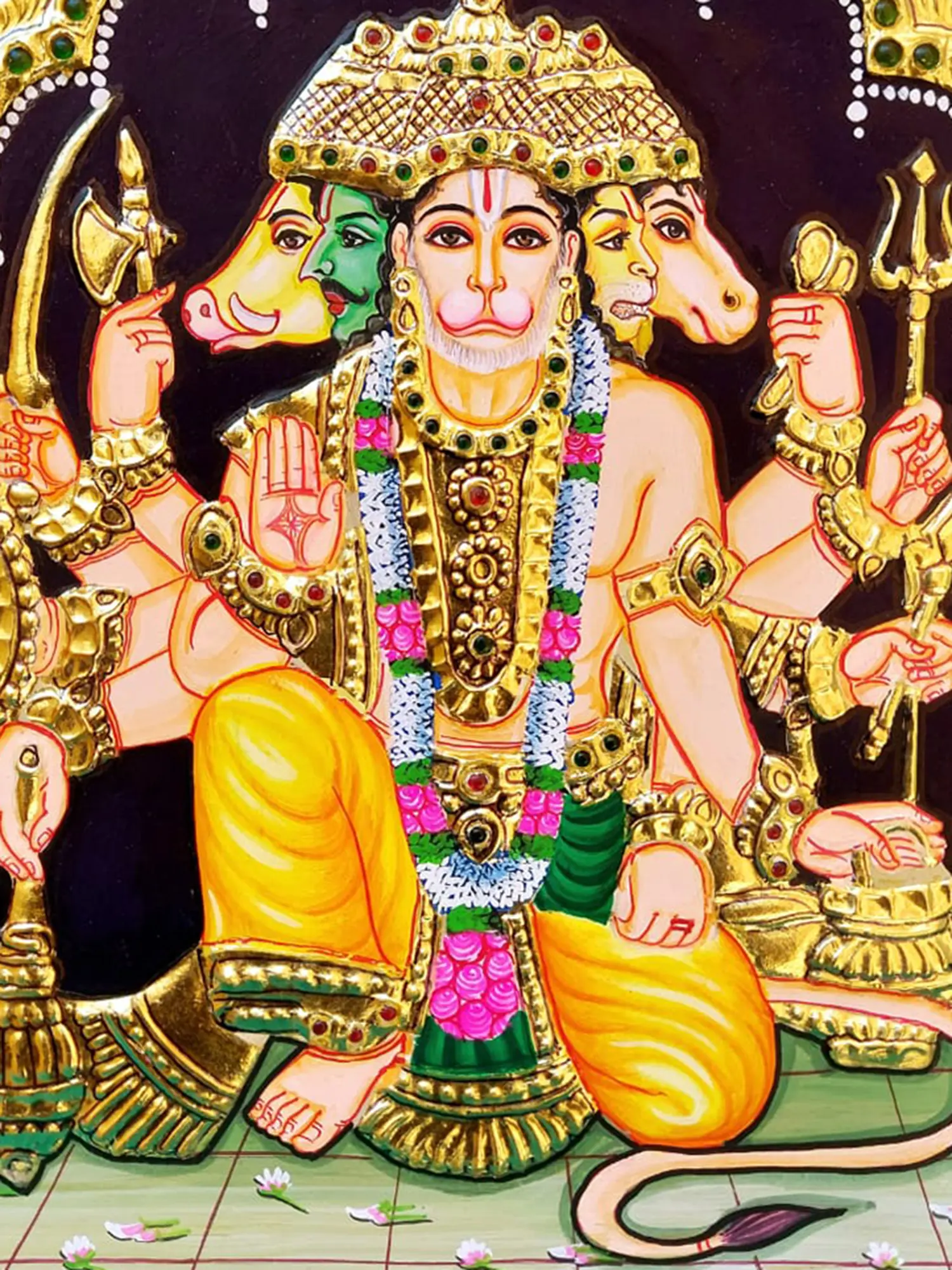 A rich gold work complemented by sacred yellow has made this Tanjore painting of Panchamukhi Hanuman divine.