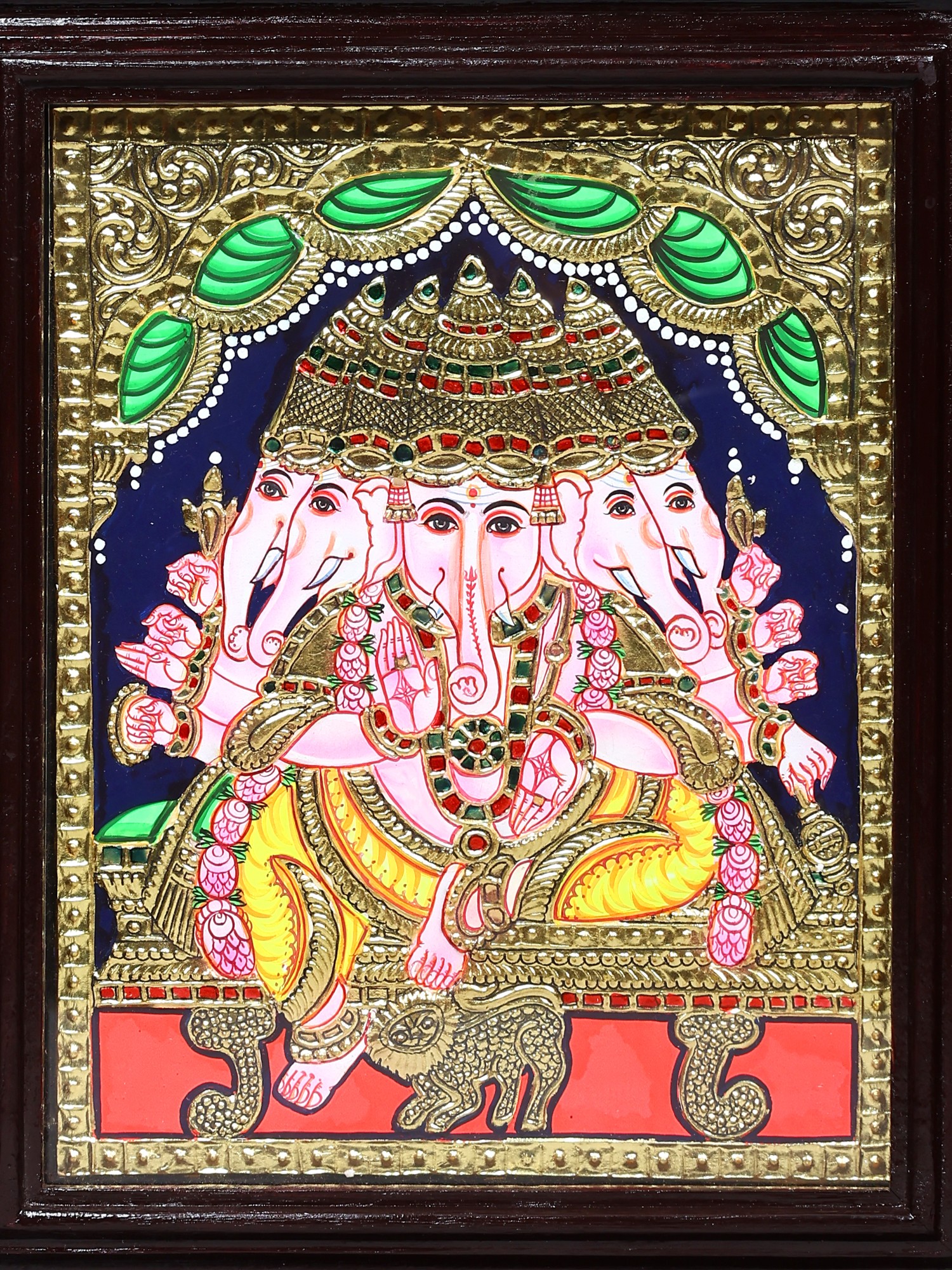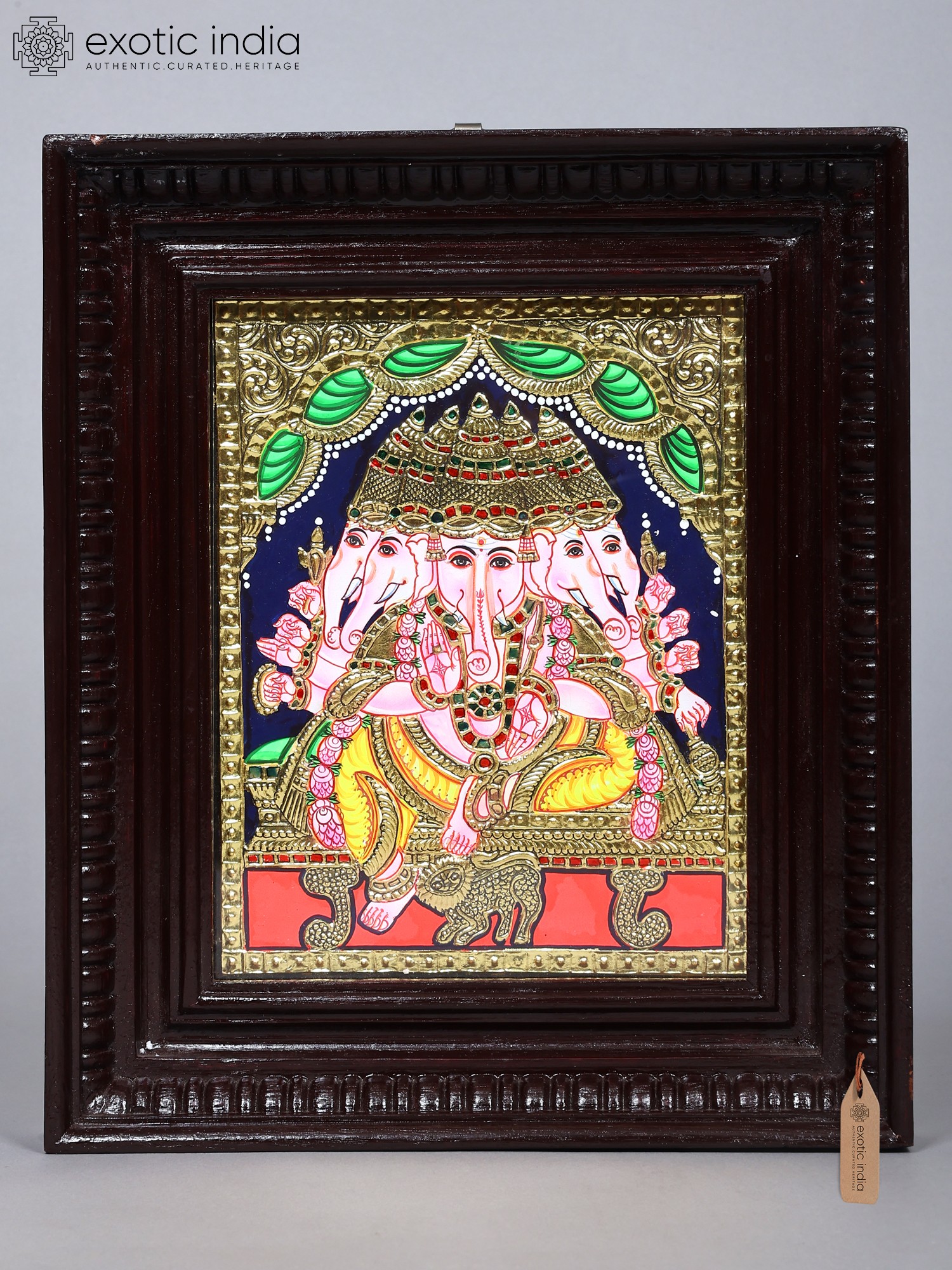 The Panchmukhi Lord Ganesha Seated on Throne Tanjore Painting unveils the formidable Panchamukhi Ganesha, adorned regally, with five heads. He stands as the guardian of the Pancakosha, representing the five component layers of the human form, and a protector of his devotees. In this regal artwork, Ganesha sits majestically on a divine throne, embellished with the symbol of a lion (Simha) in the foreground. With ten arms and an aura of celestial radiance surrounding his divine form, this artwork encapsulates the awe-inspiring might and benevolence of Lord Ganesha. It is a powerful symbol of protection and divine blessings, adorning any space with its heavenly presence.