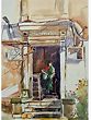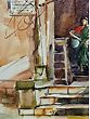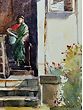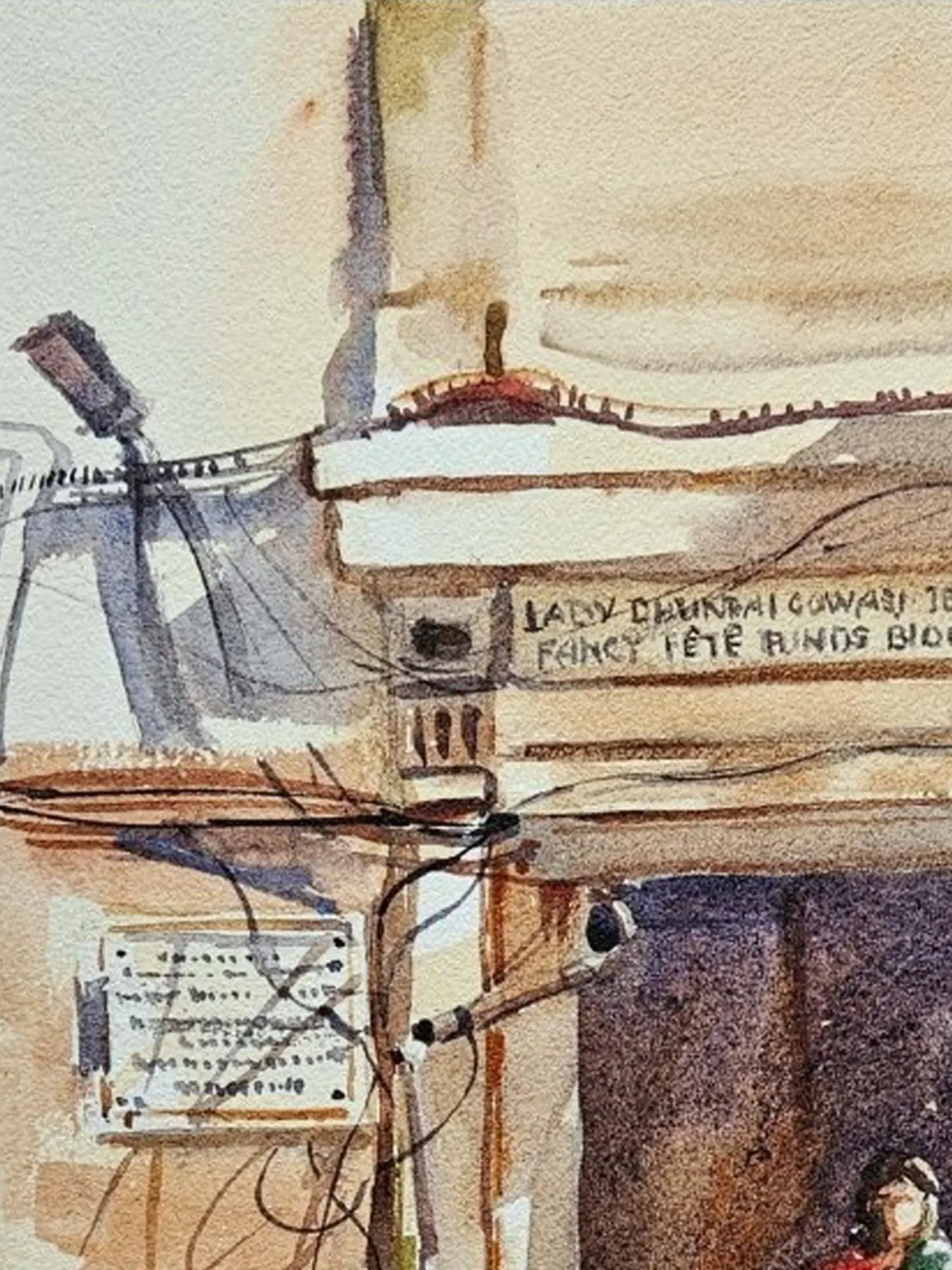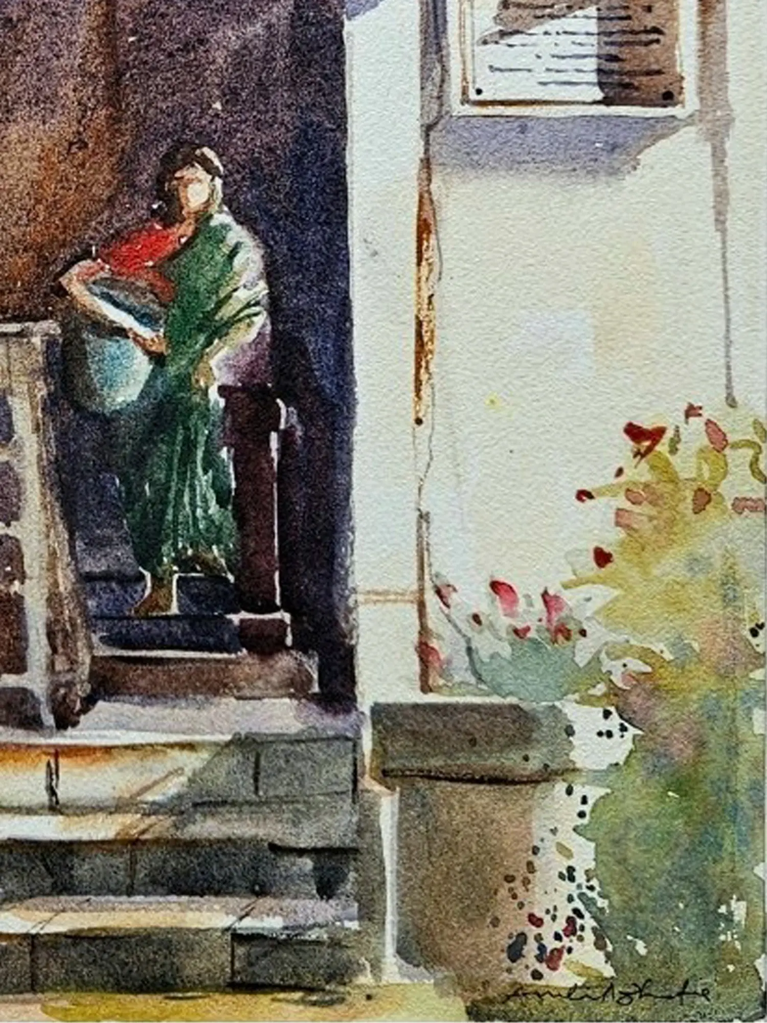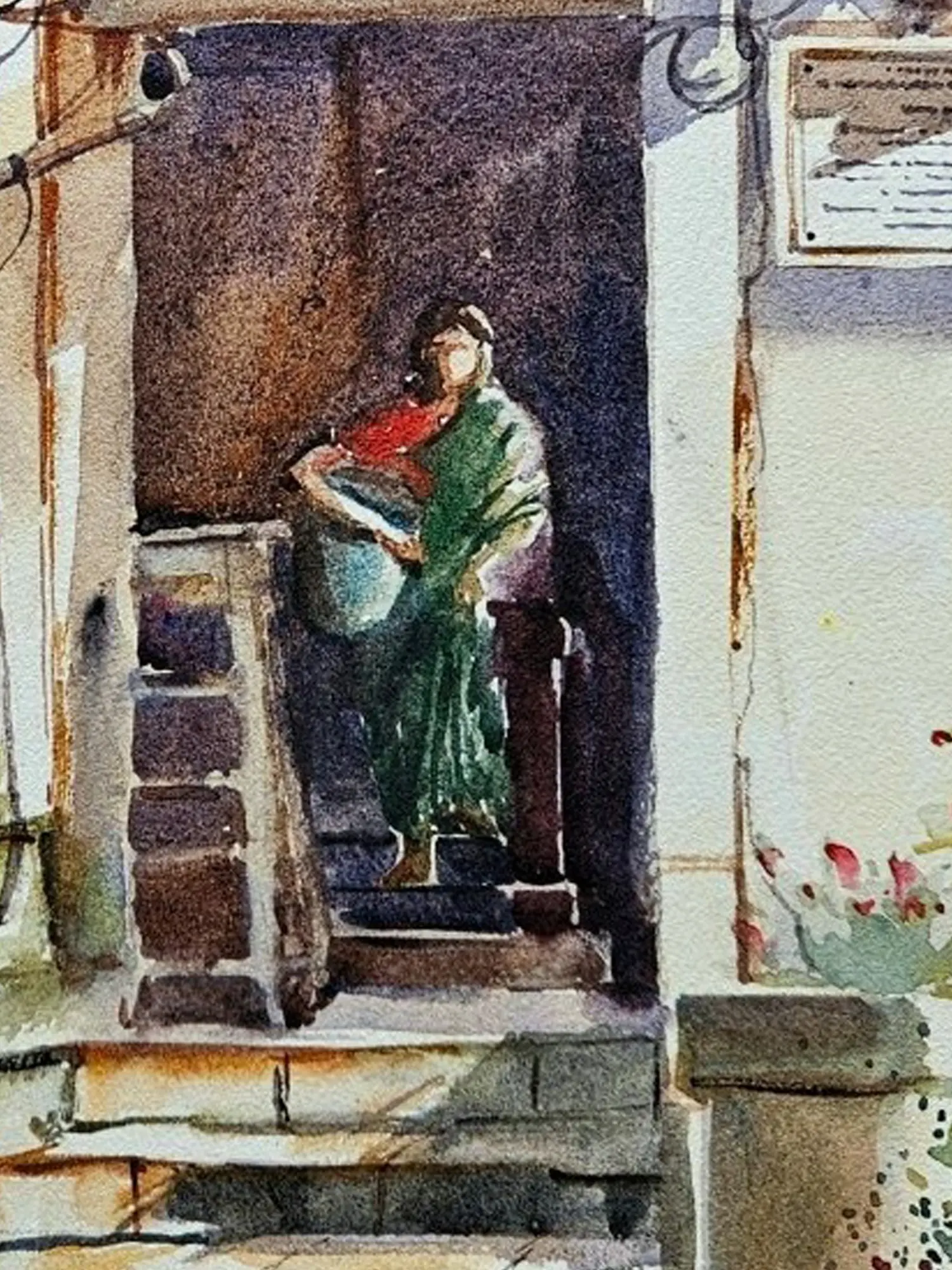 The composition unfolds with a naturalistic grace, measuring 14 inches in height and 10 inches in width. Observe how the artist uses a nuanced palette, favouring earthy tones and soft hues that speak of sun-drenched afternoons and a bygone era. The intricate details of the facade, from the weathered stonework to the gracefully draped fabric of the figure, are rendered with a sensitive touch. You will notice how the loose, expressive lines of the wires overhead contrast with the solid structure of the building, adding a dynamic layer to the visual narrative.