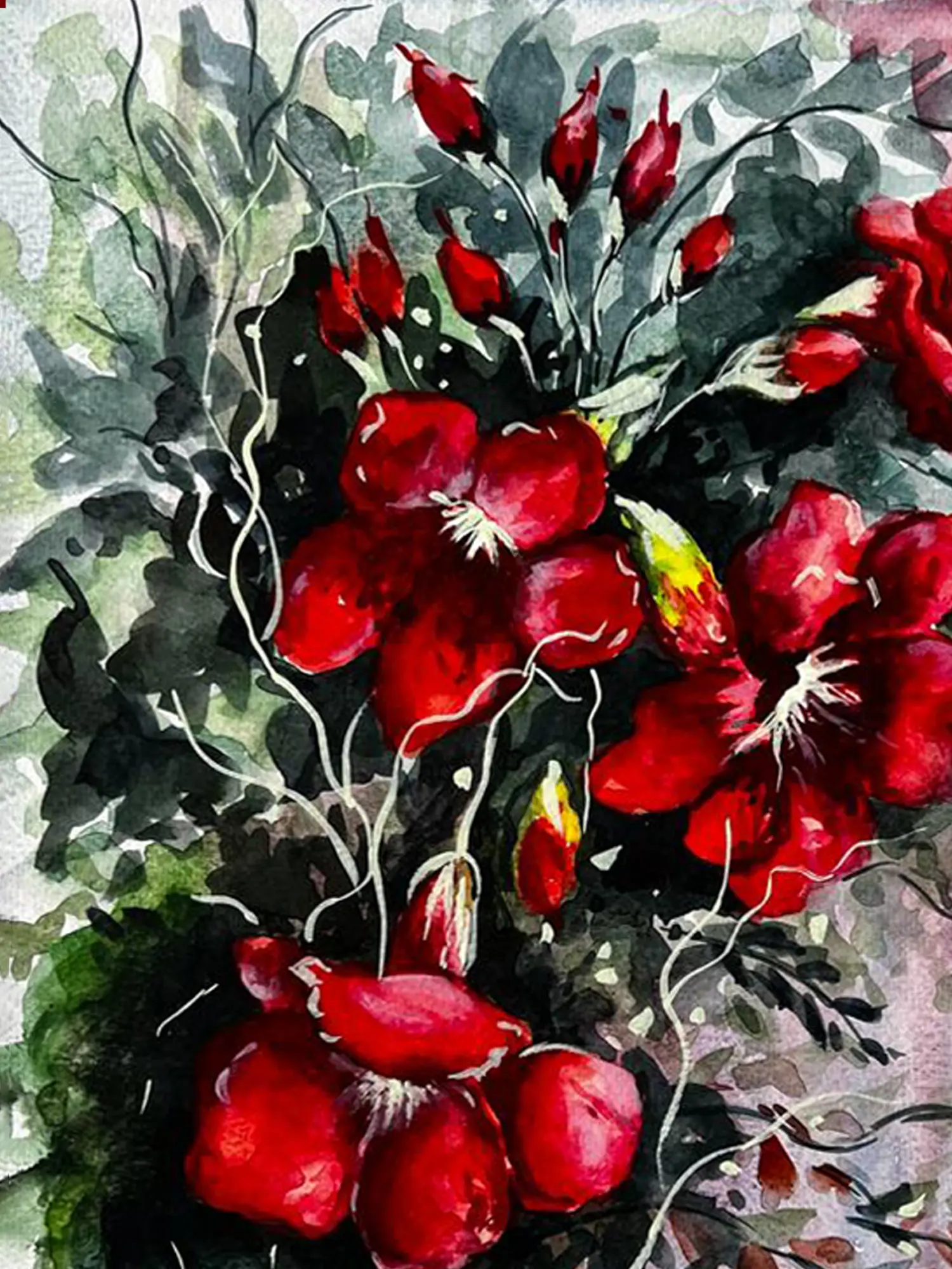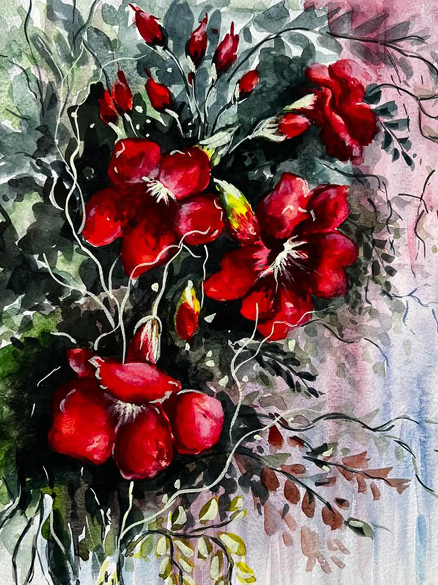Mamta Saxena's watercolor on Canson sheet is an ode to the passion of the red petunia flowers, skillfully employing the painted-on-wet technique. It is believed that the red petunias are a symbol of love and passion. The dramatic scene unfolds as the paint travels across the canvas, creating a fluid and dynamic backdrop.