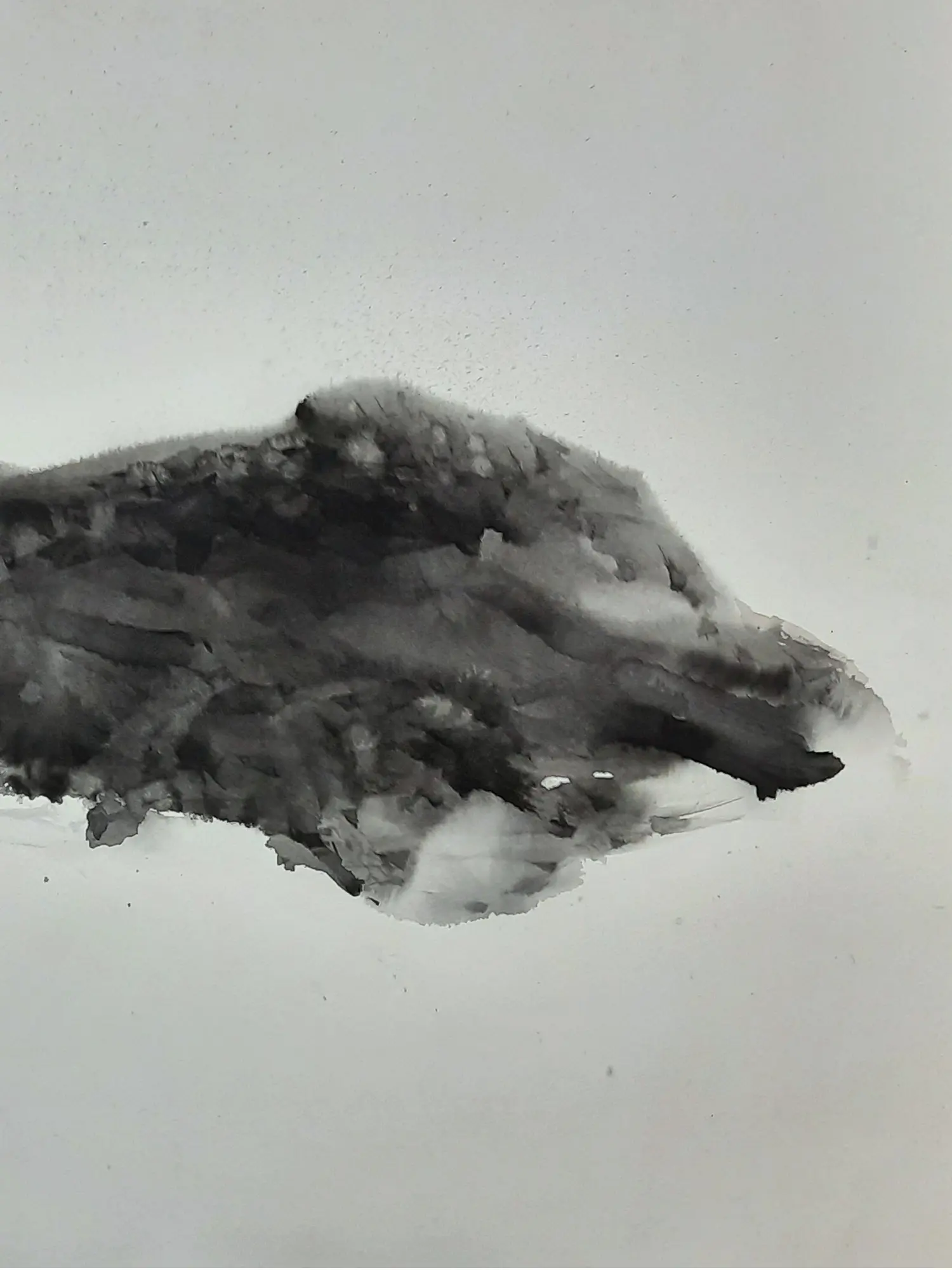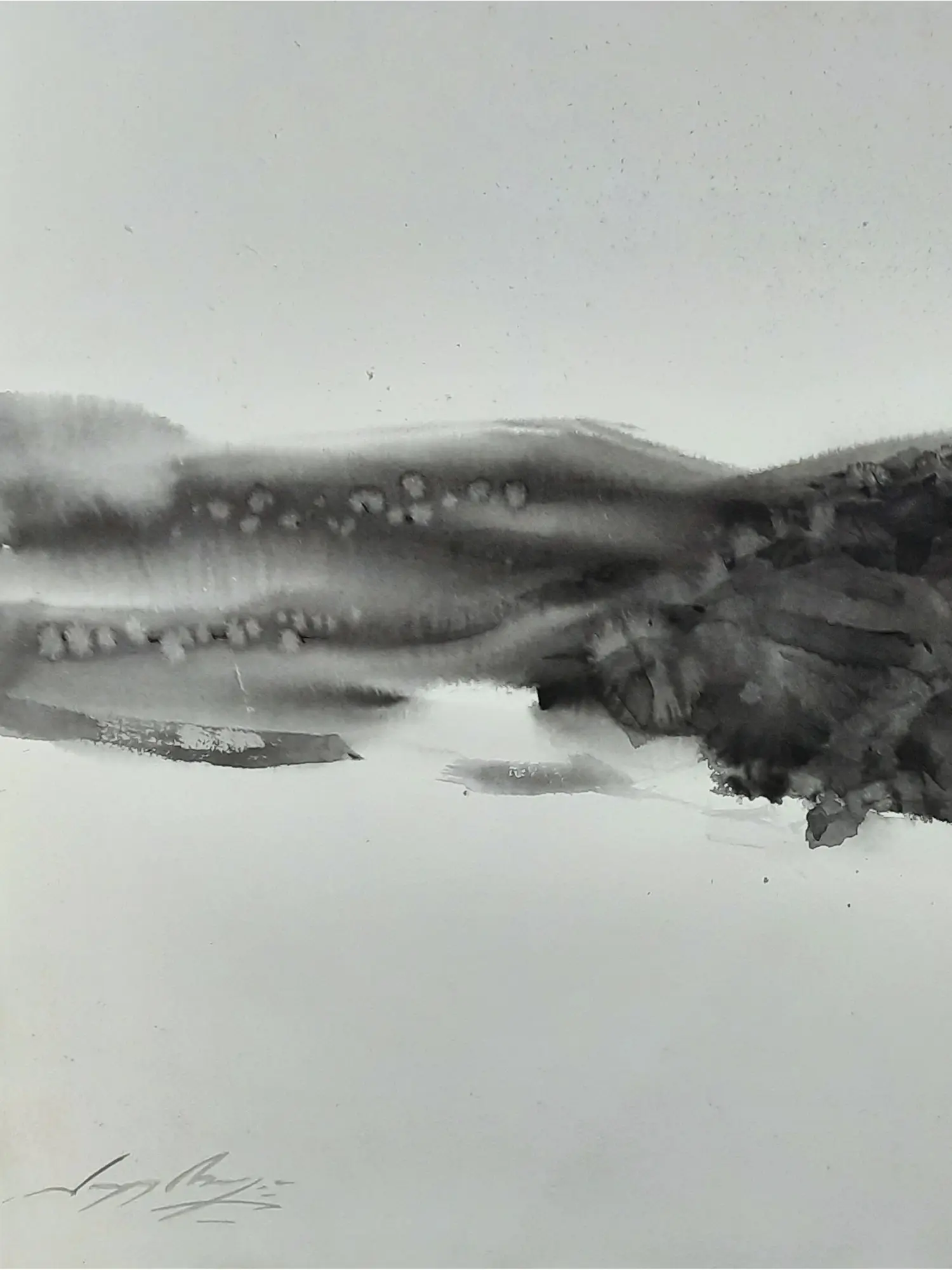 Based on the Sumi-e technique of watercolor (ink on paper) painting this painting titled "Peace of Island" by Sanjoy Banerjee, is a monochromatic masterpiece. Here the landscape has been painted by actually hiding the typical features. The paintings dissolving lines give the landscape a foggy look. Only one object has been defined keeping the broader area blank for the viewer's contemplation. It symbolizes the power of solitude and reflection, inviting viewers to find respite from life's storms. The use of only dual tones allows the beholder to focus on lines and discover the hidden features of the painting.