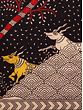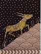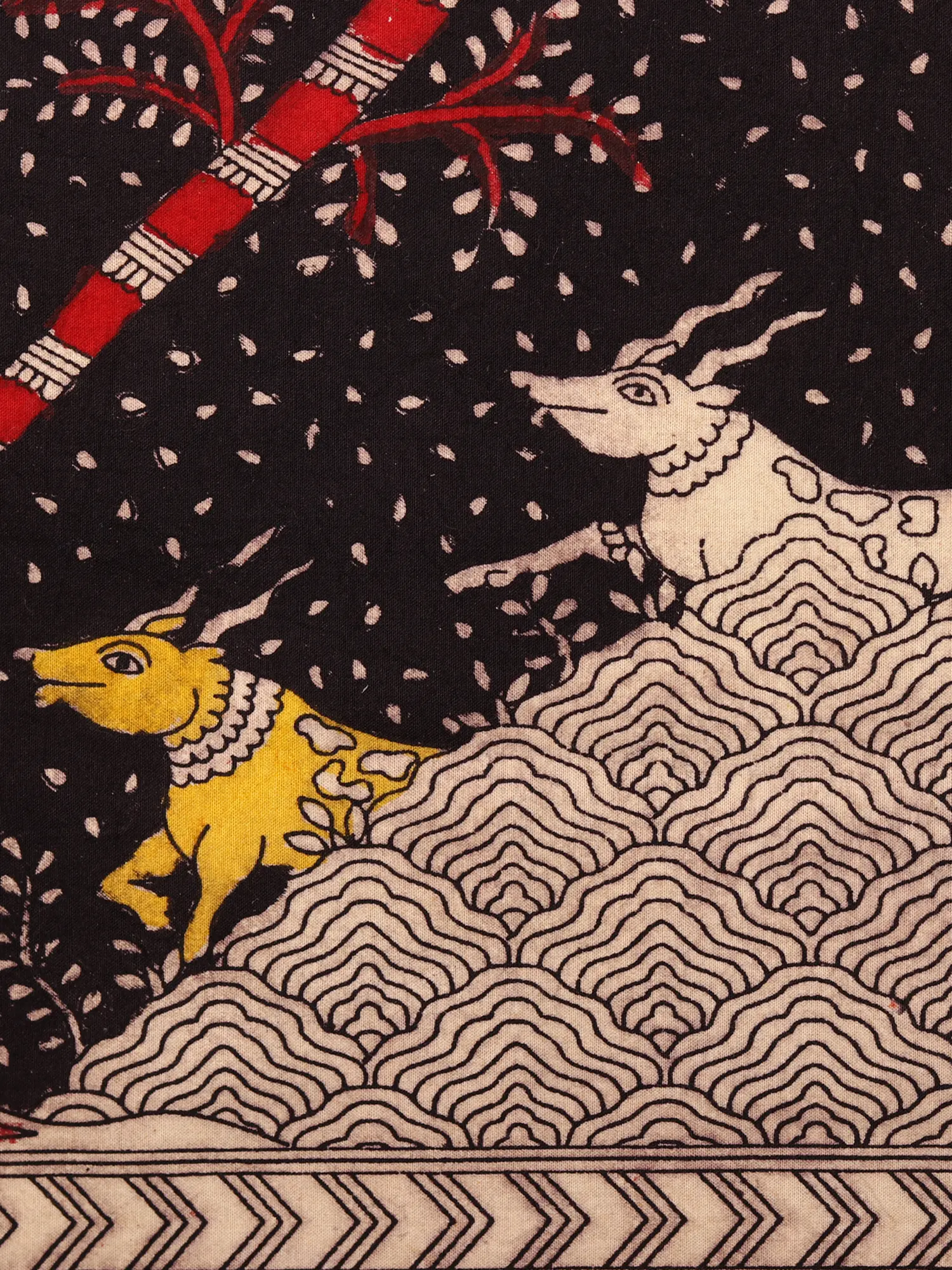 At the base of the tree, three deer frolic amidst stylized hills. In many cultures, the deer symbolizes grace, innocence, and spiritual purity. Their presence in this artwork adds to the feeling of tranquility and balance within the natural world depicted. The deer’s movement suggests a sense of freedom and harmony, reflecting the spiritual aspirations central to the Mata Ni Pachedi tradition.